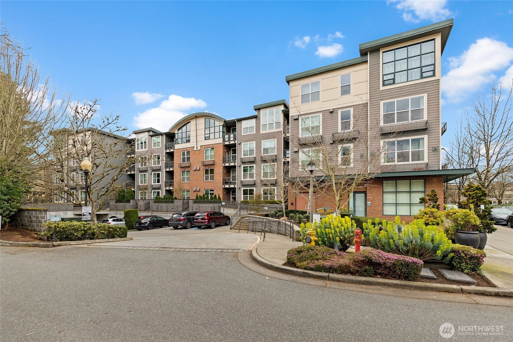 Wide open contemporary condo in the heart of downtown Redmond! Just minutes from Redmond Town Center, Bella Bottega, the Sammamish River Trail, bus, and new transit center, this home offers a Walk Score of 9.2 out of 10 with assigned parking in a secure garage from which you can take the elevator directly to your floor. There's additional visitor parking adjacent to a safe controlled entrance and convenient elevator access from a large lobby. Inside, enjoy a bright great room with a cozy fireplace. The large bedroom and bath provide comfortable living, while the balcony offers a relaxing outdoor retreat above a large lawn area. Recent updates include fresh paint, brand-new carpet, and new blinds for a clean, modern feel. The kitchen comes fully equipped with all appliances, including a brand-new high-end Bosch microwave. A recent remodel also added a convenient storage closet. Extras that stay with the home include a large mirror and TV mount. Community amenities include a shared BBQ and patio area—perfect for entertaining. Move-in ready and ideally located near shopping, dining, trails, and major employers! Mortgage savings may be available for buyers of this listing.