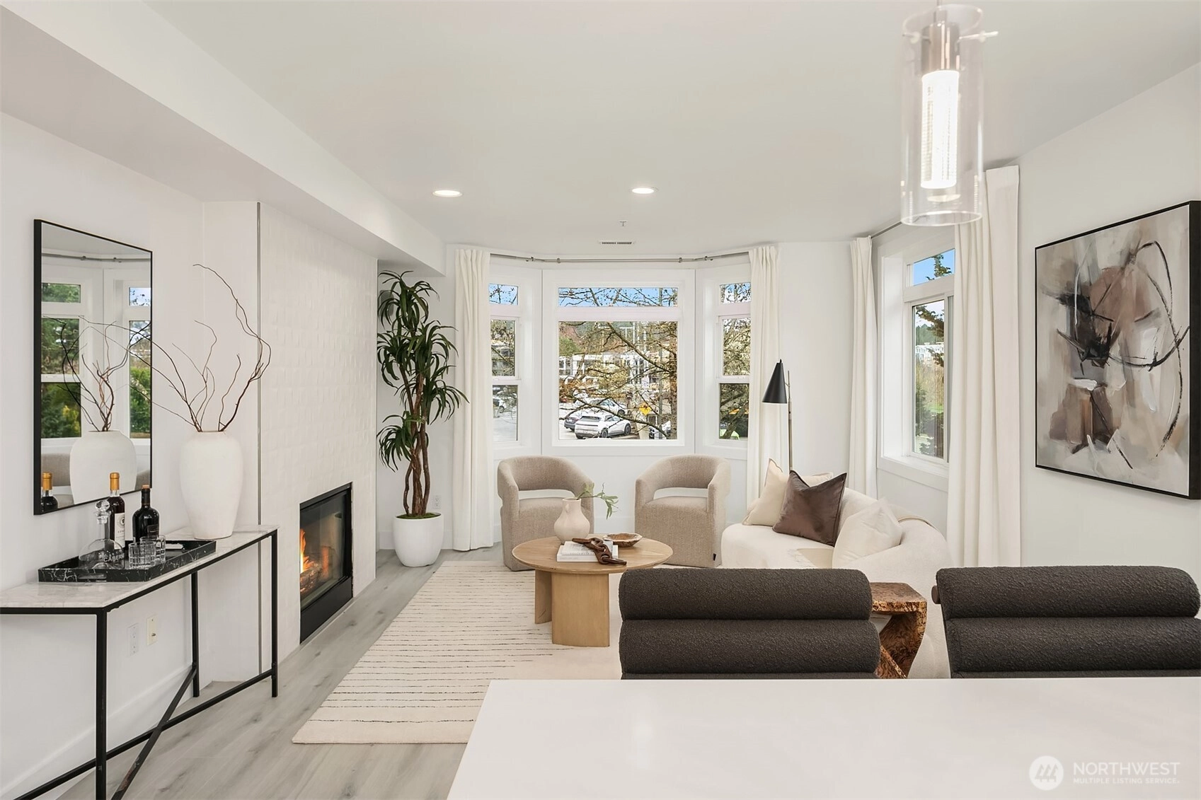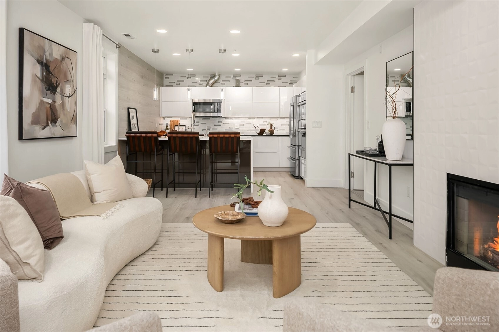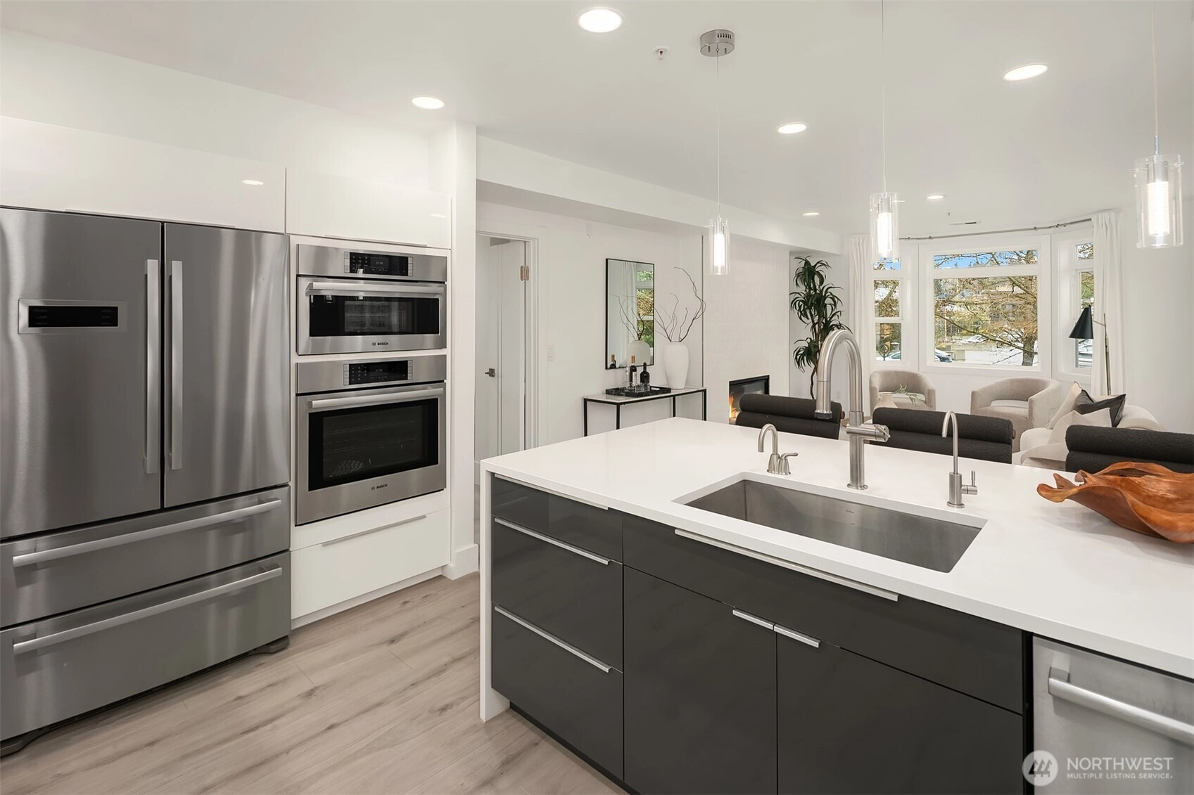 Welcome to the Plaza on State. This meticulously maintained & extensively updated condo is right in the center of Kirkland's vibrant Downtown. Set across from the Heathman Hotel, with shopping & dining just steps away, this home is perfect for every lifestyle. The sprawling floor plan offers 3 bedrooms, 2 baths, 2 living rooms and a dedicated dining room with large windows that flood the home with natural light. The living room features a double sided fireplace and has access to a large covered deck that overlooks Downtown. Fully renovated kitchen with new quartz countertops, Belmont cabinetry, a Bosch appliance package that includes an induction cooktop, steam oven, Kraus sink with instahot + filtered water. The spacious primary suite features access to a private balcony, updated bath with large soaking tub and floating vanity as well as a walk-in closet with custom organizers. Thoughtful updates include new flooring throughout (no carpets), new fixtures, paint throughout, doors & millwork. Prewiring for speakers, Lutron Caseta switches, central AC, and a full utility room with Bosch washer/dryer, new sink & countertops. 2 storage units with easy, same-floor access, 2 conveniently located parking spots with secured entry, all within walking distance to everything Downtown Kirkland has to offer.