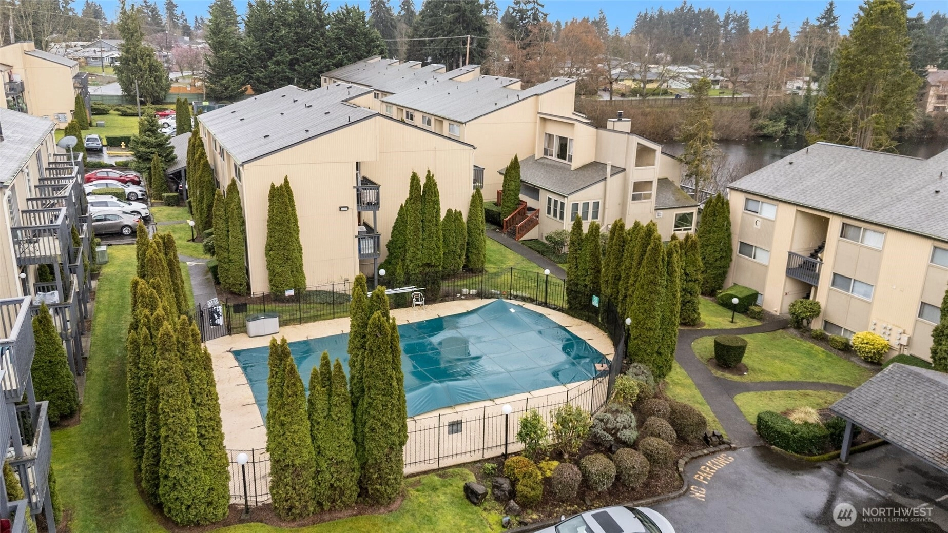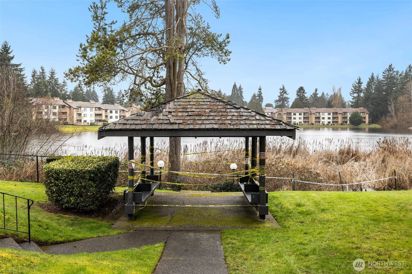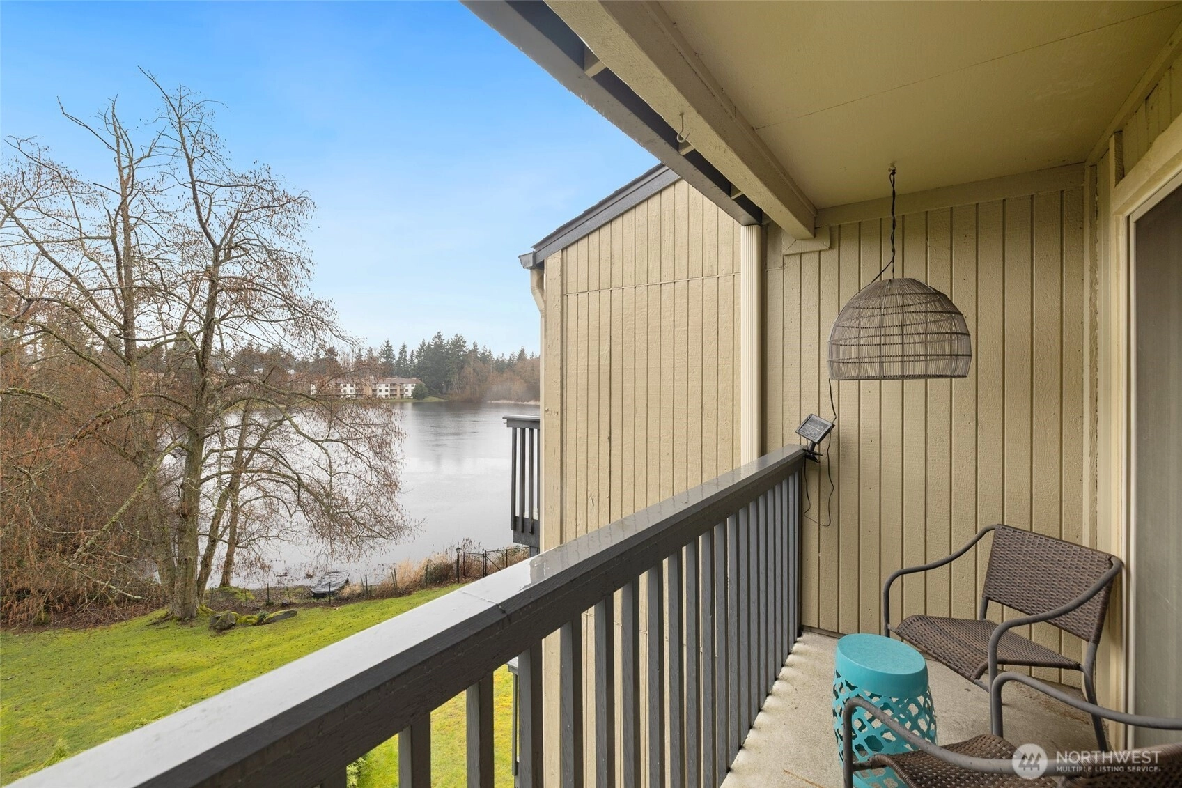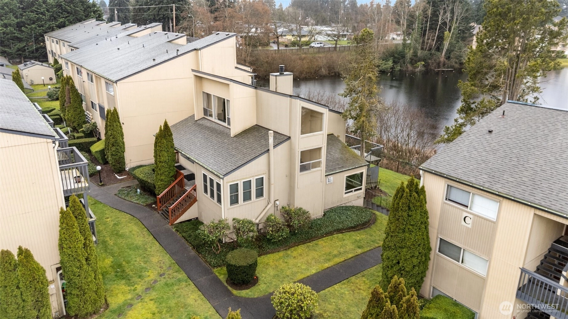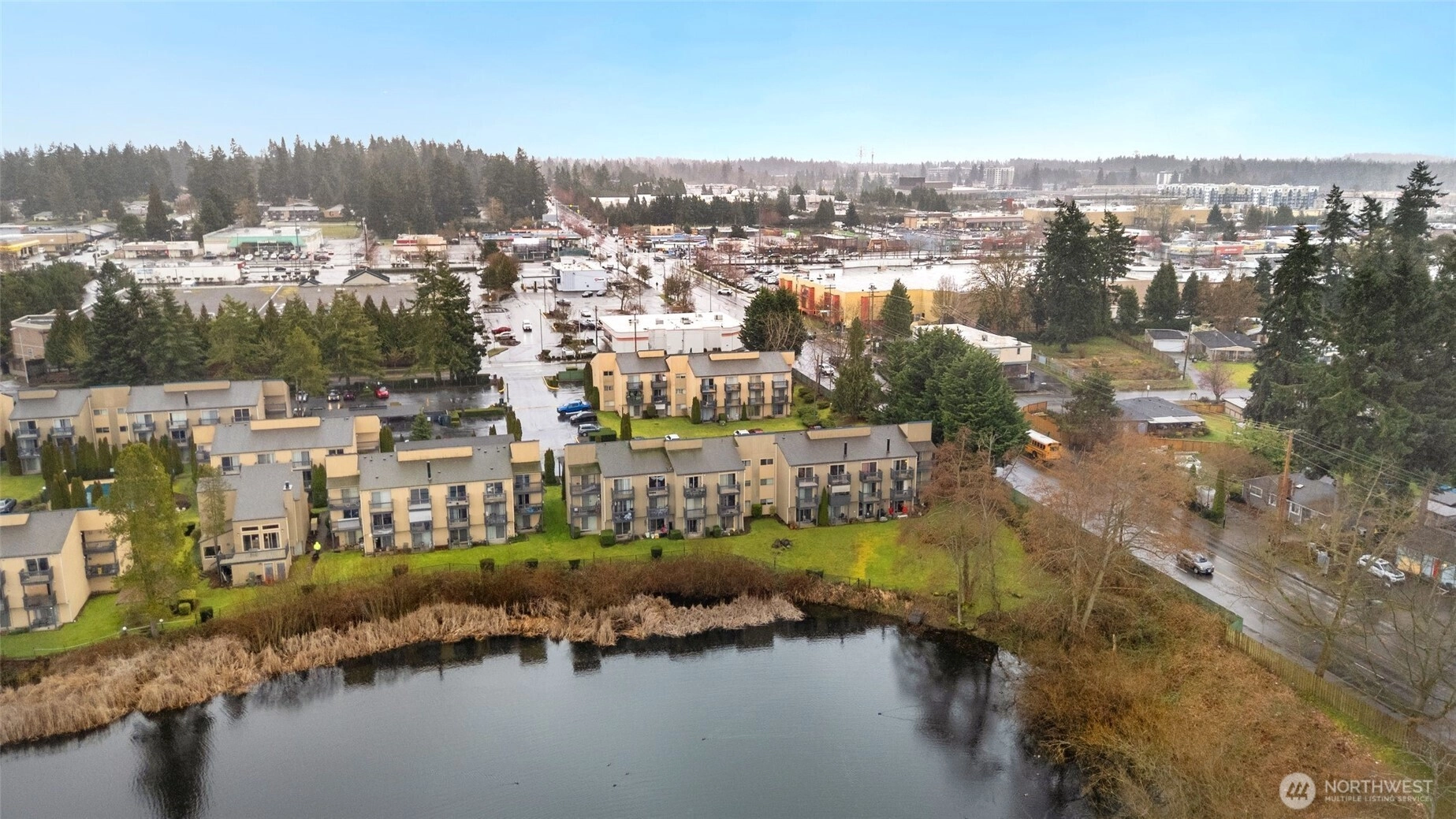 Beautifully updated 2 bed, 2 bath lakeview end unit condo with modern finishes throughout! Bright open living spaces featuring- new flooring and a striking mid-century style fireplace wall. Stylish kitchen with NEW quartz countertops, modern tile backsplash, updated cabinetry and stainless appliances. Spacious primary suite with private en-suite bath and additional bedroom has balcony access overlooking the lake- this second bedroom is perfect for guests or home office. There are 2 balconies and both have peaceful lake views. The community amenities include clubhouse, exercise room and outdoor pool. There is an assigned covered parking located directly in front of the unit and plenty of additional or guest parking. Convenient location-just minutes to new light rail transit center and near plenty of shopping and dining places.