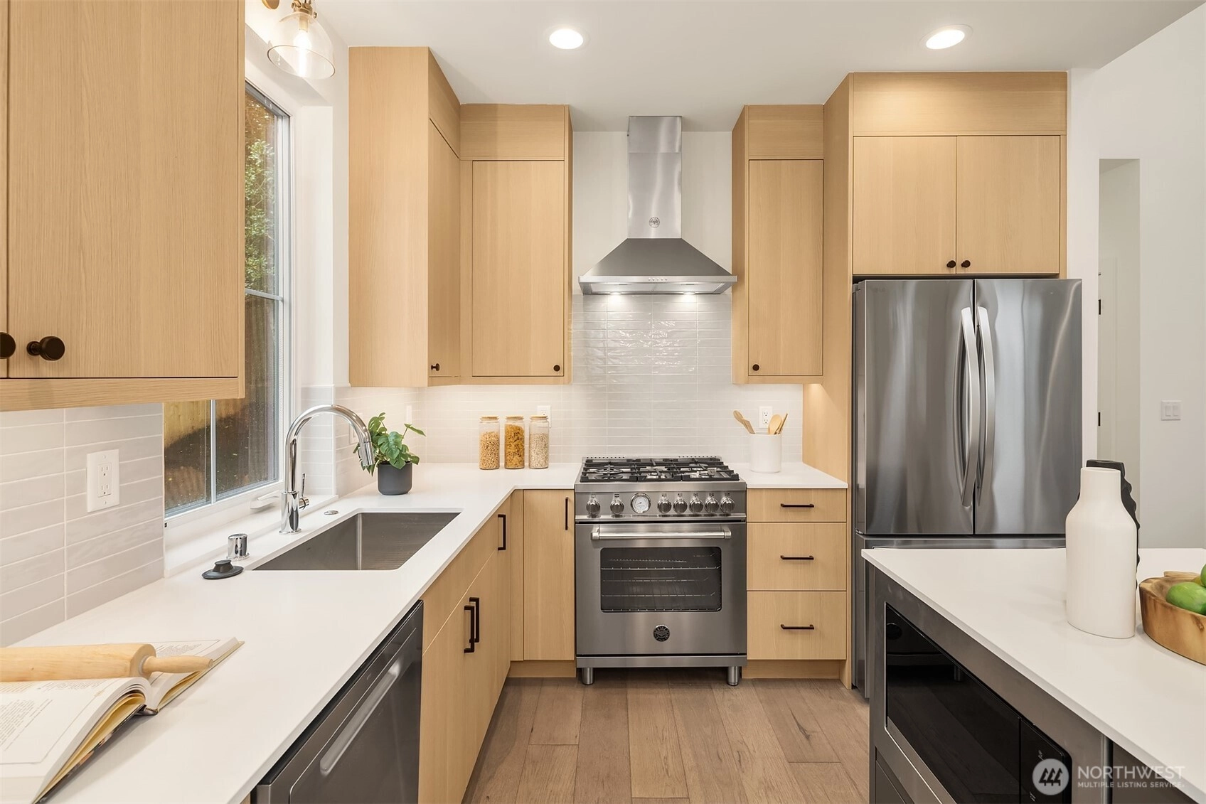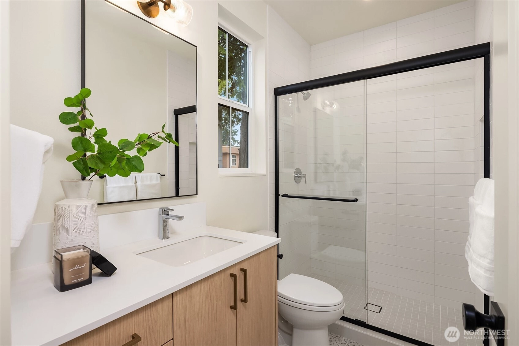 Exceptional new construction cottage by Gerry Homes in East of Market, offering refined design, elevated finishes and a spacious fenced backyard. A charming porch welcomes you to the gracious main level featuring bright & airy two-story living room, with open concept dining and kitchen with gas range. Unique main floor bedroom and ¾ bath offers flexible floor plan. Upstairs showcases two bedrooms, each with en suite baths for ultimate privacy and convenience. Moments to downtown the shopping and dining of downtown Kirkland, recreation on Lake Washington, & effortless commute throughout the east side. Designated EV off-street parking provides peace of mind at the end of the day.