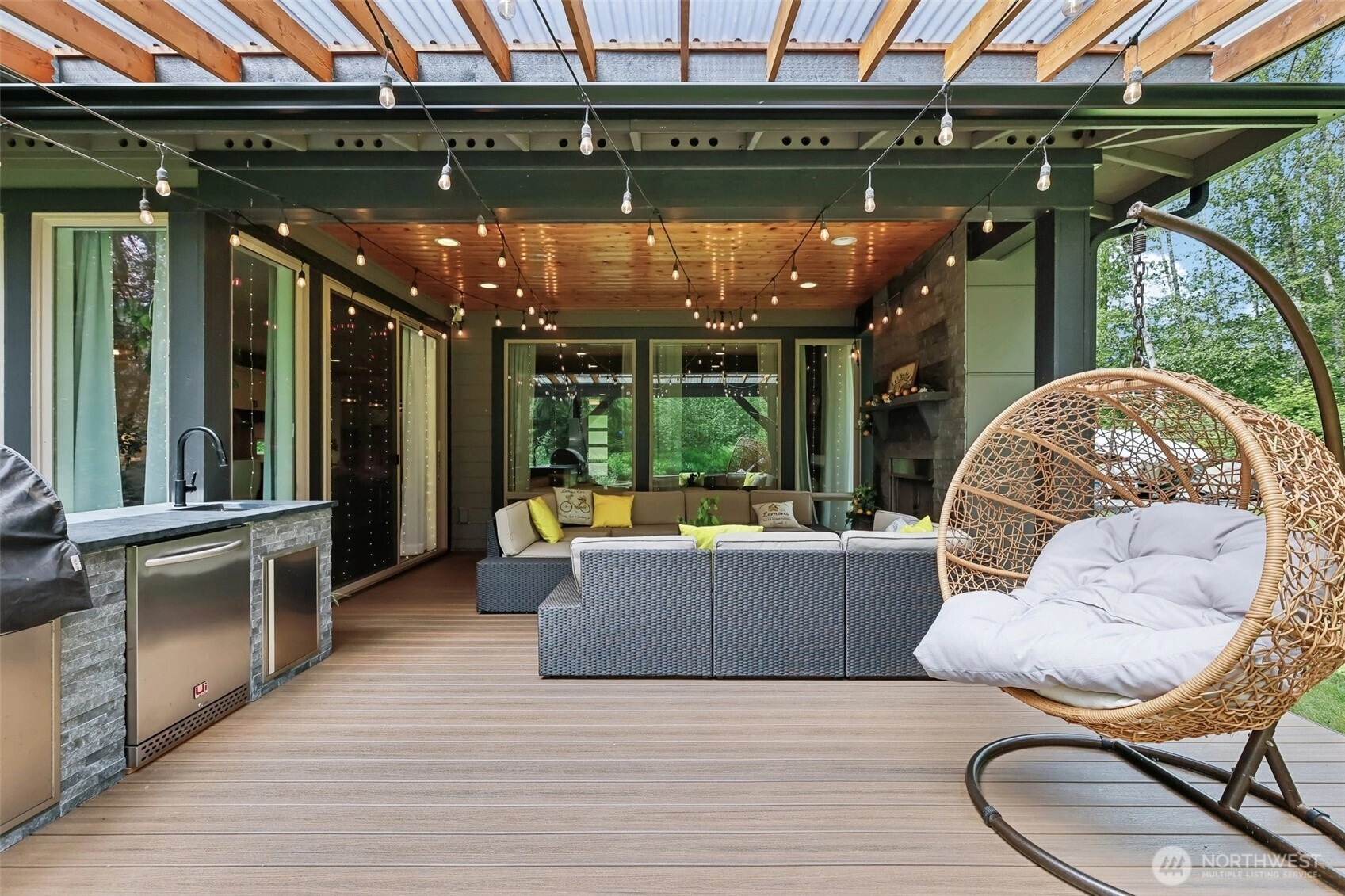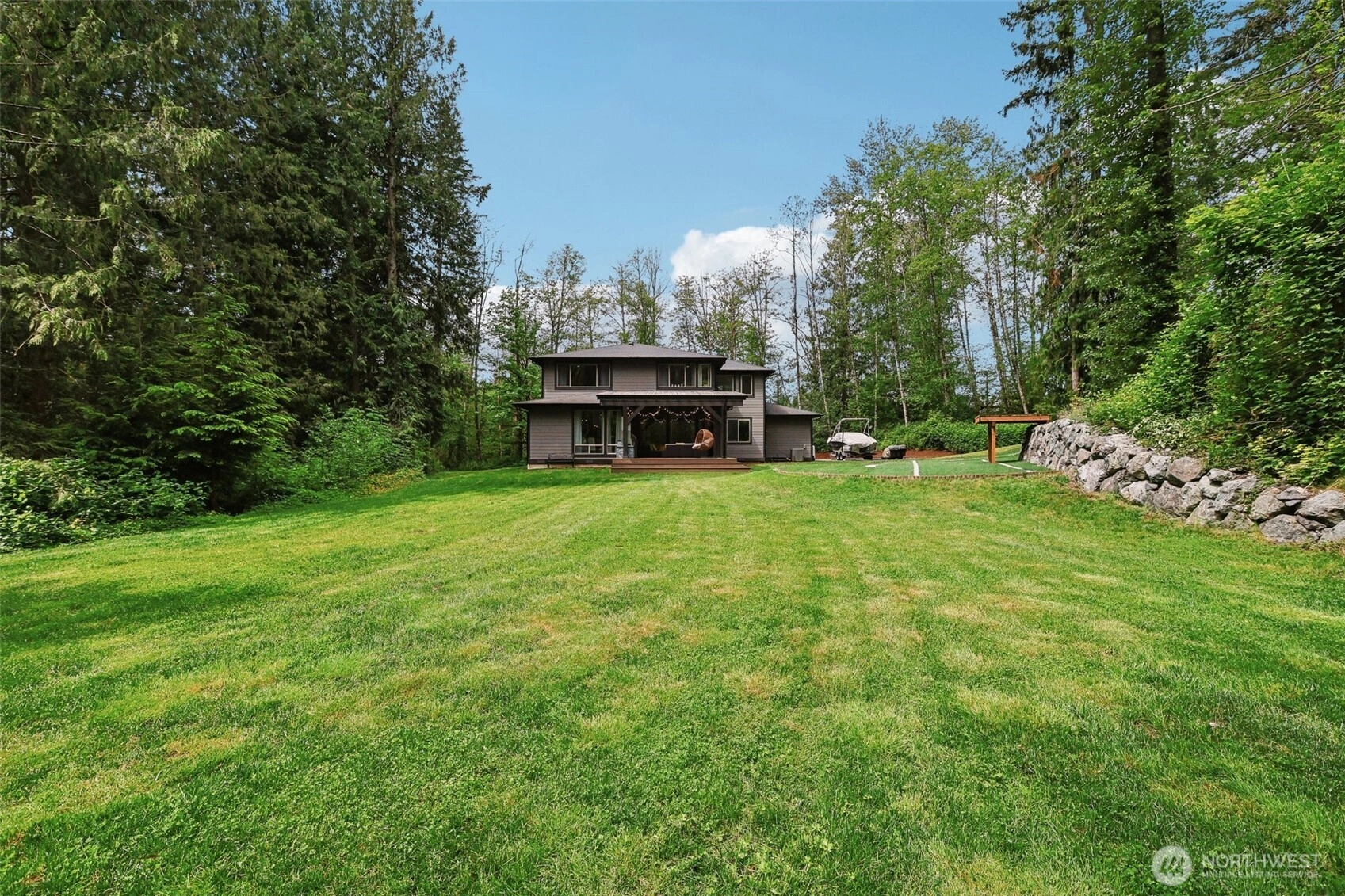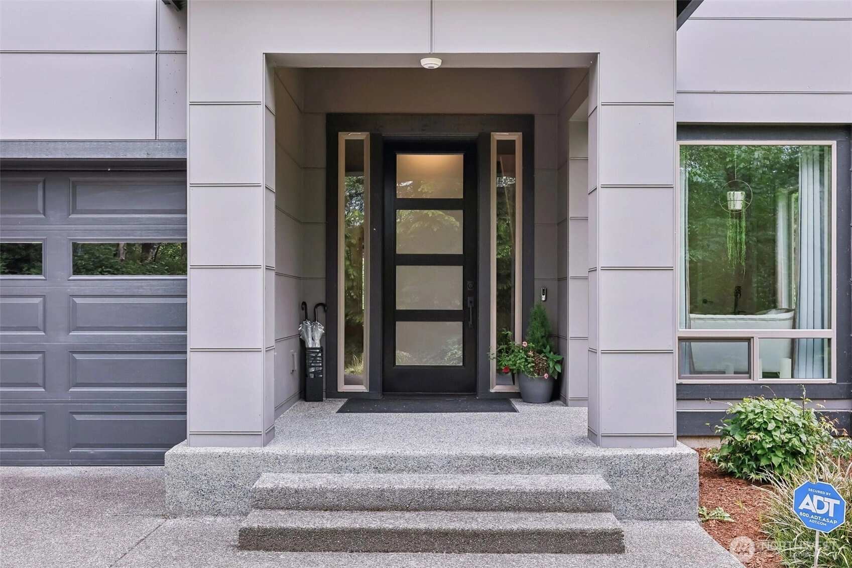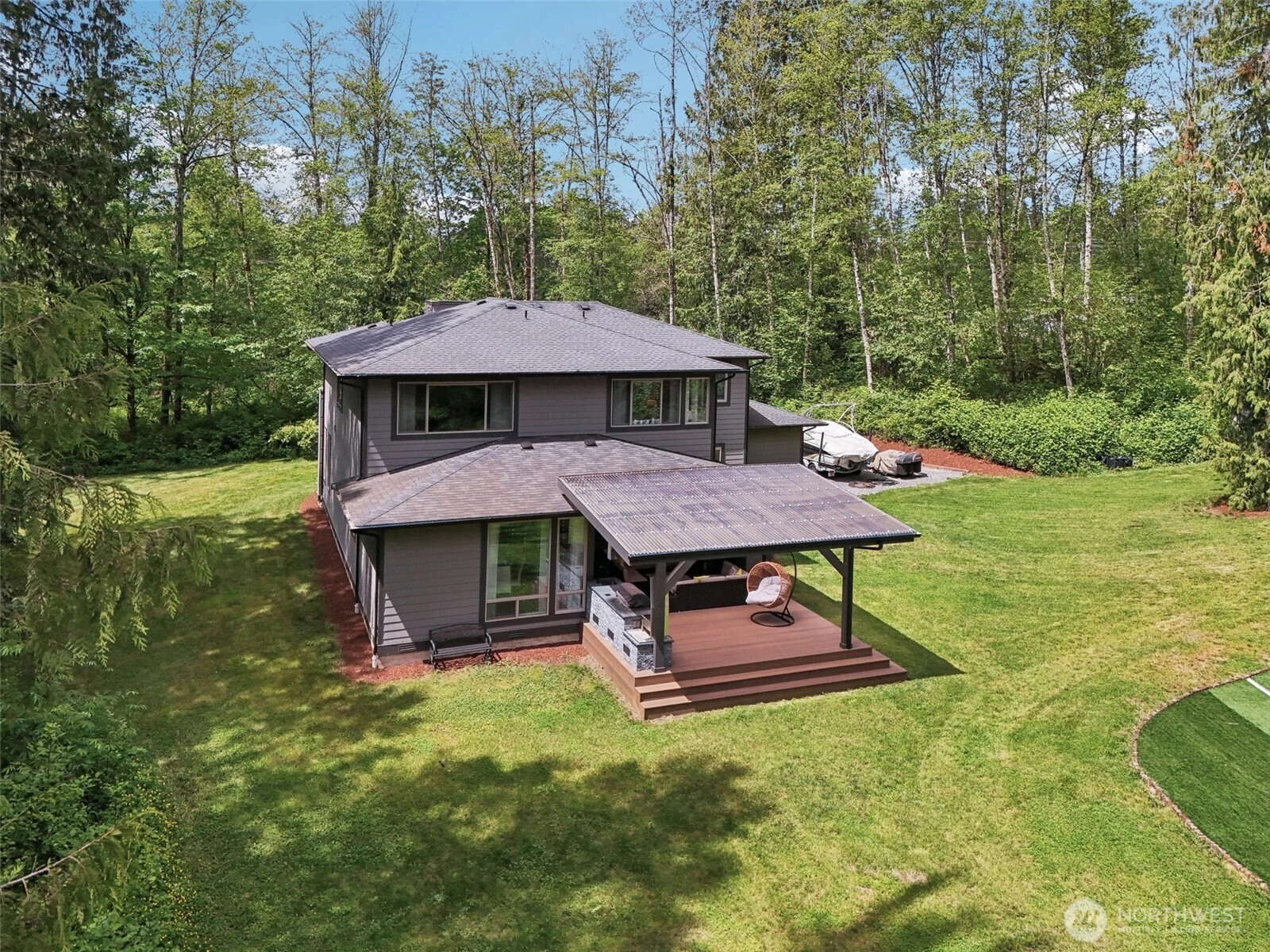Peace & privacy awaits! This gated 6.5-acre estate features a stunning contemporary home designed for modern living. The open floor plan showcases floor-to-ceiling windows & designer touches throughout. The chef’s kitchen shines w/ white cabinetry, quartz waterfall island, & stainless appliances. Wide-plank flooring & recessed lights complete this stylish, nature-inspired retreat. A covered outdoor living space includes a sleek stone fireplace, wood-paneled ceiling, & dual fans - perfect for year-round enjoyment. The spa-like primary bath offers a soaking tub, dual vanity, hex tile backsplash, & large-format floors. Don't miss the spacious 3-car garage & fresh landscaping. There is even room for a shop or RV parking!