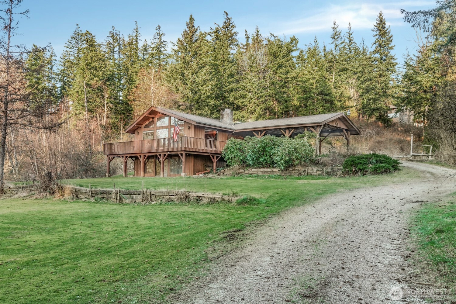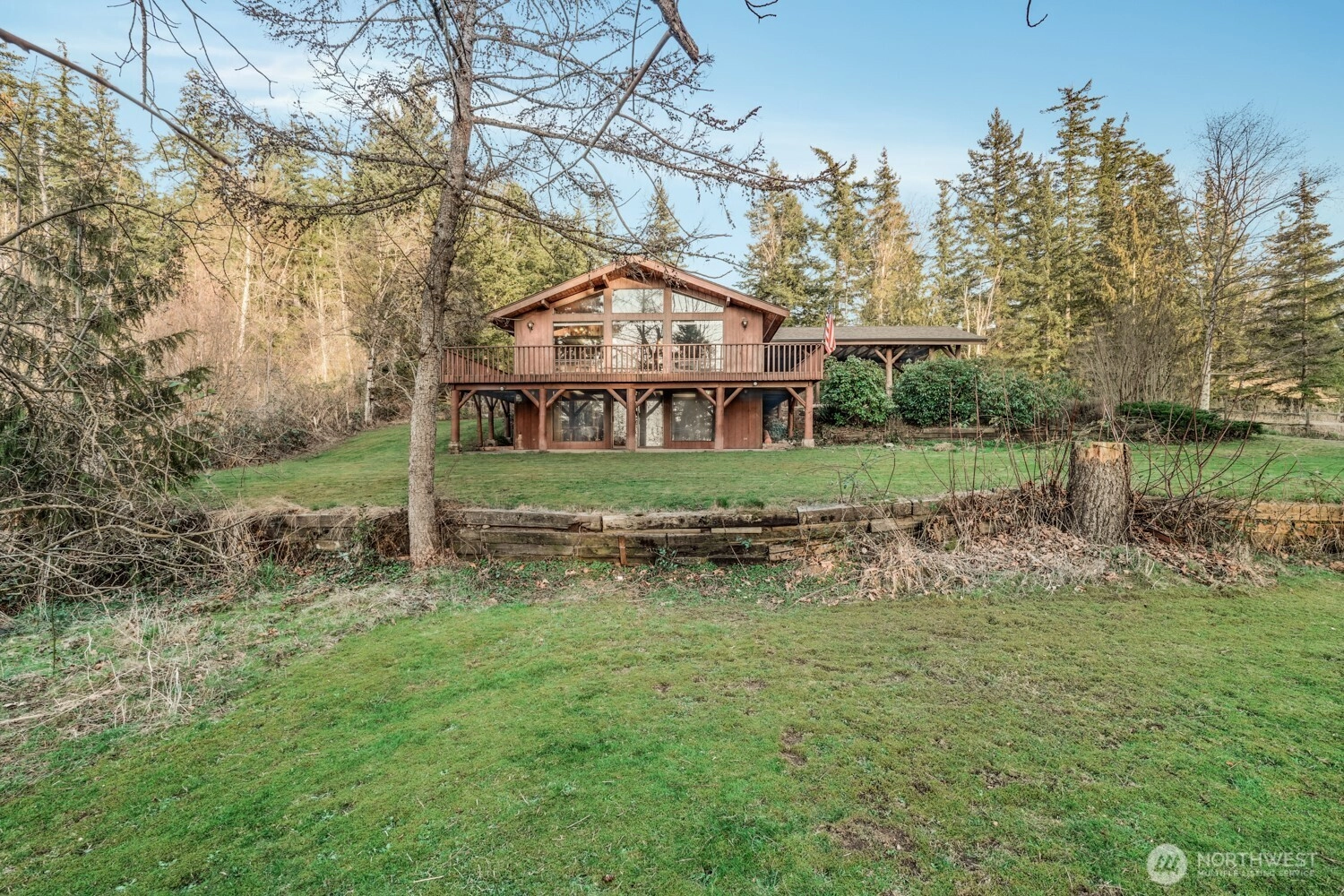 Beautiful, first time on the market, 3-bedroom, 2-bath home on 5.02 acres featuring territorial and distant mountain views! With its peaceful setting and cabin-like atmosphere, this property offers incredible potential as a private retreat, vacation home, or even a future Airbnb opportunity. Enjoy the scenery from the large wraparound deck, perfect for relaxing or entertaining. The living room showcases vaulted beamed ceilings, floor-to-ceiling windows capturing the views, and an impressive floor-to-ceiling rock fireplace. The dining area includes sliding doors leading out to the deck for easy indoor-outdoor living. The kitchen offers an island and plenty of prep space. The primary bedroom features a private bath and its own sliders to the deck. A second bedroom, full bath, and convenient main-floor laundry with exterior access complete the main level. Downstairs you'll find a spacious basement with beamed ceilings and sliders to a covered patio overlooking the expansive yard, along with a third bedroom. The unfinished portion of the basement offers endless possibilities—workshop, office, hobby room, or more. A 28x16 barn provides great storage for tools and equipment. Enjoy peaceful country living while still being just 20 minutes to shopping and dining options, and approximately 30 minutes to North Bellingham Golf Course.