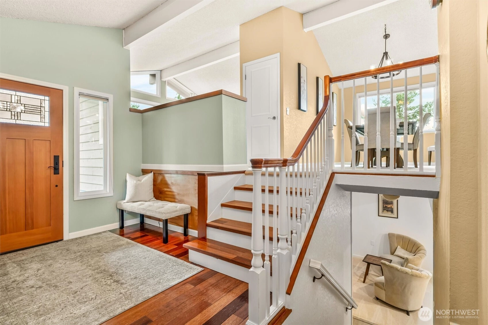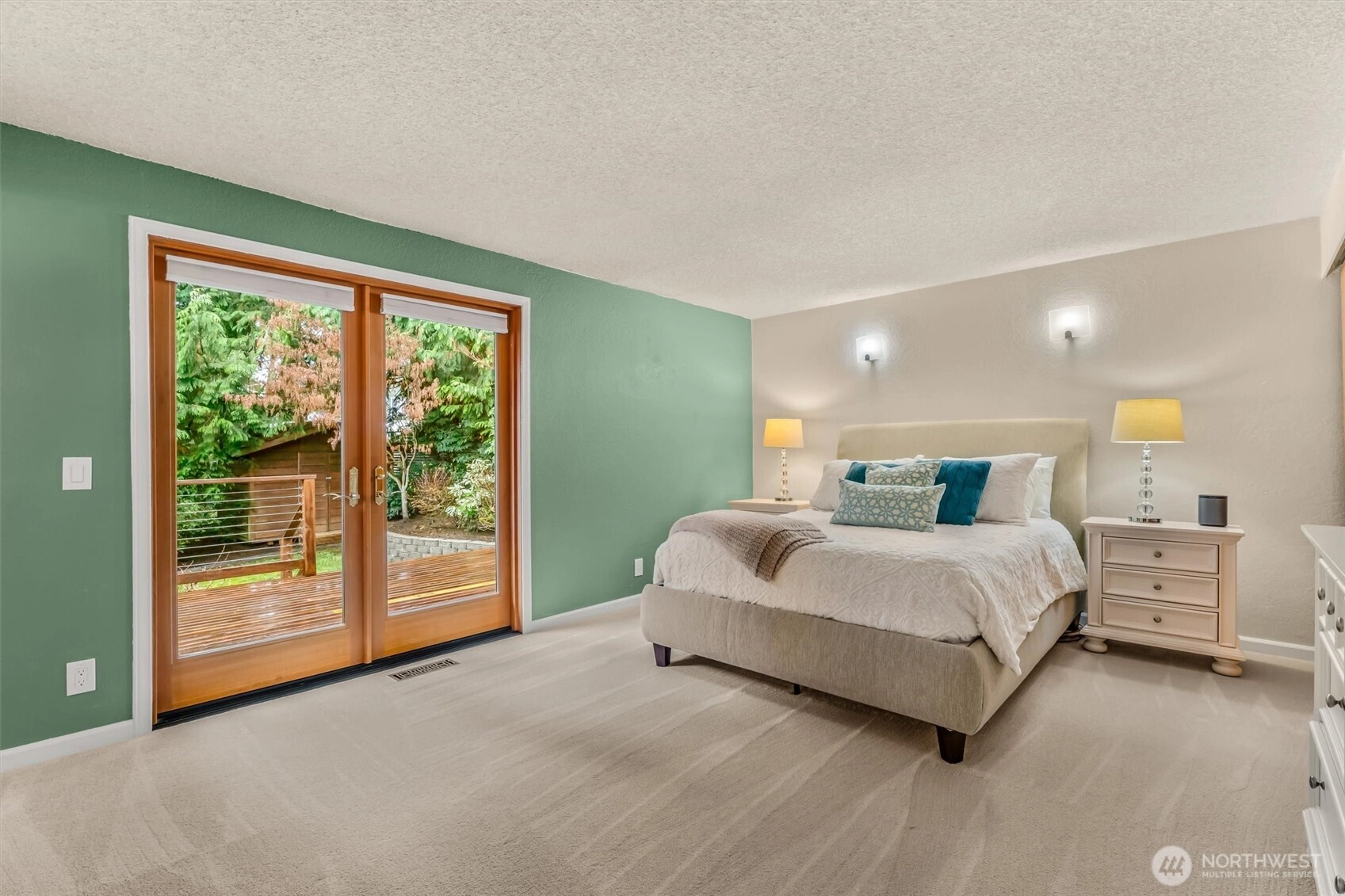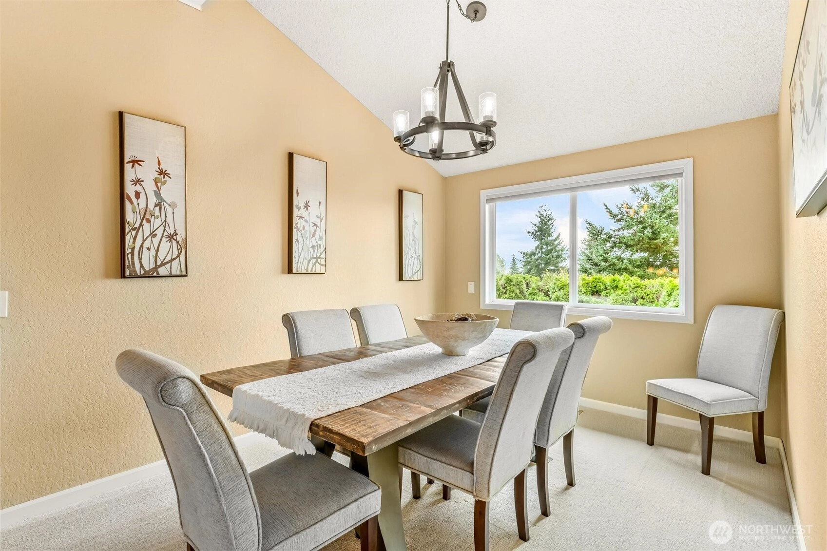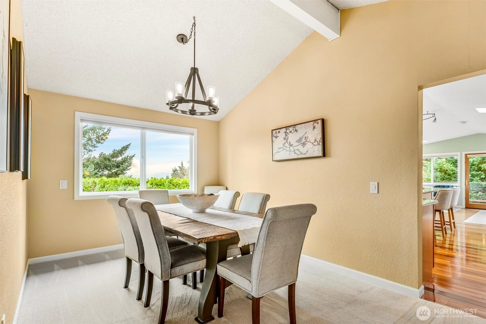 This beautiful 3-bedroom home offers stunning Cascade Mountain views and warm welcoming spaces throughout. The open kitchen and great room flow seamlessly to a wraparound deck-perfect for entertaining or enjoying peaceful mornings. A bright dining room and a living room with high ceilings, soaring windows and a wood-burning fireplace create inviting gathering spaces. The main level includes two bedrooms, a full bath, and a serene primary suite with its own deck and ensuite bath. The lower level features a spacious family room with a cozy fireplace nook, a separate entrance, a large office currently used as a fourth bedroom, and a 3/4 bath. With AC, a hard-wired generator, lush gardens, and a private side patio, this home offers comfort, flexibility and breathtaking views.