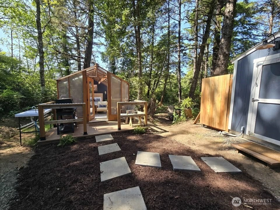 Tucked among towering evergreens, this serene woodland retreat offers a rare blend of comfort, privacy, and natural beauty. Thoughtfully designed to immerse you in its forest setting, the cabin features expansive windows and stunning glass-ceiling that fills the space with natural light and creates the feeling of waking up in a treehouse—quiet, calming, and restorative.Multiple outdoor living areas invite you to relax and connect with nature. Enjoy evenings around the cozy fire-pit seating area, perfect for stargazing or unwinding after a day at the beach. A private outdoor shower adds a spa-like touch, ideal for rinsing off sandy feet or simply enjoying the fresh coastal air in total privacy.The community walking trail leads directly to the beach, making shoreline strolls, sunset walks, and peaceful mornings by the water part of your everyday rhythm. Here, forest, comfort, and coastal living come together beautifully.Located in desirable Copalis Beach, this 0.59-acre recreational property sits within the gated community of Seaview Estates. Recent improvements add exceptional value, including a 10×16 luxury greenhouse, attached deck, 4×6 shed converted to off-grid bathroom. Electricity was professionally installed in 2025 with a new electric panel and breaker box. Grays Harbor County water service has been fully paid for and is awaiting installation. Serves as an income generating property. Includes 2 parcels. I have lenders available that will loan on this.