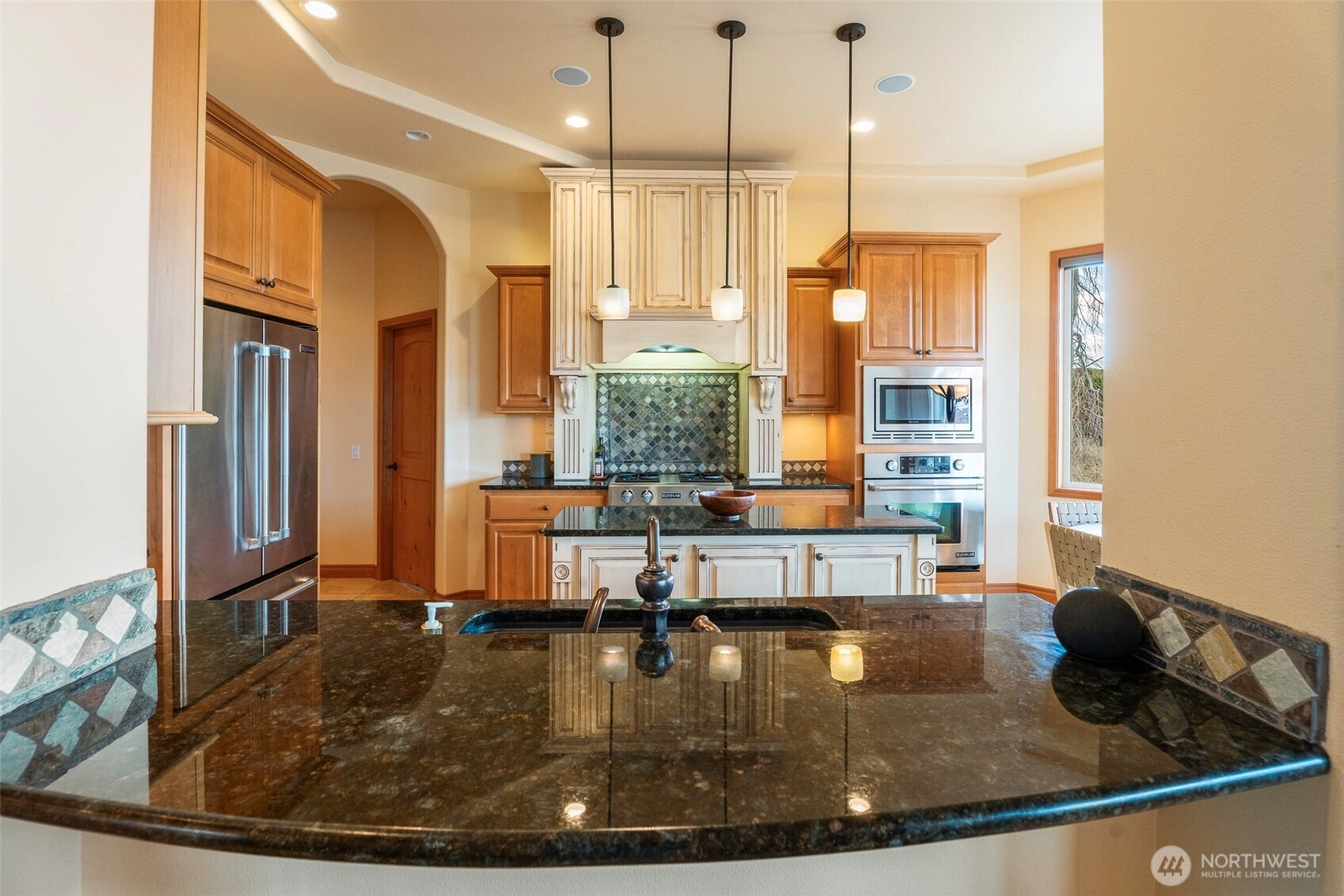 Positioned above the scenic Columbia River, this custom-built Southwest-style stucco rambler offers an exceptional blend of location, design and lifestyle! Situated along one of Washington's top-rated golf courses, the home captures sweeping fairway and river views while providing the ease and convenience of single-level living! This thoughtfully designed 3-bedroom 2 1/2 bath plus office home features an open, functional layout ideal for both everyday comfort and effortless entertaining! At the heart of the home is a chef's kitchen featuring top of the line stainless appliances, designed for both serious cooking and socializing--offering generous workspace, custom finishes and a layout that flows seamlessly into the main living, dining and expansive outdoor patio that highlights a high-end kitchen perfect for hosting gatherings! Outdoor living is where this property truly shines, overlooking pristine fairways on the 4th hole, with the majestic Columbia River stretching across the horizon, the patio becomes a natural extension of the home-an inviting space for morning coffee, relaxed evenings and unforgettable sunsets. Desert Canyon offers so many amenities! Oasis Restaurant, clubhouse, golf shop, access to the pool, and tennis and pickleball courts!! Welcome to refined living in one of Washington's most picturesque settings! Separate buildable .30 acre vacant lot also for sale as MLS #2484389 on the 5th hole.