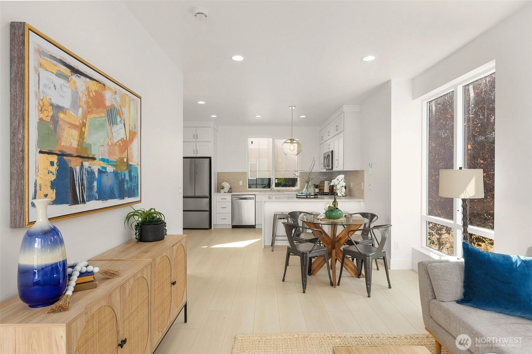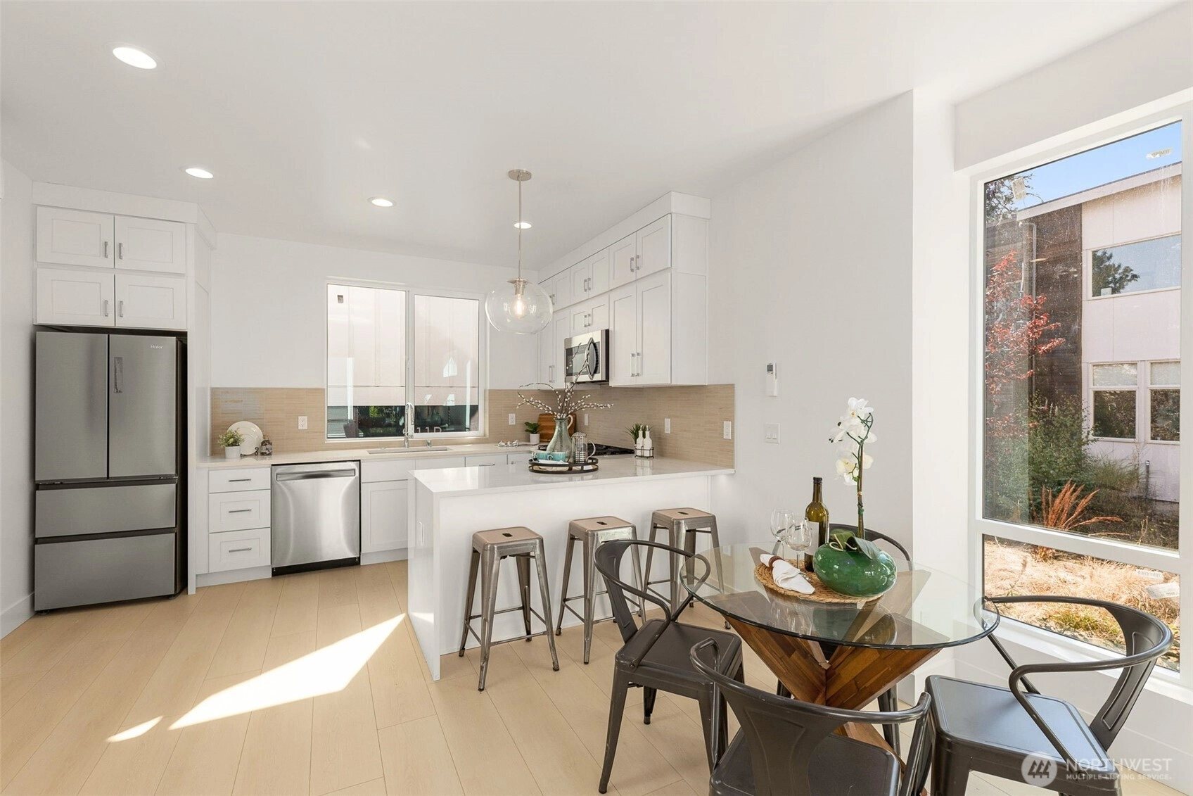Welcome to your brand-new Greenwood home! This 3-bed, 2.5-beth modern residence stands out for it quiet middle-unit location, abundant natural light, and attractive floorplan. An open, sun-filled layout flows to a sleek kitchen with quartz counters and premium appliances. Primary suite with two additional bedrooms offers flexible space for home offices and guests. Enjoy year-round comfort with mini-split heating/cooling, and enhanced security lighting for peace of mind. Minutes to parks, coffee shops, and transit, this never-lived-in home blends thoughtful design with a builder’s warranty and quick access to Seattle’s tech hubs.