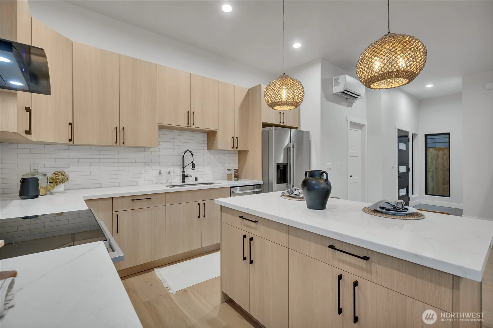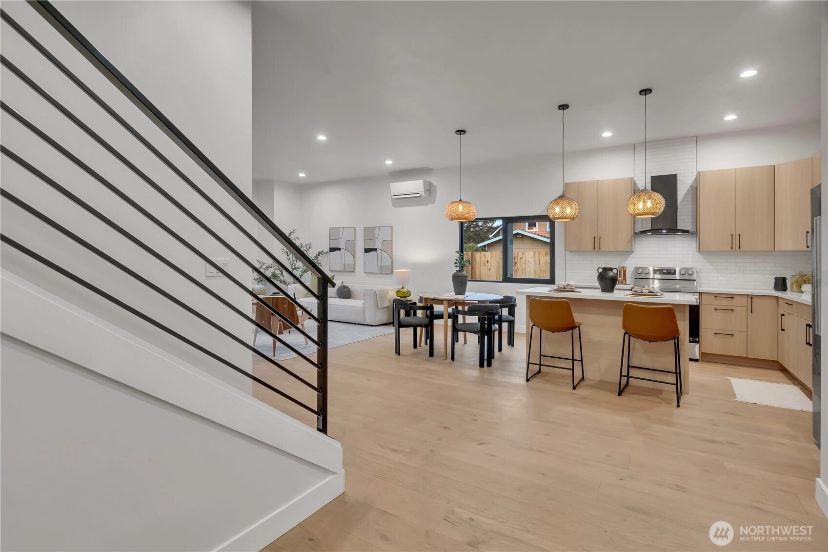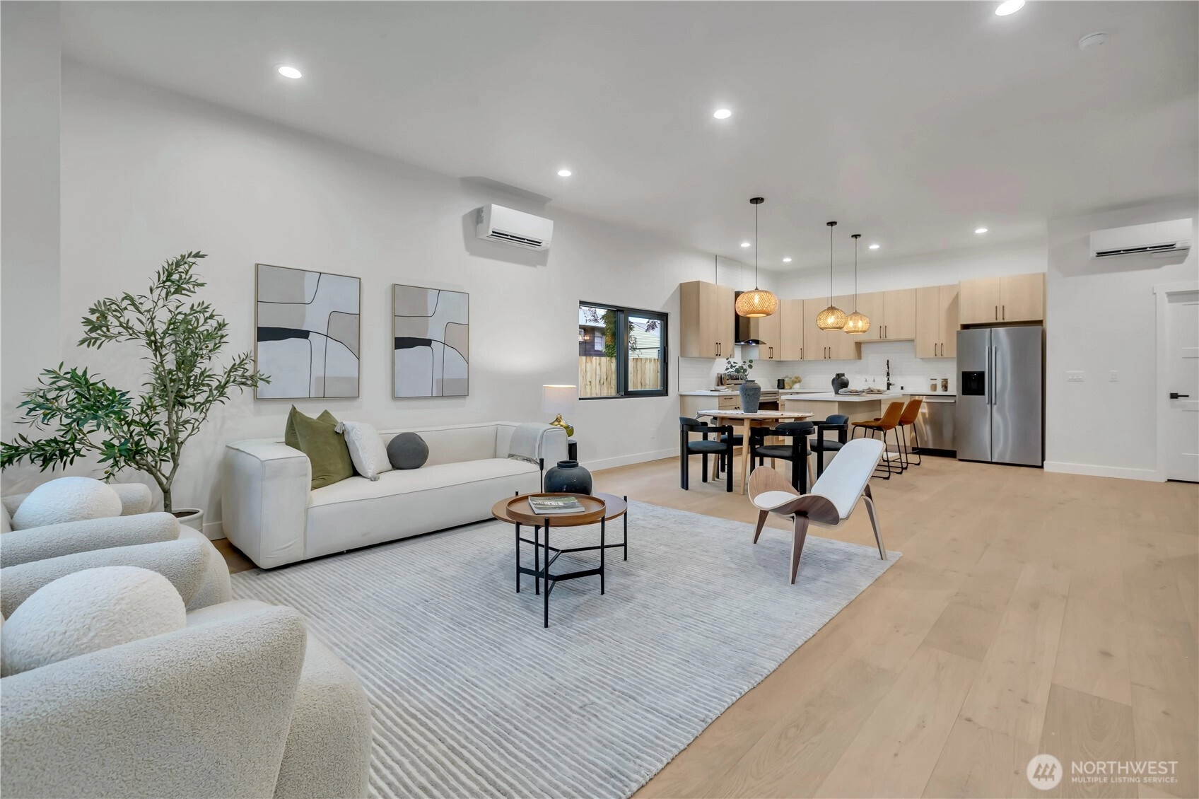 Stunning 2026 new construction designed for modern Seattle living. This light-filled 4-bedroom, 3-bath home showcases soaring 10-ft ceilings, expansive folding doors, and exceptional indoor-outdoor flow to a covered entertaining patio with BBQ area. The open-concept main level features a chef’s kitchen with stainless appliances, statement hood vent, walk-in pantry, and seamless dining and living spaces. A private office and full bath provide flexibility for guests or remote work. Upstairs offers four bedrooms including a luxurious primary retreat with covered balcony, oversized walk-in closet, and spa-inspired five-piece bath. A spacious laundry room with built-in cabinetry adds convenience. Efficient mini-split heat pump comfort, thoughtful layout, and timeless design throughout.