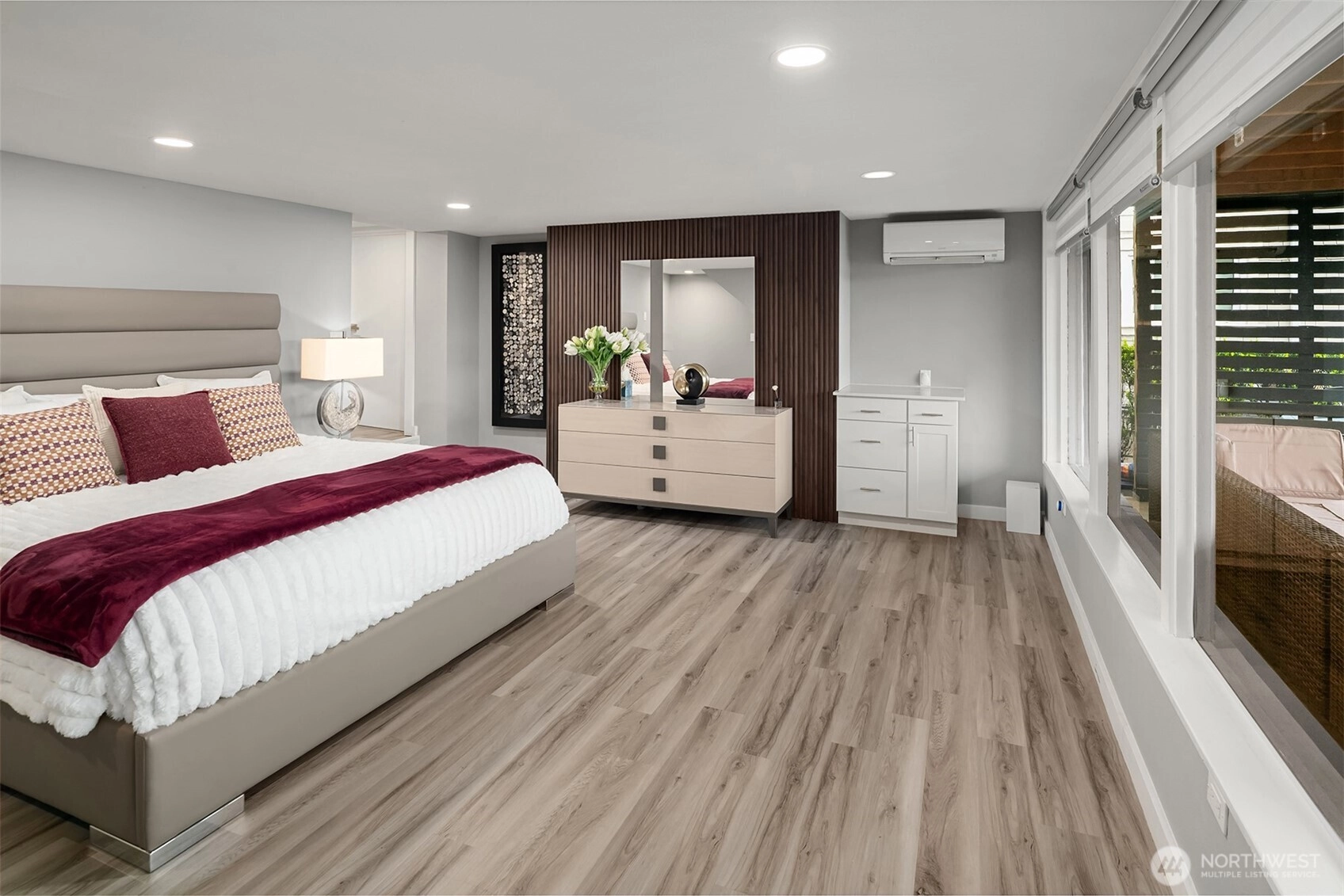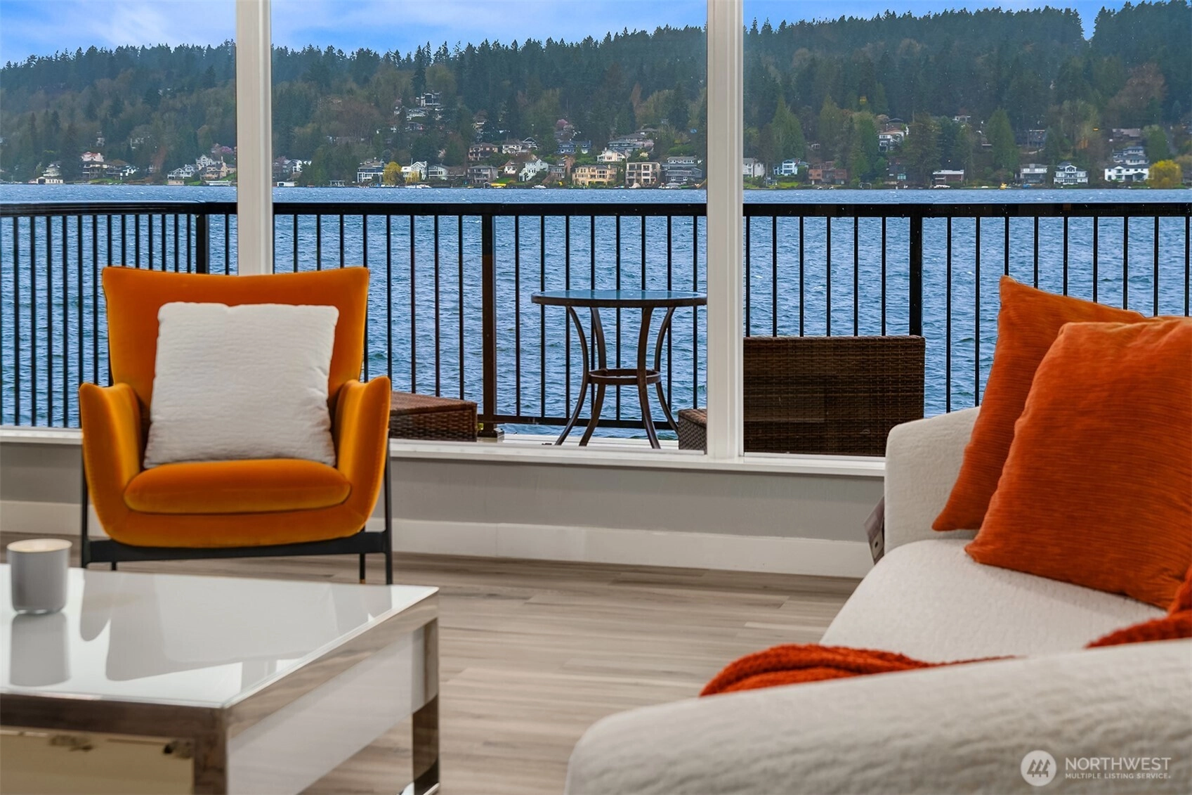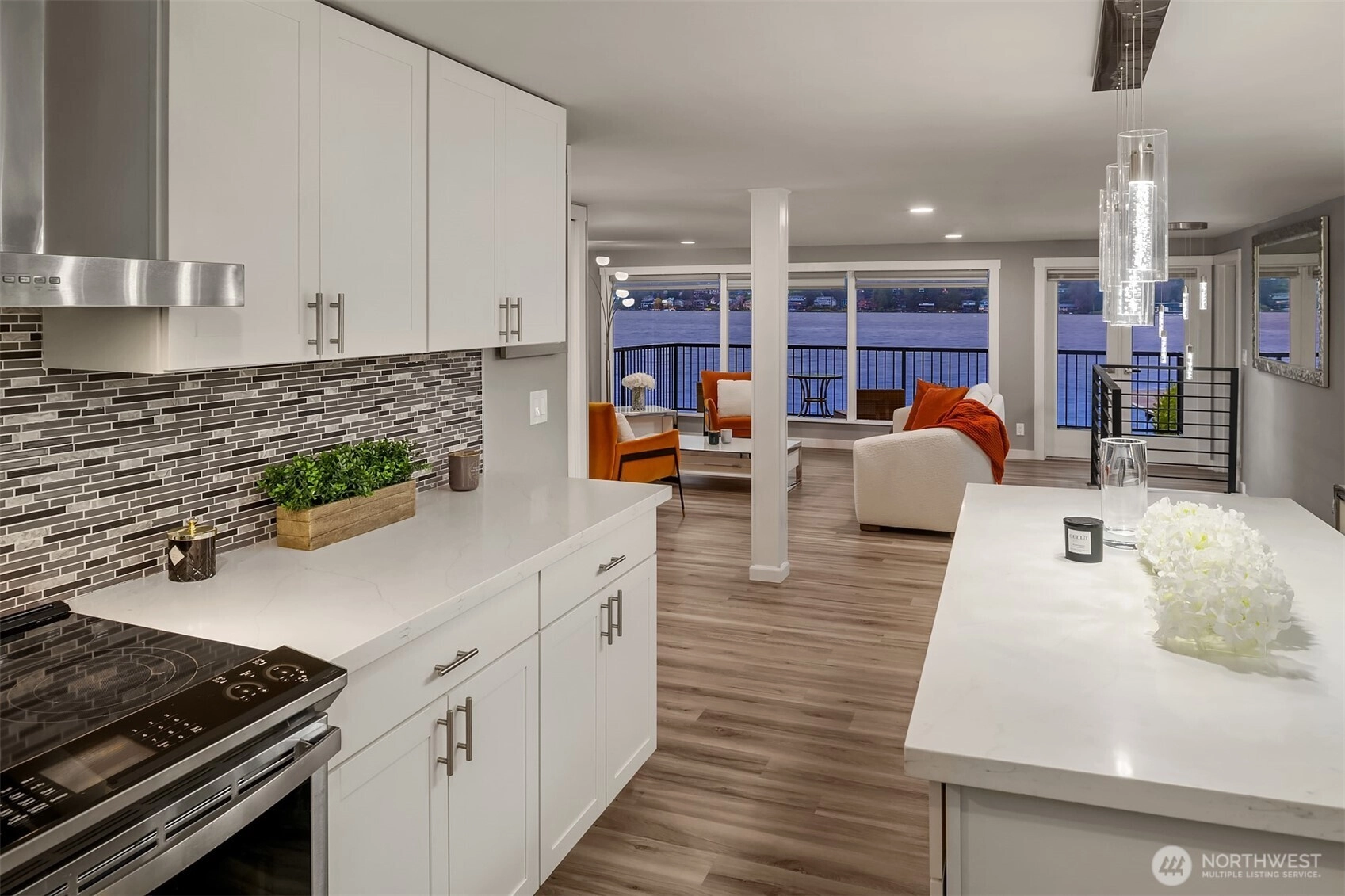 Perfectly placed on a prime stretch of Lake Washington shoreline, this private retreat offers 32 feet of low-bank waterfront and sweeping water views from both levels, with a front-row seat to spectacular sunsets over the lake. The open-concept living + kitchen area welcomes you with a dramatic west-facing wall of windows, framing shimmering waters stretching toward Mercer Island and the south end of the lake. The remodeled kitchen features a large island, quartz counters + stainless appliances - perfect for everyday living and entertaining. Step out onto the expansive deck to savor the views and soak in the beauty of lakefront living. A versatile corner den offers flexibility for a home office, playroom, or yoga retreat, while a spacious bedroom and beautifully updated ¾ bath w/ a large walk-in shower complete the main level. Downstairs, the generous primary suite is surrounded by windows overlooking the yard, private dock + sparkling lake beyond. Step outside to the covered patio, where the water’s edge is just moments away. The thoughtfully landscaped two-tier backyard leads to the private dock, creating an ideal setting for relaxing, entertaining, or enjoying life on the lake. An oversized unfinished space on the lower level offers abundant storage or future potential for expansion of the primary suite. Ideally located just minutes from I-405, Eastside Corridor Trail, DT Bellevue + nearby parks - this is a rare opportunity to experience the very best of waterfront living.