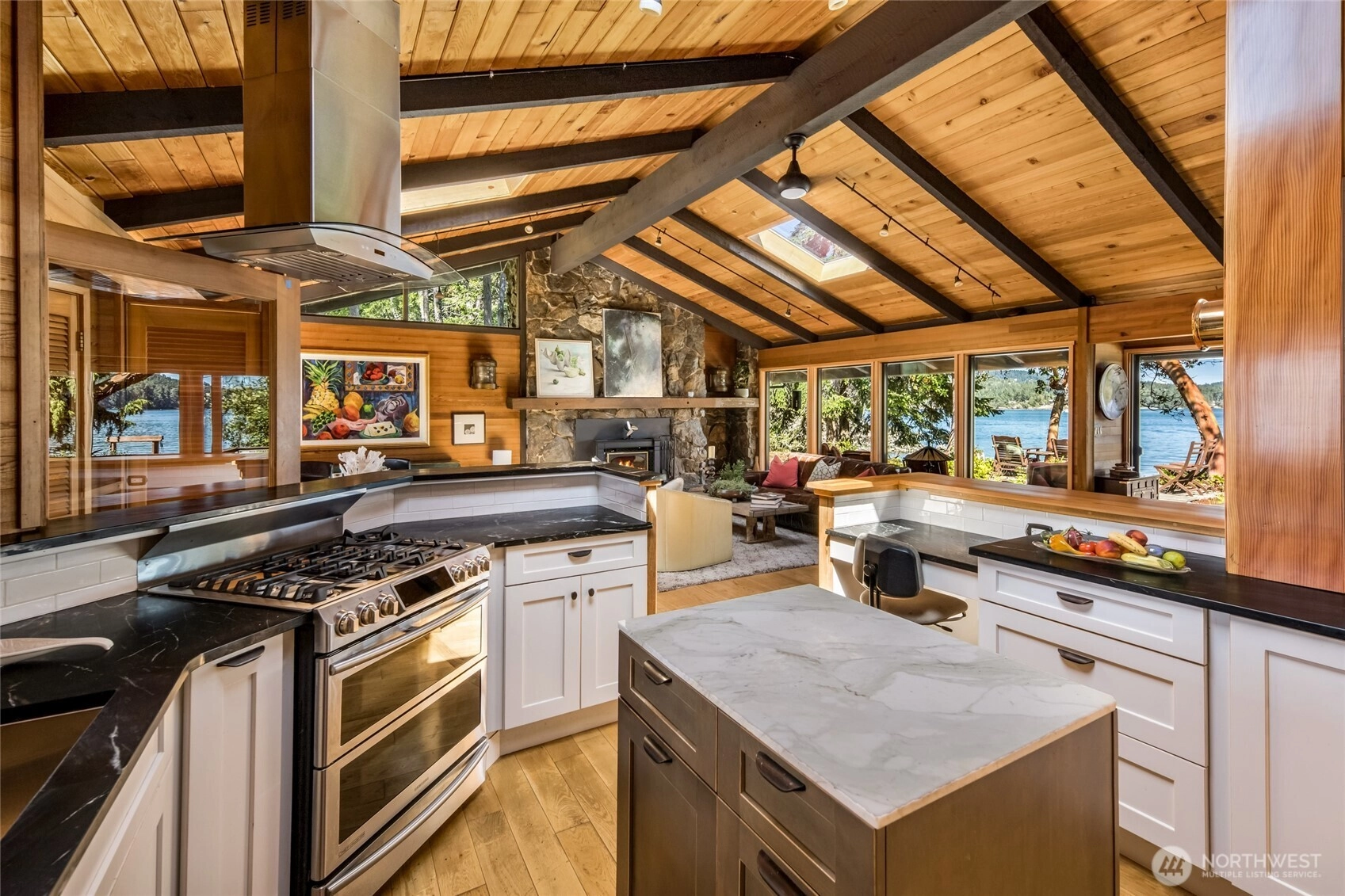 Isthmus House is a rare opportunity to acquire style and a totally unique location, positioned to provide breathtaking views East to Harney Channel and Orcas Island and West to Wasp Passage and Bell Island.With 250 feet of waterfront on the East and the West side of the home, and a mooring buoy in the East bay, Isthmus House is not just a home but a lifestyle to be cherished for a lifetime. Open plan with vaulted ceilings in every room. Built in 1969, addition added in `1989. Kitchen and bathrooms and have been completely renovated. Expansive decks on east and west side of home create a seamless transition from indoors to outdoors. Perfect blend of modern comfort and classic mid-century modern charm.Great for entertaining!