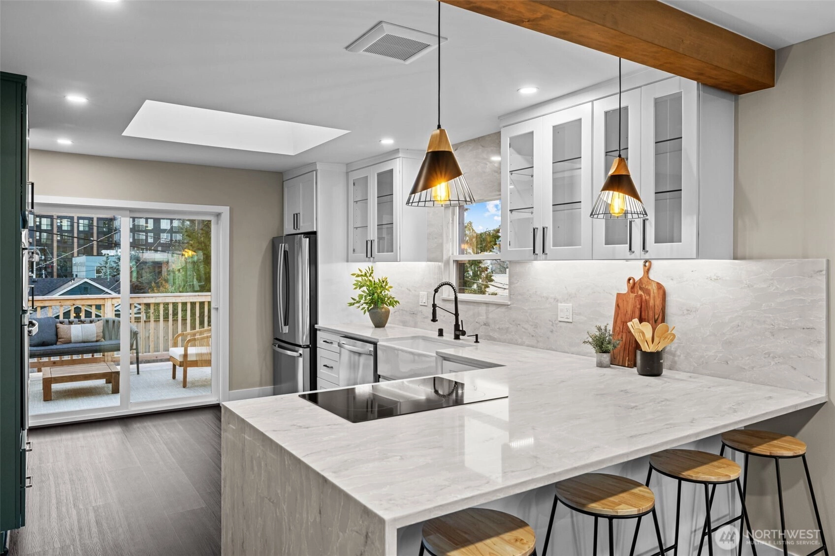 Sophisticated West Seattle home with designer finishes, sleek lines and incredible light. Open-concept living and dining flow to a chef’s kitchen with luxury appliance package, waterfall island and custom cabinetry. Well-appointed bedrooms and spa-inspired baths feature walk-in shower, statement tile and warm metal accents. Relax in the summertime with A/C and enjoy the flexible spaces which are ideal for media, guests or work. Multiple clear stained decks and a private, fenced yard creates a seamless indoor-outdoor living. Large driveway that can accommodate up to six vehicles. Minutes to Alaska Junction, parks, transit and all your favorite West Seattle spots. Comes with a Pre-Inspection and 1 year home warranty.