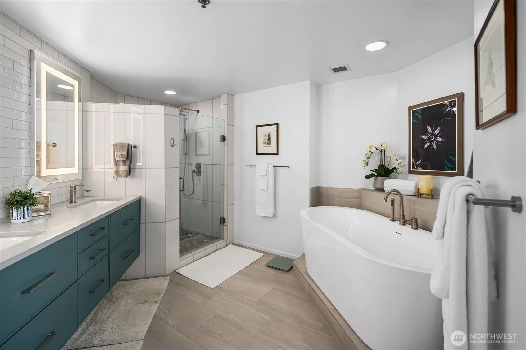The epitome of chic urban living in downtown Bellevue in Bellevue Pacific Tower. Fully remodeled •19th floor downtown Bellevue condo • Water, mountain & city views • 0.2 mi to Bellevue Square • 0.3 mi to Bellevue Downtown Park • 0.4 mi to NE 8th St light rail. Fully remodeled 2-bedroom residence with additional flexible room suitable for guest room, office, or potential third bedroom. Expansive windows capture water, mountain, and skyline views from the main living areas and maximize natural light from the high-floor position. Renovated kitchen includes upgraded stainless appliances, modern cabinetry, and updated finishes. Open-concept living and dining areas connect to the kitchen for efficient layout and entertaining flow. Bathrooms updated with contemporary fixtures and finishes. Includes two secured garage parking spaces and additional storage. Building amenities include 24/7 concierge service, indoor pool, spa, sauna, fitness center, rooftop terrace, activity rooms, and 14 guest parking spaces. Located in downtown Bellevue near major employers, retail, dining, parks, and transit. Includes 3D walkthrough and video tour.