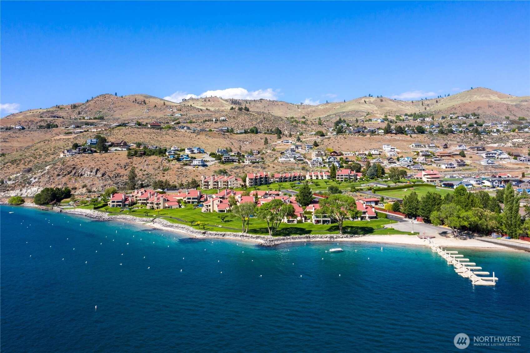 Come see this corner unit with Huge Lake Chelan views at Lake Chelan Shores! Recently updated condo with wood flooring, new kitchen & bath counters, backsplash, fireplace surround & heat pump. Open living and dining with covered deck and BBQ extending your space even further for enjoyment this Spring and Summer. Overlooking the pool and sport court with 180 degree views of Lake Chelan. Perfect for a 2nd home or use as in income producing property. Private carport with storage, 5 pools, tennis and pickleball courts, racquetball/handball/volleyball court, gym, firepit, boat launch and dock on this beautifully landscaped 18-acre gated property. Over 900’ of low bank beach. Fully staffed year-round. 2 miles to the center of town, wineries and restaurants. Furniture included. Pets allowed for owners. *Tourist Accommodation Zoning-Vacation rentals allowed*