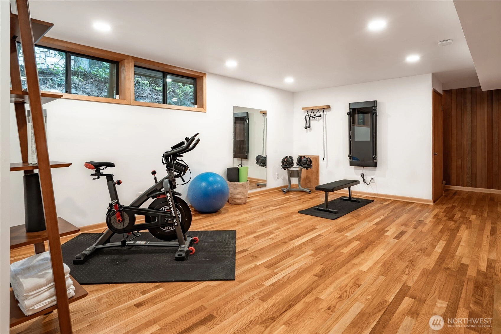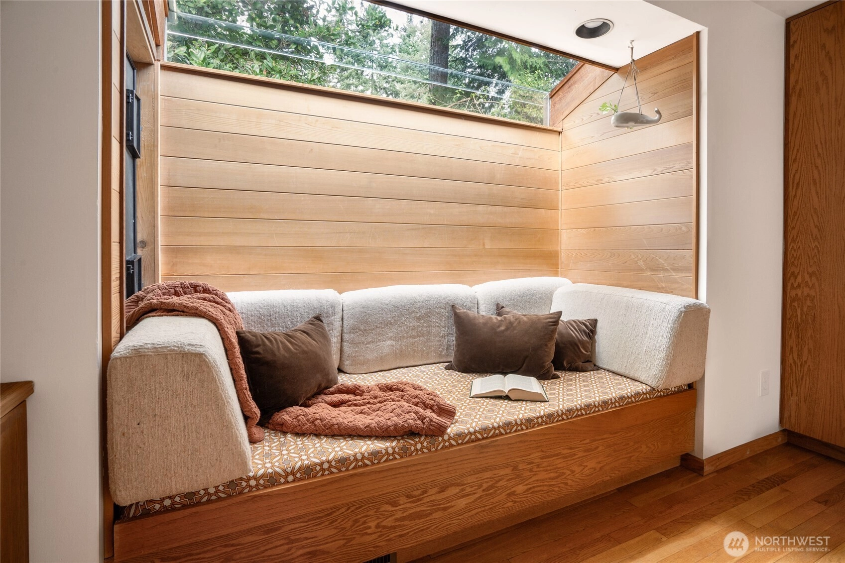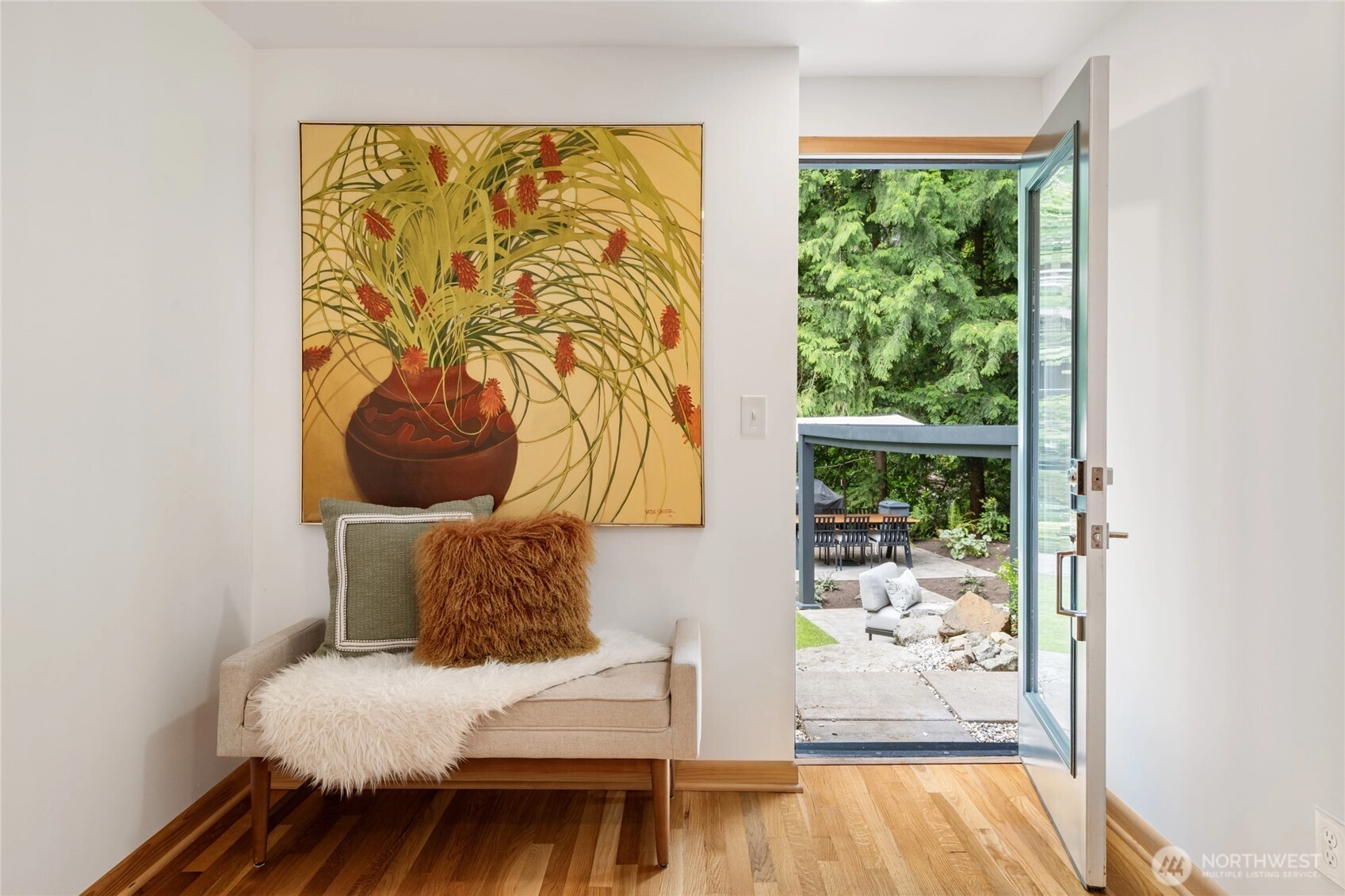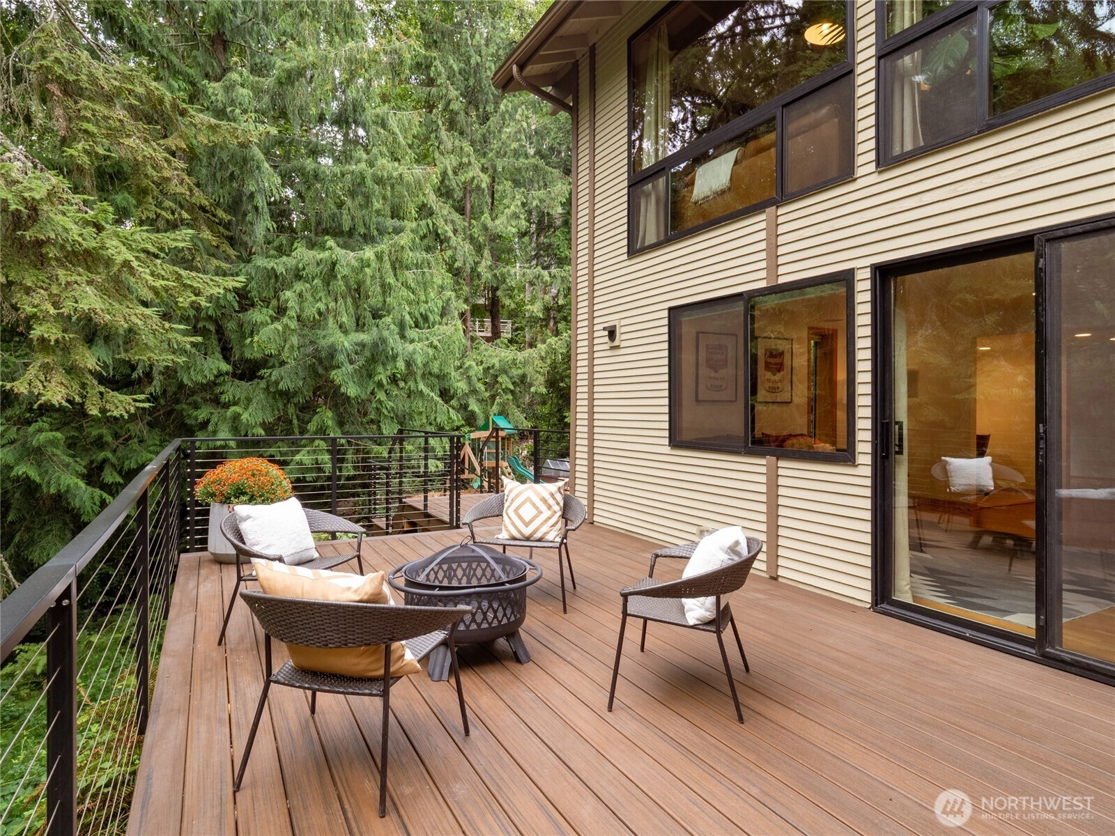 Truly one of a kind! Step into the dramatic skylight atrium & experience a home that perfectly blends iconic mid-century design with modern upgrades. Thoughtfully rebuilt, the owners refinished hardwood floors, preserved vaulted wood ceilings, and chose new fixtures to complement the mid-century modern style - like black floor-to-ceiling windows & a chic Malm fireplace. Major system updates include electric, plumbing, furnace, foundation, windows, new exterior paint, EV charging & a long-life metal roof. Fantastic layout with 4 beds, 4 baths, family room, flex spaces & tons of storage. There is truly room for everyone in this house! Set on nearly half an acre surrounded by trees, this exceptionally private sanctuary features sitting areas, garden beds, a greenhouse, lawn & huge Trex deck.