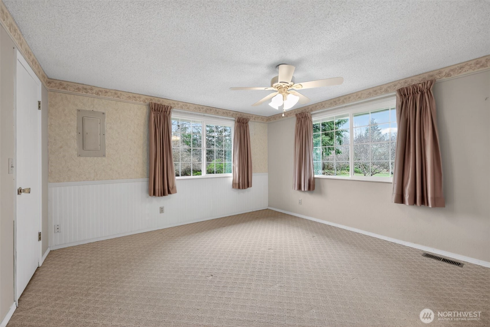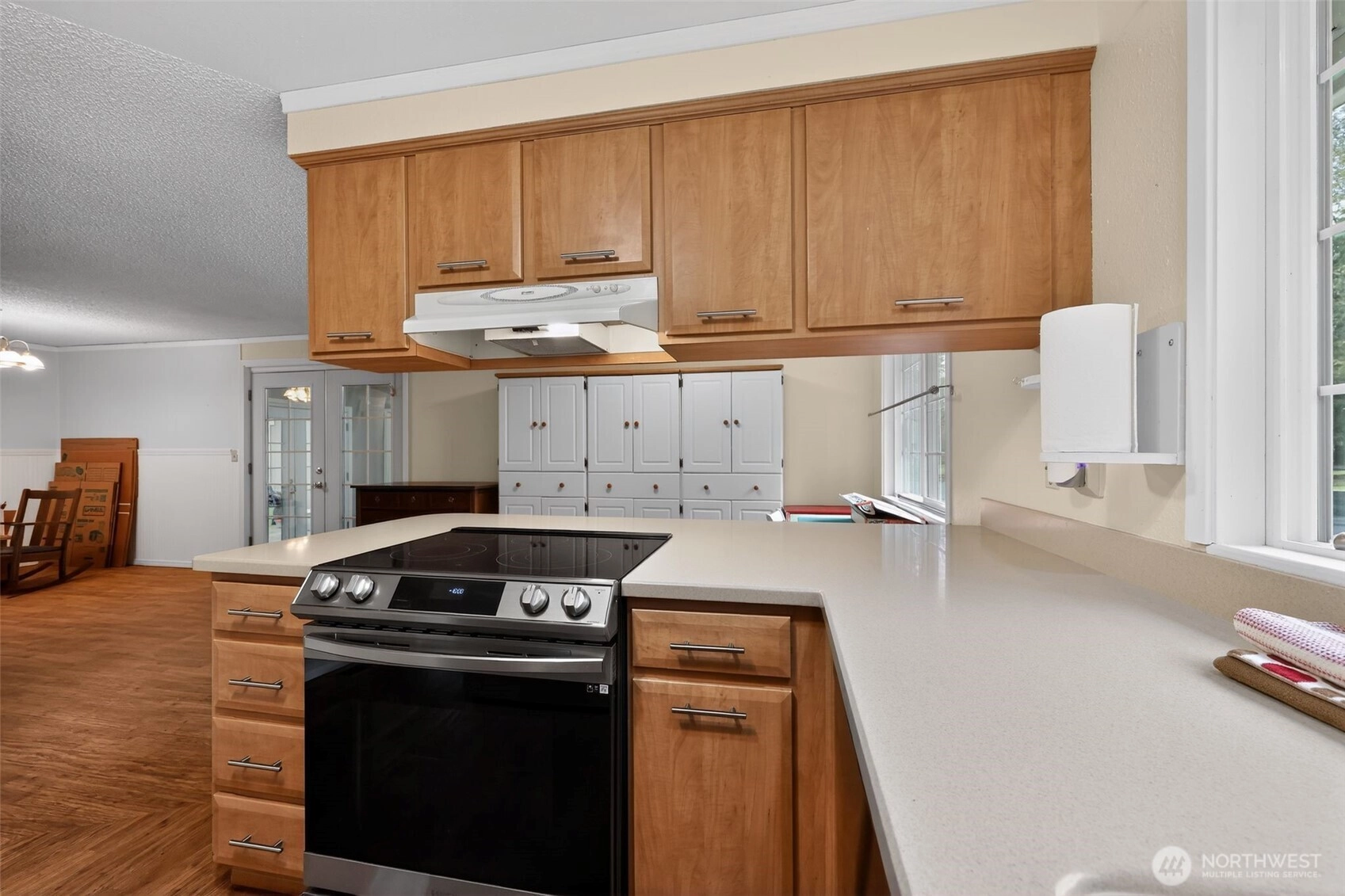 4 acres with open, usable land and established landscaping, this single-level layout offers efficient flow, starting with a spacious living room featuring a fireplace and large front-facing windows for natural light. Adjacent den and great room, includes a second fireplace for split entertainment spaces. Kitchen is equipped with updated appliances, including a refrigerator with bottom freezer, flat-top range, and dishwasher. Dining area flows to a covered patio, extending usable square footage with year-round protection. New roof. Attached heated garage is complemented by a large covered parking area, providing additional sheltered parking and access. Asphalt driveway offers ample parking and easy maneuverability. Property is served by individual well and seller says the water is "So Good!"