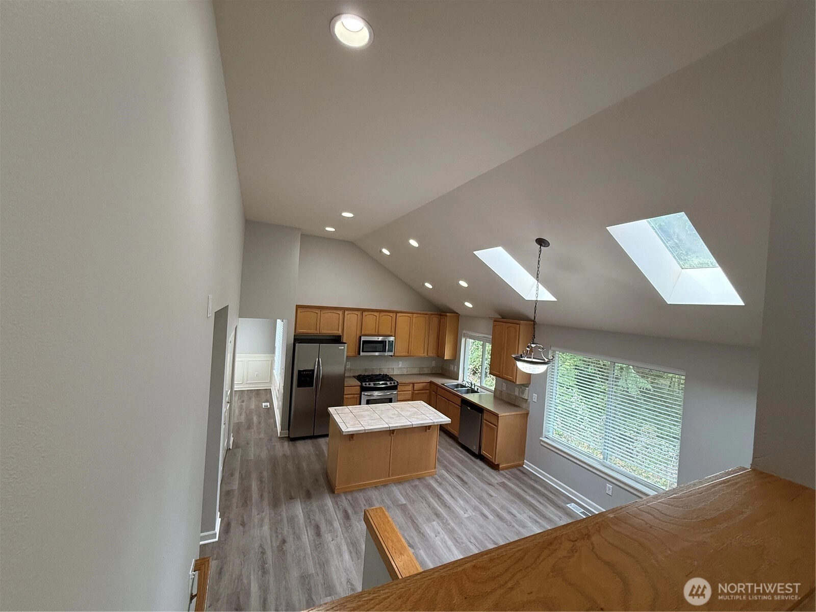 Quality-built by Chaffey Homes and ideally located on a quiet cul-de-sac in Town’s Summit, this Silverdale gem offers convenience just minutes from everything. Featuring brand-new LVP flooring throughout, the home welcomes you with a bright entryway, soaring vaulted ceilings, and an open, airy design.The kitchen is well-appointed with ample cabinetry, a stainless steel appliance package, a gas range, a large pantry, and an entertainment island—perfect for gatherings. Spacious living and dining areas comfortably accommodate full furnishings, making everyday living and entertaining easy. Upstairs, the generous primary suite features vaulted ceilings and a luxurious five-piece bath with a soaking tub. Two additional bedrooms and a full bath complete the upper level. The lower level includes a versatile fourth bedroom or office, a utility room, and a large family room with a cozy gas fireplace. The family room opens to a private deck overlooking the wooded backyard—an ideal setting to unwind and enjoy the peace and quiet. A built-in fire pit adds to the outdoor appeal for crisp fall evenings. Additional highlights include a three-bay garage (two for parking, one for storage), great privacy, and a highly desirable location. Turnkey and thoughtfully designed, this is a rare opportunity you won’t want to miss.
