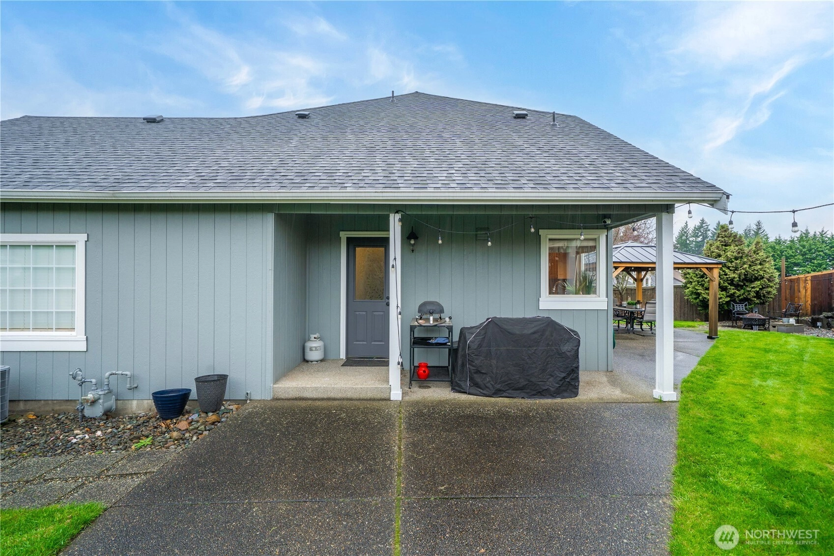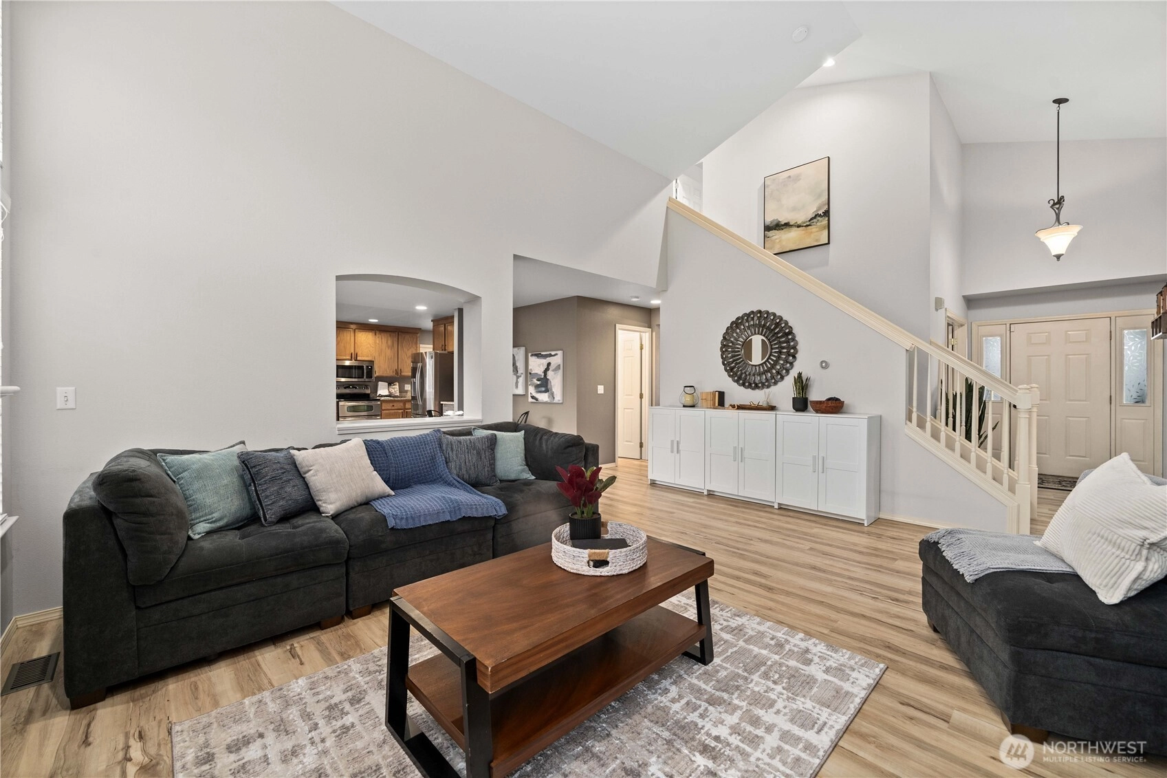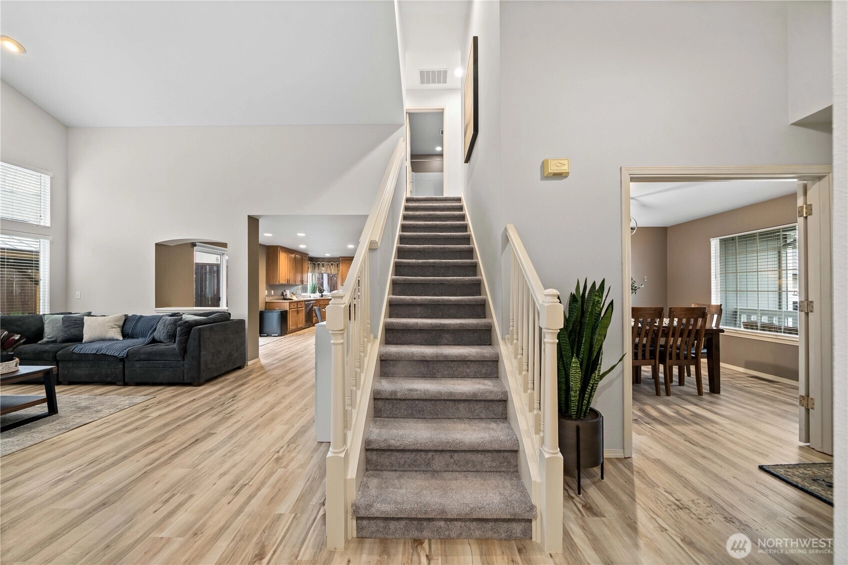 Welcome to Summer Glen, a charming community in the heart of Enumclaw, ideally located near Griffin Avenue with convenient access to local shopping, parks, and everyday amenities. This well maintained home lives large with soaring vaulted ceilings and a dramatic two-story great room feel, where walls of windows fill the living space with natural light. The open kitchen flows easily into the main living area, creating an ideal setting for both daily living and entertaining. Enjoy granite countertops, stainless steel appliances, double ovens, and newer laminate flooring throughout the main floor. The refrigerator and appliances stay, making this truly move-in ready. A mudroom and laundry area just off the garage add convenience and practical storage. A rare main floor primary suite offers comfort and privacy, featuring a beautiful bath with white cabinetry, granite counters, tile flooring, and a designer walk-in shower with frameless glass. The spacious walk-in closet includes built-ins. Upstairs you'll find oversized secondary bedrooms and a full bath. One bedroom is large enough to serve as a bonus space. Outside, enjoy the peaceful backyard complete with a gazebo and storage shed that both stay with the home, creating the perfect setting for outdoor relaxation. Valuable upgrades include a newer roof (2020), furnace, A/C, and water heater (2020), updated insulation, newer appliances including range (2021) and dishwasher (2025). A wonderful opportunity in desirable Enumclaw!