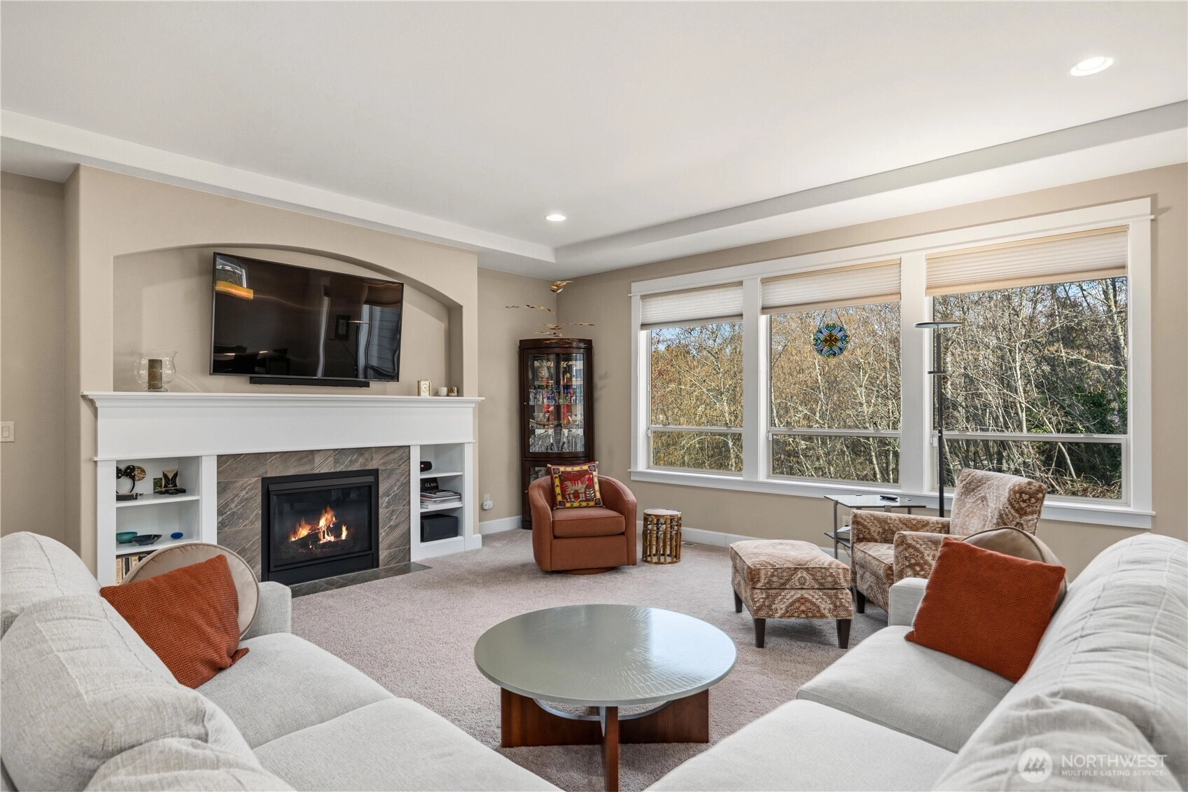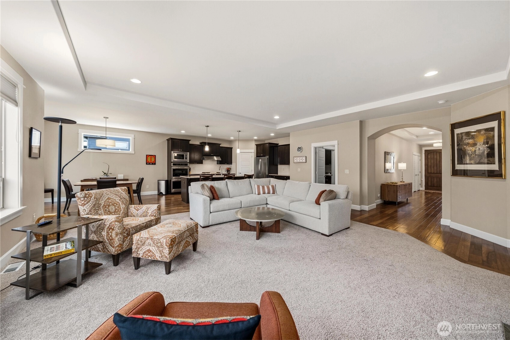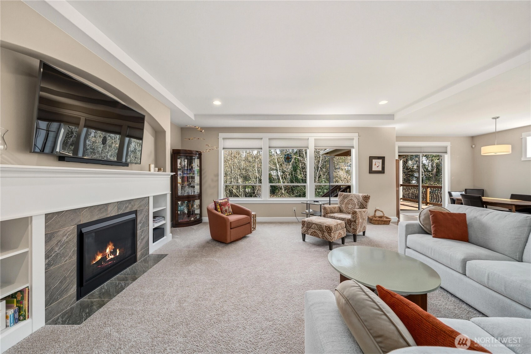 Better Than New: Former Model Home in Salters Point. Experience the perfect blend of privacy, luxury, and convenience in this immaculate 3-bedroom, 2-bathroom rambler plus office. Located in the highly sought-after Salters Point community, this former model home offers peek-a-boo water and mountain views and backs directly onto a lush greenbelt for ultimate serenity. Why "Better Than New"? Avoid the post-closing "to-do" list. This home is truly move-in ready with high-end blinds, all appliances included, and professionally finished landscaping already in place. Thoughtfully designed so every room is exactly where it needs to be: Work from Home: A dedicated office greets you on the left as you enter. Owners enter through the garage into a functional mudroom, conveniently located across from the laundry. The primary suite is strategically separated from the guest bedrooms for a quiet retreat. The expansive living room features a triple bank of windows overlooking the greenbelt, a cozy gas fireplace with custom built-in bookcases, and enough space for multiple furniture configurations. The kitchen is a chef’s dream, designed for both function and social gatherings: Granite countertops and a large island that doubles as an eating bar. Double ovens, built-in microwave, and a 5-burner gas cooktop. A corner pantry conveniently located next to the refrigerator Dining is adjacent to sliding doors that lead to a covered back patio, perfect for year-round enjoyment.