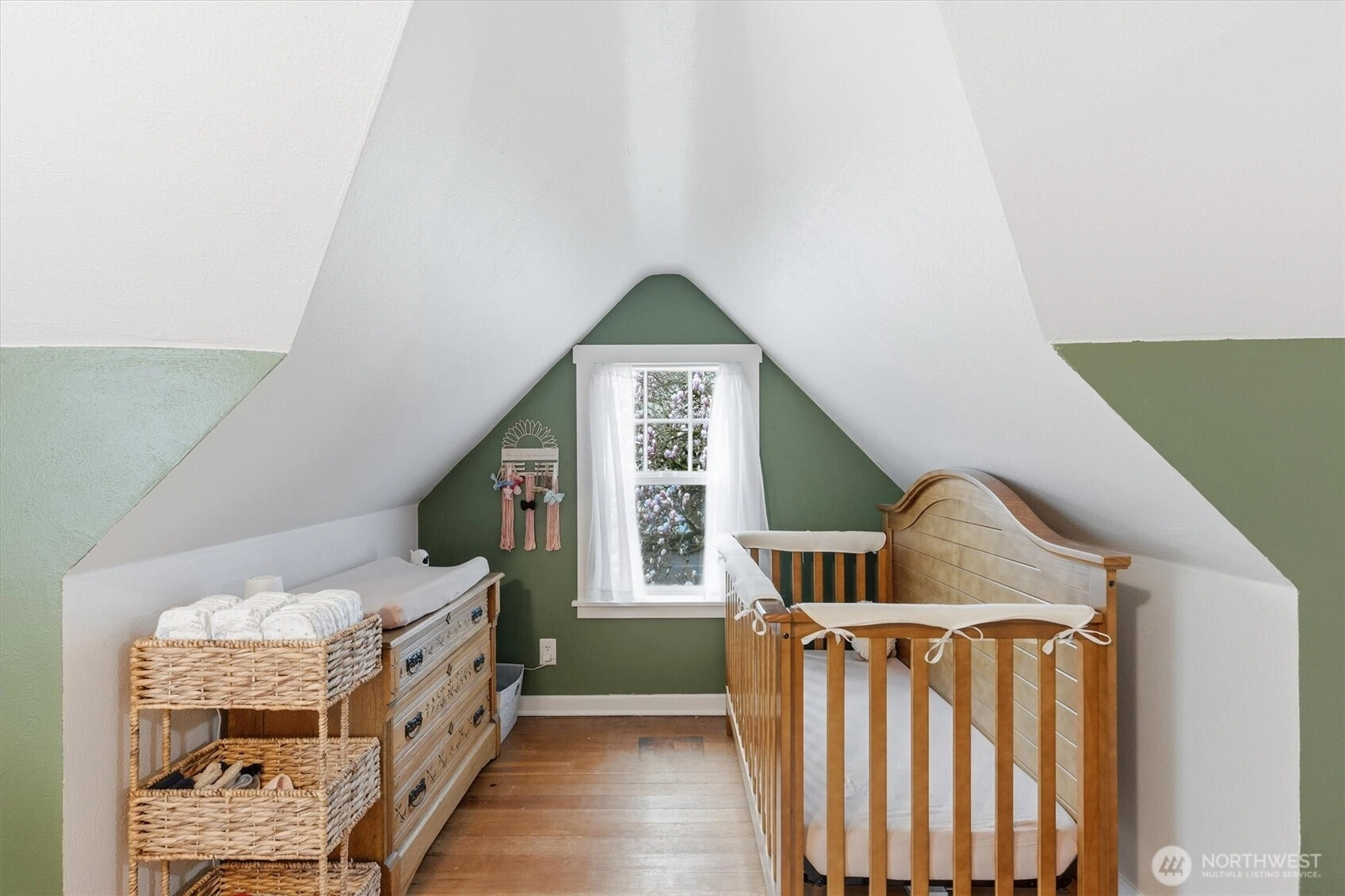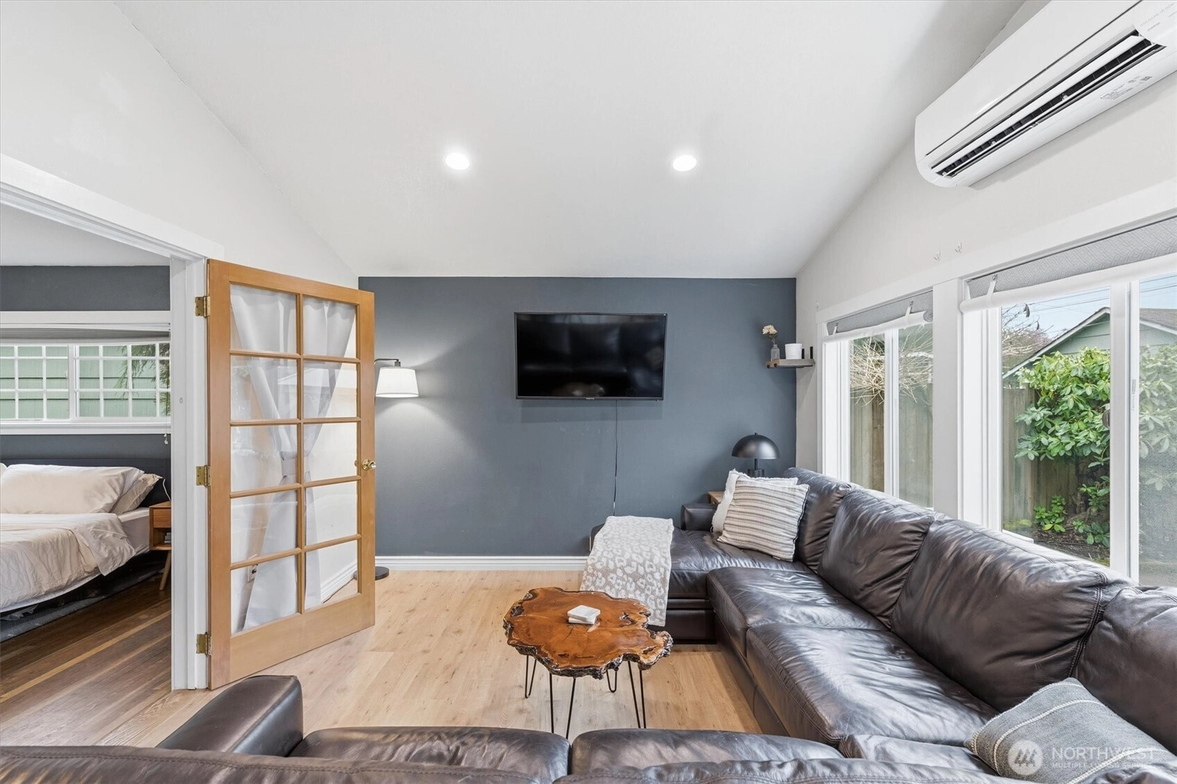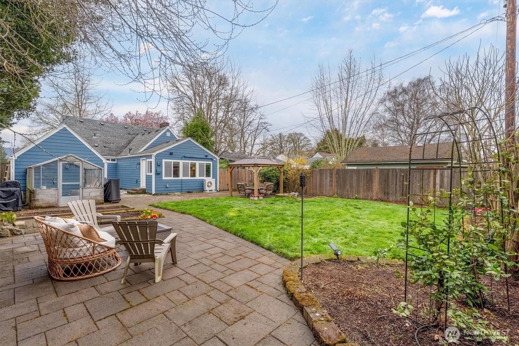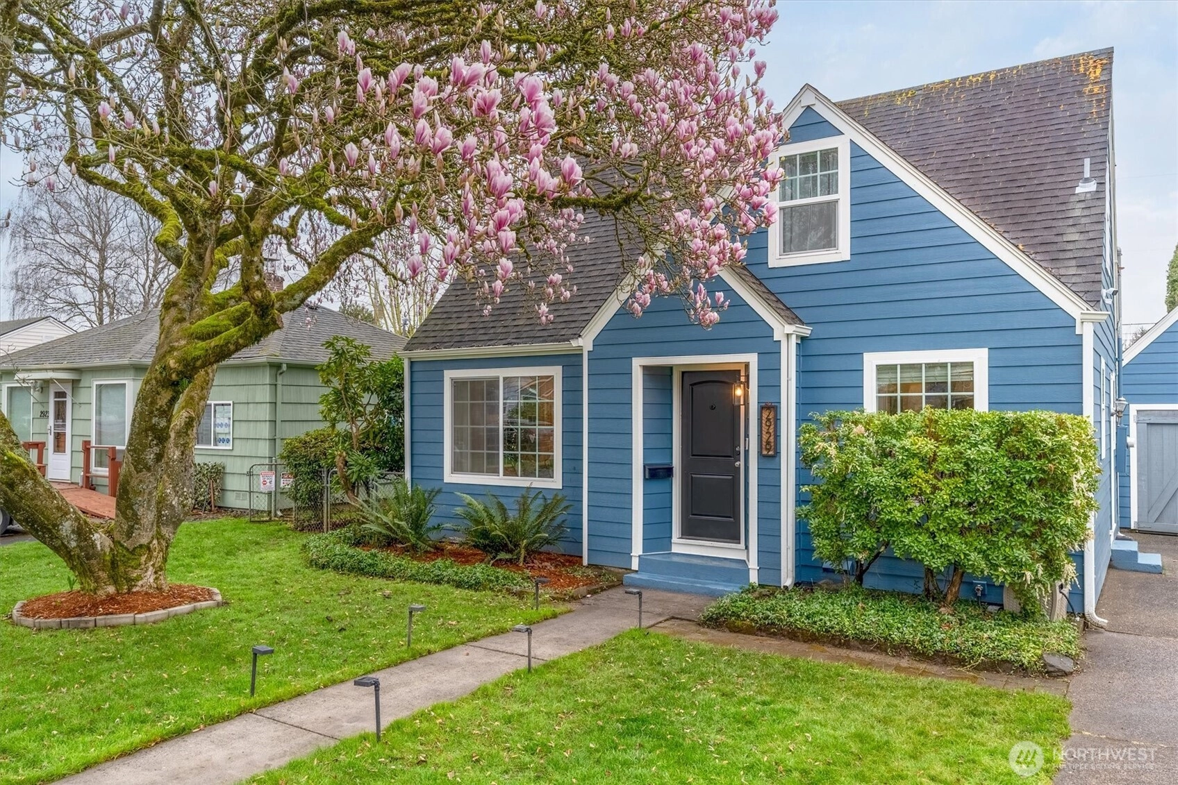 Storybook home with timeless charm and thoughtful modern updates! This 2-bedroom, 1.75-bath home features hardwood floors and a cozy wood-burning fireplace with classic built-in shelving. The kitchen boasts Craftsman-style cabinets, a farmhouse sink, new dishwasher, and a stove with downdraft, perfectly combining style and function. The primary bedroom includes a newly added ensuite bathroom and walk-in closet. French doors open to a bright bonus room with vaulted ceilings and large windows overlooking the meticulously landscaped backyard, creating a peaceful, light-filled retreat. Upstairs offers the second bedroom plus a versatile flex space ideal for a nursery, reading nook, or home office. A ductless mini-split system provides efficient heating and cooling for year-round comfort. Enjoy the outdoors in a beautifully landscaped backyard featuring garden beds, a greenhouse, gazebo, and an inviting stone paver patio—ideal for entertaining or relaxing. Established fig tree and blueberry bushes, along with rose bushes, lilac, jasmine, and peonies, create a vibrant, garden-like setting. The finished detached garage—complete with a built-in sound system and a soon-to-be-installed new garage door offers great potential for a workout room, office, or additional storage. Ideally located just blocks from the lake, this home perfectly blends charm, comfort, and outdoor living. You don't want to miss this one!!