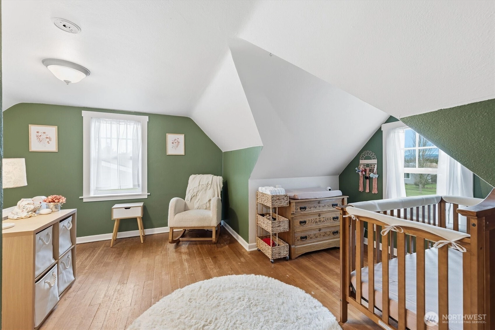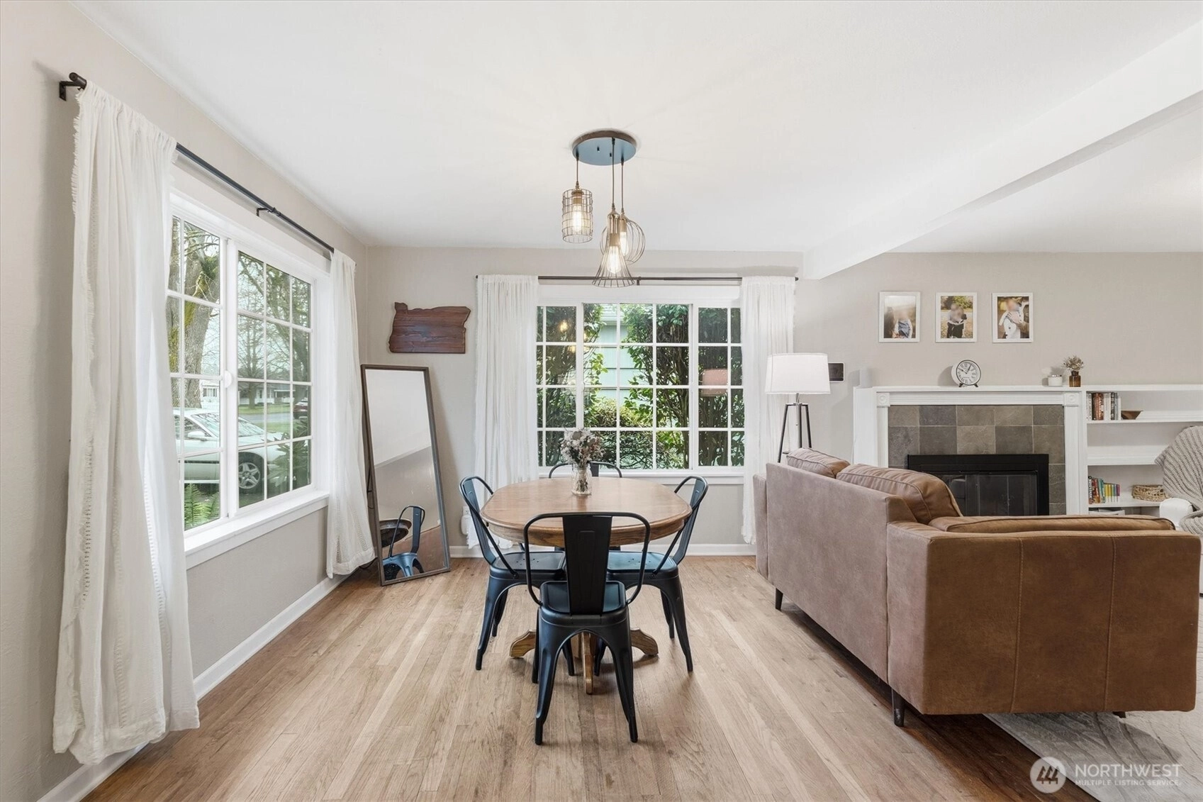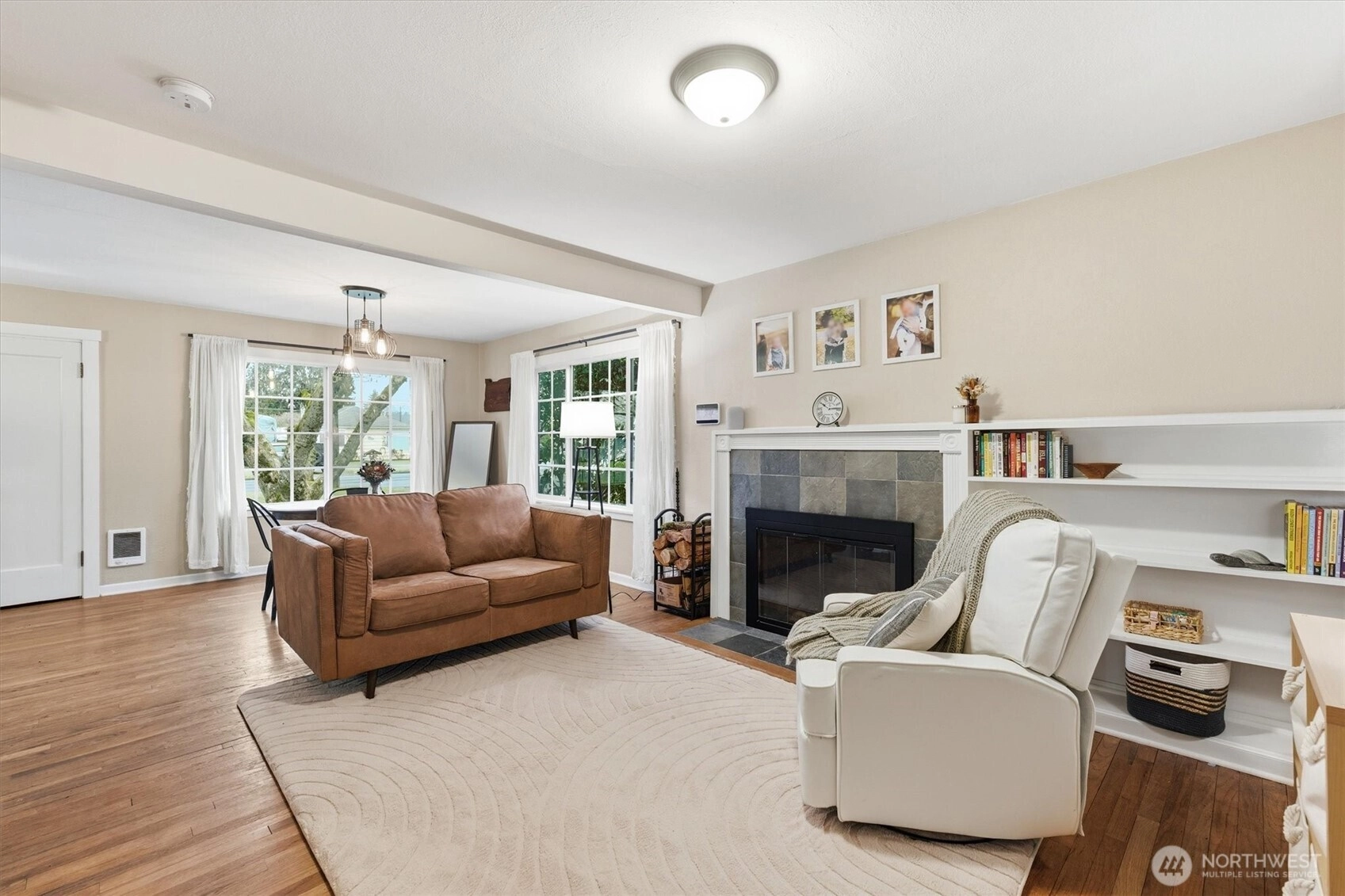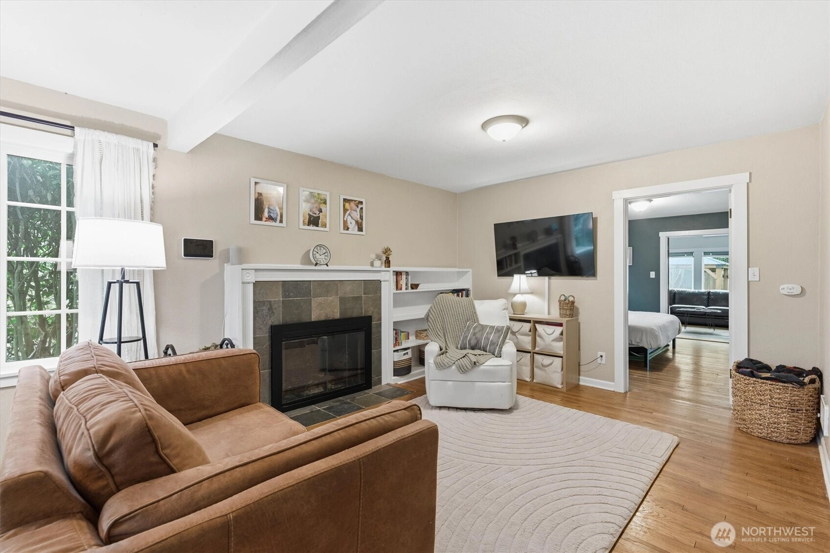 Storybook home with timeless charm and thoughtful modern updates! This 2-bedroom, 1.75-bath home features hardwood floors and a cozy wood-burning fireplace with classic built-in shelving. The kitchen boasts Craftsman-style cabinets, a farmhouse sink, new dishwasher, and a stove with downdraft, perfectly combining style and function. The primary bedroom includes a newly added ensuite bathroom and walk-in closet. French doors open to a bright bonus room with vaulted ceilings and large windows overlooking the meticulously landscaped backyard, creating a peaceful, light-filled retreat. Upstairs offers the second bedroom plus a versatile flex space ideal for a nursery, reading nook, or home office. A ductless mini-split system provides efficient heating and cooling for year-round comfort. Enjoy the outdoors in a beautifully landscaped backyard featuring garden beds, a greenhouse, gazebo, and an inviting stone paver patio—ideal for entertaining or relaxing. Established fig tree and blueberry bushes, along with rose bushes, lilac, jasmine, and peonies, create a vibrant, garden-like setting. The finished detached garage—complete with a built-in sound system and a soon-to-be-installed new garage door offers great potential for a workout room, office, or additional storage. Ideally located just blocks from the lake, this home perfectly blends charm, comfort, and outdoor living. You don't want to miss this one!!