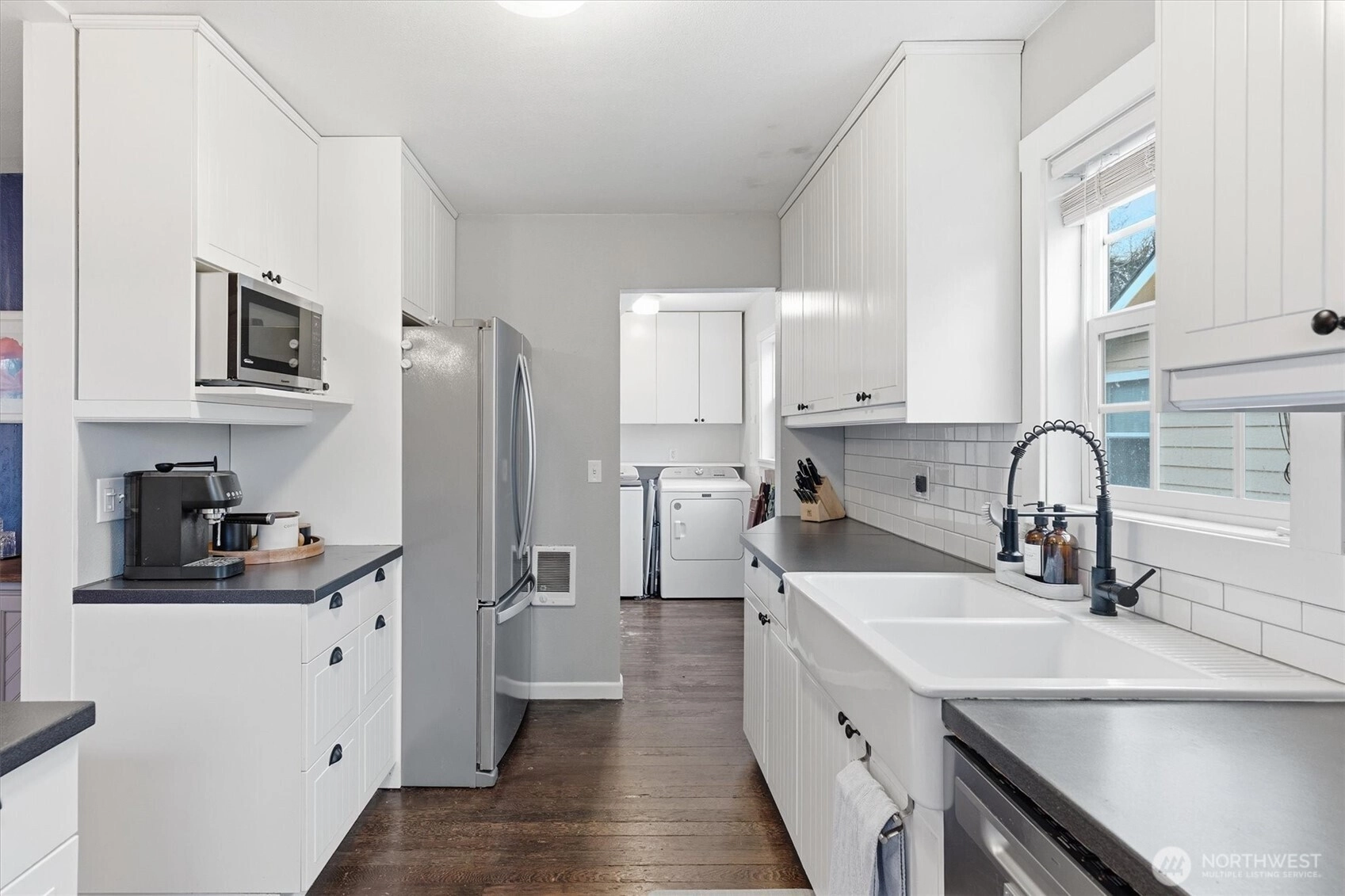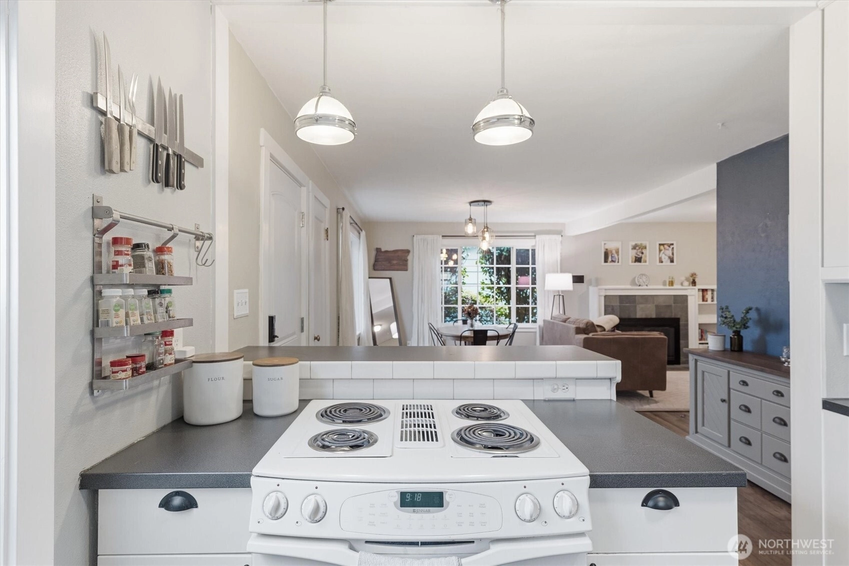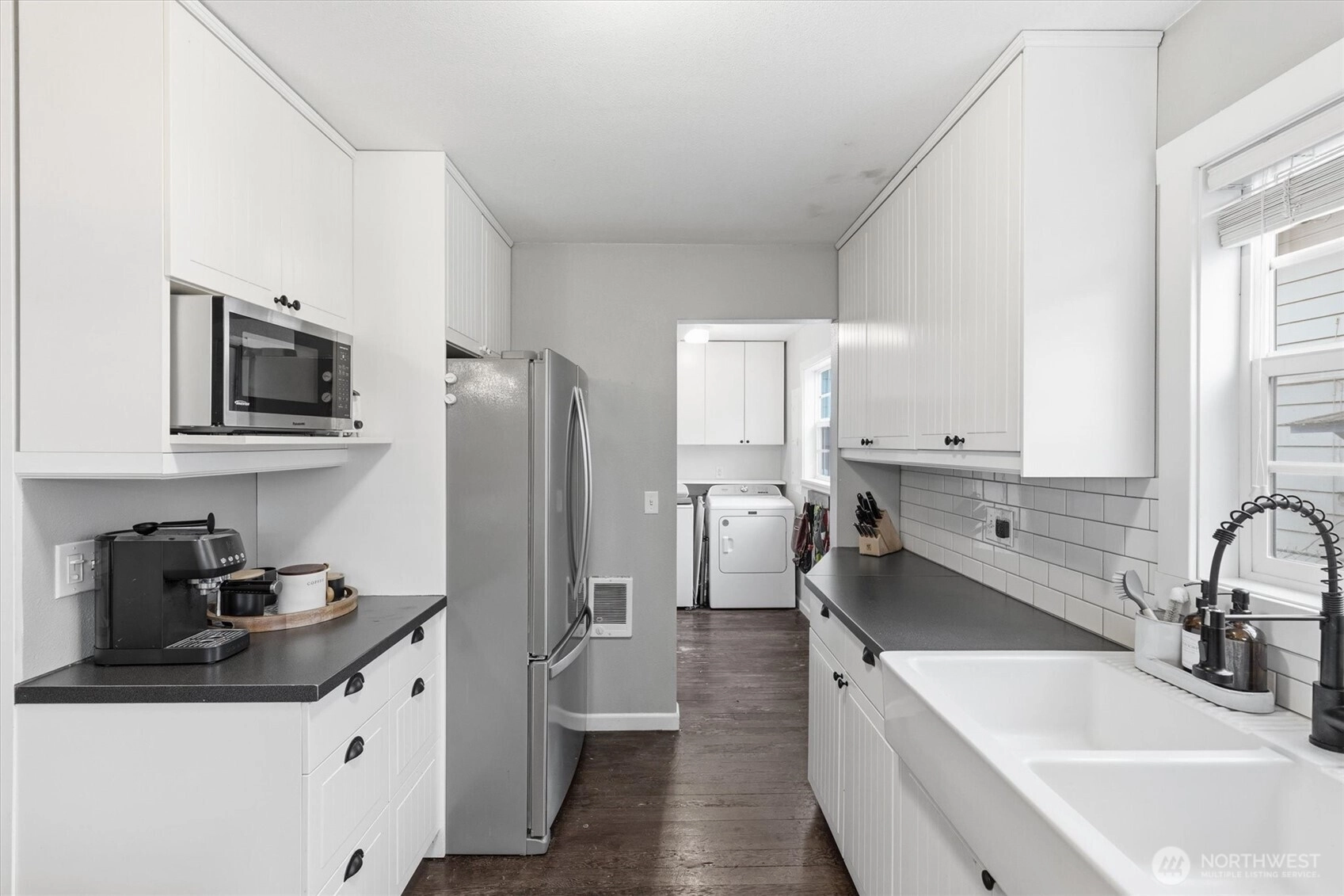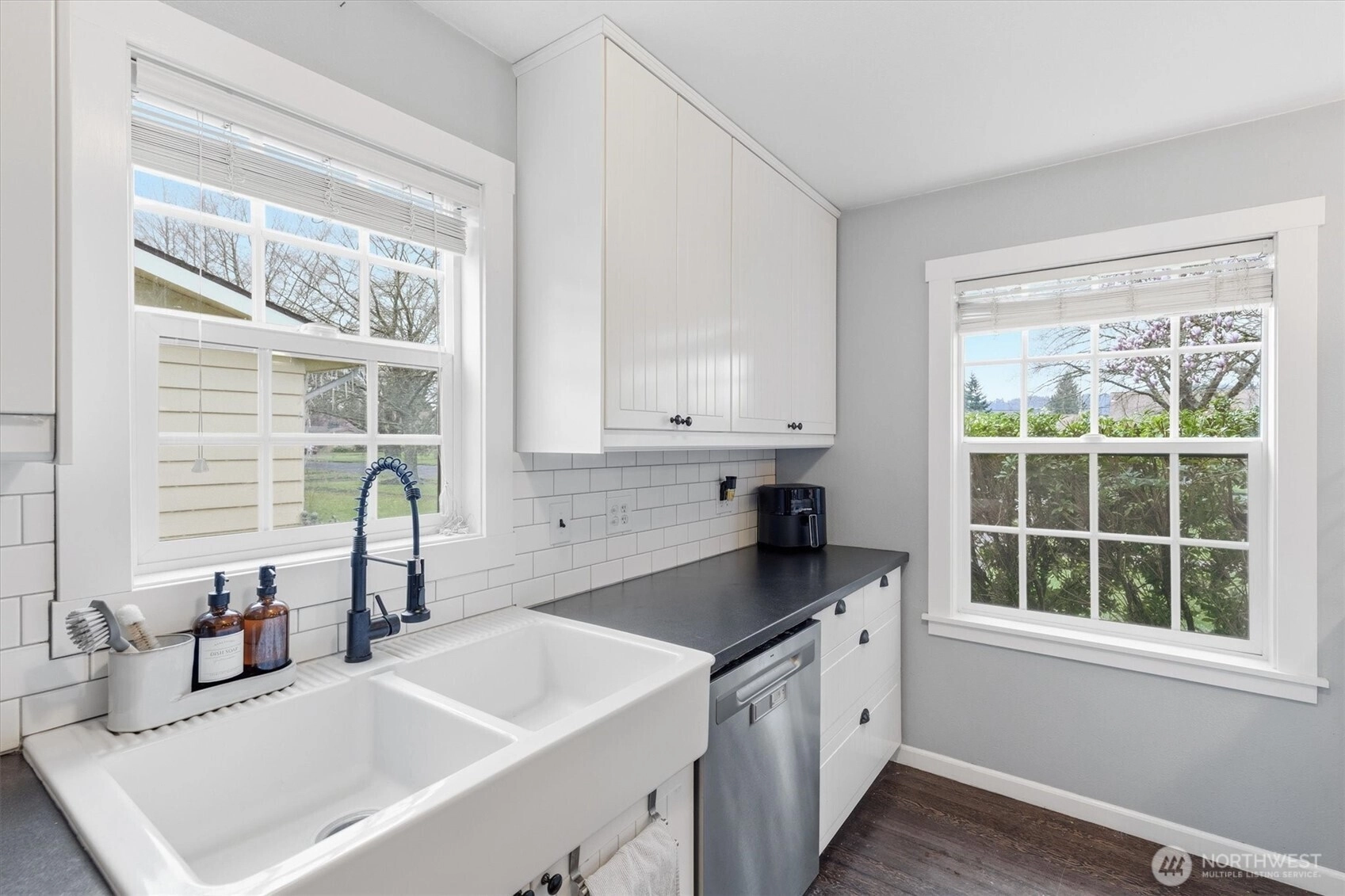 Storybook home with timeless charm and thoughtful modern updates! This 2-bedroom, 1.75-bath home features hardwood floors and a cozy wood-burning fireplace with classic built-in shelving. The kitchen boasts Craftsman-style cabinets, a farmhouse sink, new dishwasher, and a stove with downdraft, perfectly combining style and function. The primary bedroom includes a newly added ensuite bathroom and walk-in closet. French doors open to a bright bonus room with vaulted ceilings and large windows overlooking the meticulously landscaped backyard, creating a peaceful, light-filled retreat. Upstairs offers the second bedroom plus a versatile flex space ideal for a nursery, reading nook, or home office. A ductless mini-split system provides efficient heating and cooling for year-round comfort. Enjoy the outdoors in a beautifully landscaped backyard featuring garden beds, a greenhouse, gazebo, and an inviting stone paver patio—ideal for entertaining or relaxing. Established fig tree and blueberry bushes, along with rose bushes, lilac, jasmine, and peonies, create a vibrant, garden-like setting. The finished detached garage—complete with a built-in sound system and a soon-to-be-installed new garage door offers great potential for a workout room, office, or additional storage. Ideally located just blocks from the lake, this home perfectly blends charm, comfort, and outdoor living. You don't want to miss this one!!