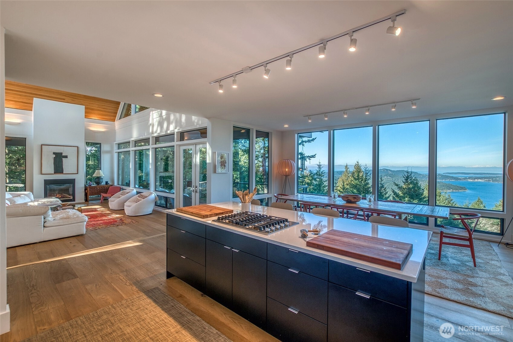 Dazzling water and mountain views from this serene and secluded retreat located on over 18 acres of pristine park-like property. Tastefully renovated in 2023 to become a luxurious contemporary gem. The combination of warmth and modern details create perfect harmony. The Architecturally designed single-level home boasts a stunning primary bedroom with ensuite bath featuring a window-side soaking tub, tiled shower and walk-in closet. Enjoy fireside relaxation from the exterior covered bedroom deck. Spacious living room with a cozy feel and expansive water and forest view windows. Beautifully upgraded kitchen with center work/dining counter and additional dining room for all of your guests. Wide-planked oak floors and quartz countertops throughout. Two inviting guest bedrooms with private baths, high ceilings and a warm, soft light. Separate water view studio with entrance on the lower level has Jotul propane fireplace, ensuite bath, kitchenette and generous deck. Over a mile of developed nature trails wind through the thoughtfully conserved land. Two car garage, hot tub and view decks. Spring Hill Wildlife Sanctuary is 232 acres of beautifully preserved forests with 11 home sites widely separated. Portions of the acreage are in conservation status with San Juan Preservation Trust.