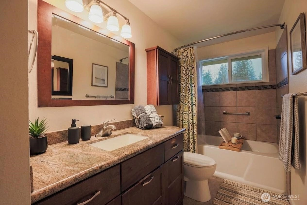 Welcome to this charming rambler on a desirable corner lot in North Bend! This spacious 3-bedroom home offers comfortable one-level living with a bright, open layout. The spacious kitchen features a large island, slab granite counters, stainless steel appliances, abundant cabinetry, and a cozy nook area, flowing seamlessly into the generous family room—perfect for everyday living and entertaining. The home also includes a convenient laundry area and three bedrooms. Enjoy the fully fenced backyard, ideal for pets, play, or relaxing evenings outdoors under your covered patio. Oversized 2 1/2-car garage provides ample parking and storage with the possibility of a second bath w/ heat plus RV parking. Recent updates include a brand-new roof with a transferable warranty for added peace of mind and wired for generator. Conveniently located just minutes from Interstate 90 with easy access to trails, lakes, and hiking, making it easy to enjoy the outdoor lifestyle the Snoqualmie Valley is known for.