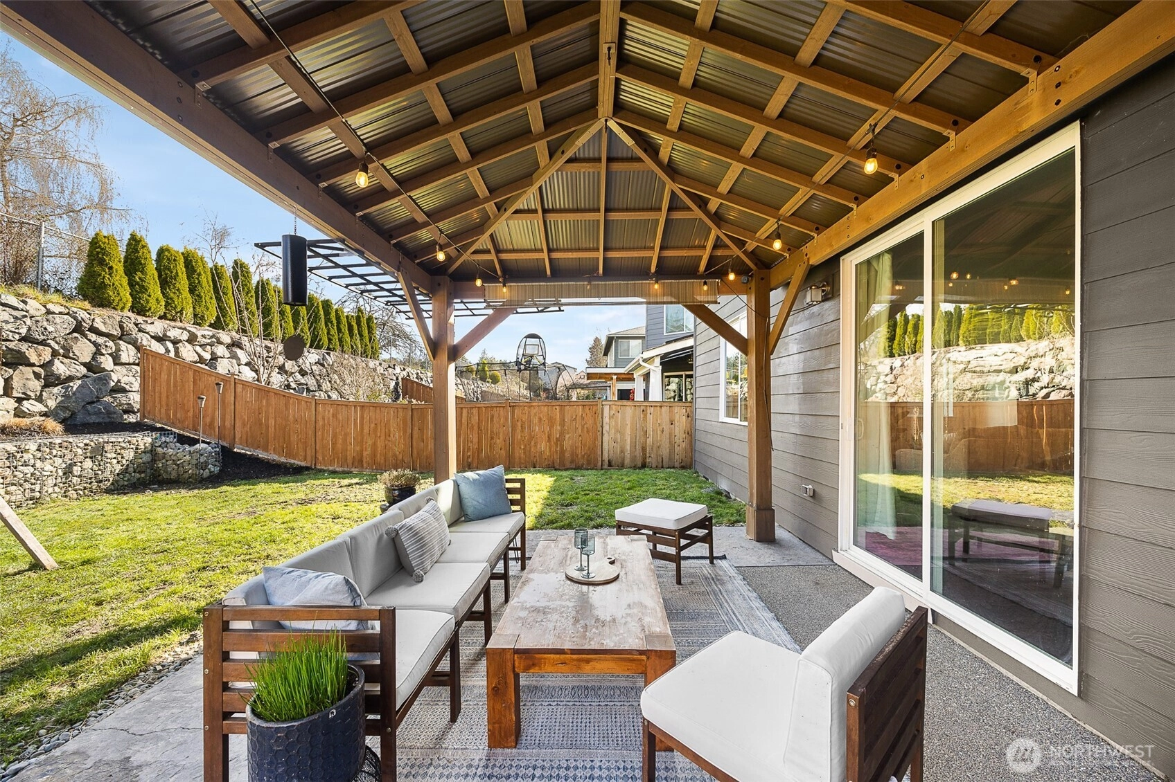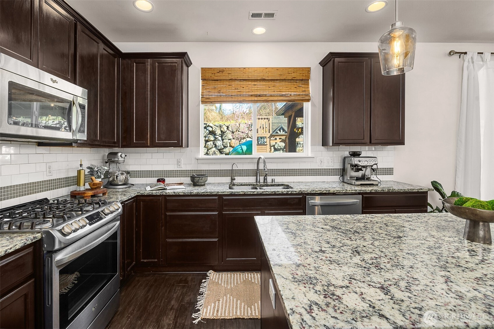 Elegant living meets everyday comfort in this thoughtfully designed home filled with natural light and inviting gathering spaces. Rich hardwood floors flow through the entry, kitchen, and main living areas, while a striking granite-surround fireplace anchors the family room. The kitchen showcases granite slab countertops, stainless steel appliances, crown-molded cabinetry, a full-height subway tile backsplash, and a spacious island ideal for gathering. Fresh interior paint and new carpet create a crisp, move-in-ready feel. The spacious primary suite offers a peaceful retreat with an en-suite bath featuring a soaking tub and generous space to unwind. Additional bedrooms provide comfortable living with ample closet space. A generously sized laundry room includes built-in cabinetry for added storage and functionality. A mudroom with built-in bench and cubbies adds everyday convenience. The fully fenced backyard is designed for relaxing and entertaining with a covered outdoor living area, expanded patio, and tiered retaining wall landscaping that adds character and privacy. Mature landscaping and established trees create a peaceful outdoor setting, supported by a sprinkler system. High-efficiency systems and central A/C provide year-round comfort. Pre-inspected with report available. Minutes to Hwy 9, parks, schools, shopping, and commuter routes.