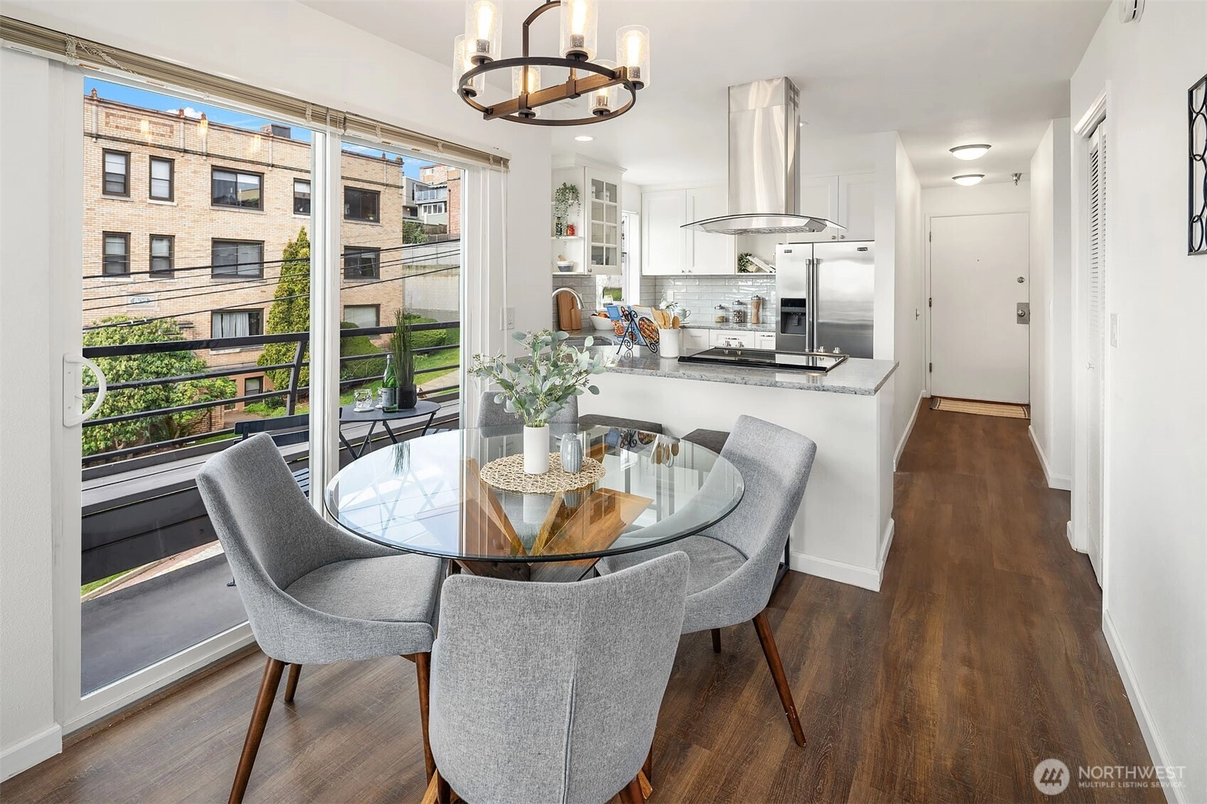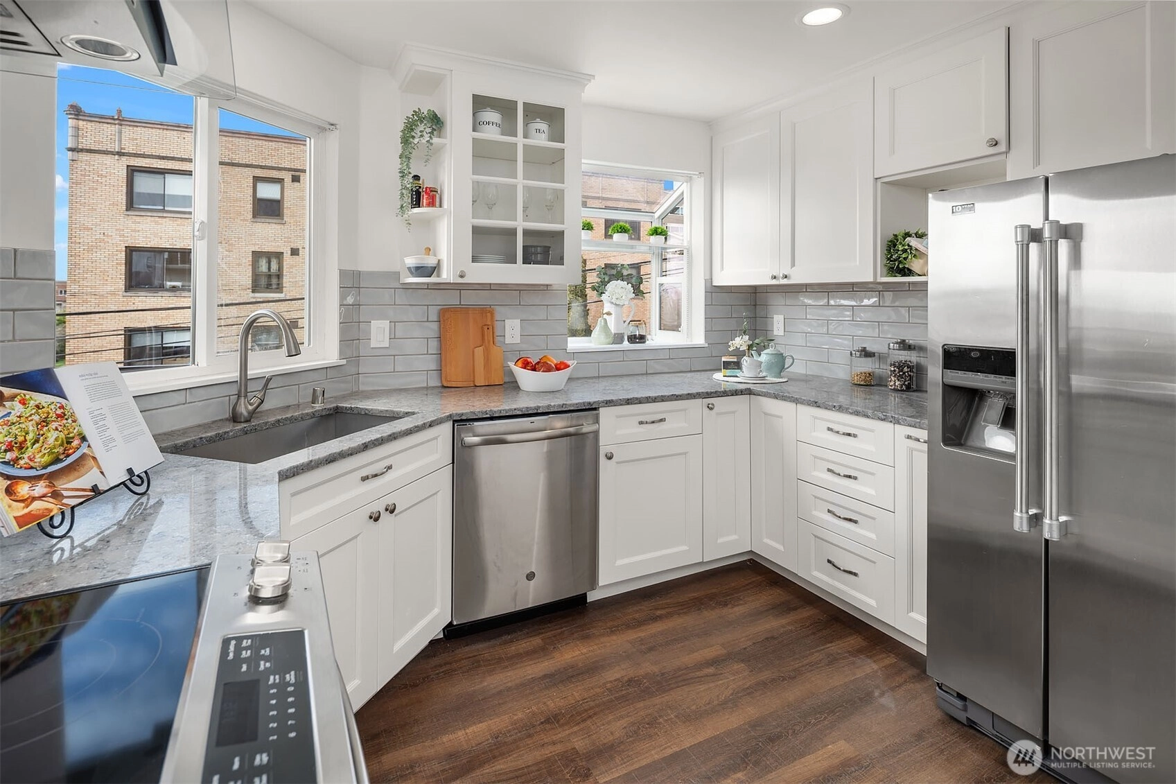 A quintessential Seattle location and perched on a quiet side street, this spacious and light-filled condo feels like home. Superb location in the sought-after Queen Anne community, you'll enjoy both City and Space Needle views from your private corner unit. Beautifully updated throughout, featuring a modernized kitchen with custom cabinetry, slab quartz countertops, full-height tile backsplash and newer appliances including a range hood for venting. Gorgeous, like-new bathrooms include today's rich & neutral designer tiles, new fixtures, sinks and custom vanities. Generously sized primary bedroom has en-suite bathroom, two large closets and more iconic city views. Versatile second room can function as bedroom or office. Additional features include in-unit laundry, a cozy wood-burning fireplace and fresh paint. Relax and savor the magnificent year-round Seattle sunsets from your west-facing deck. Dedicated, secured parking and private additional storage room off garage are included. A great walking score, just minutes from both upper and lower Queen Anne, Seattle Center, Downtown, the newly designed Seattle Waterfront, and South Lake Union. Offering the best of urban living in one of Seattle's most desirable neighborhoods!