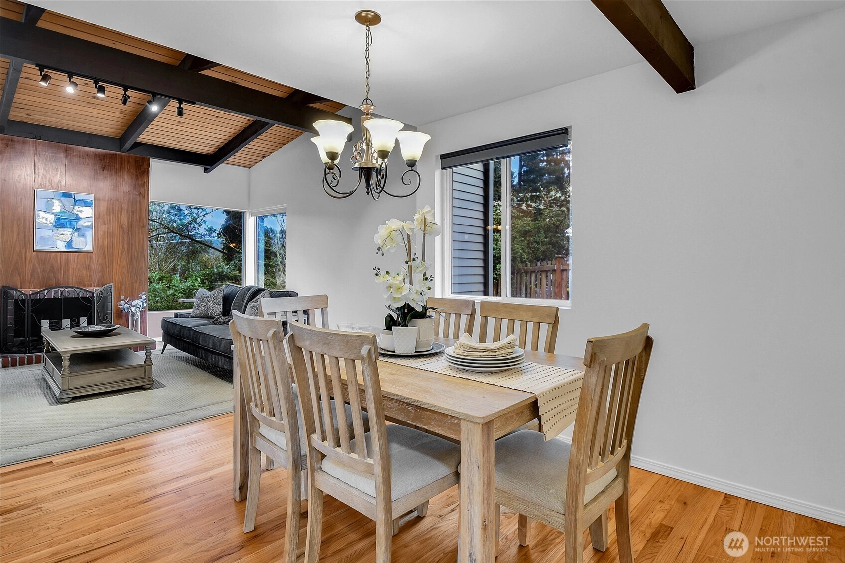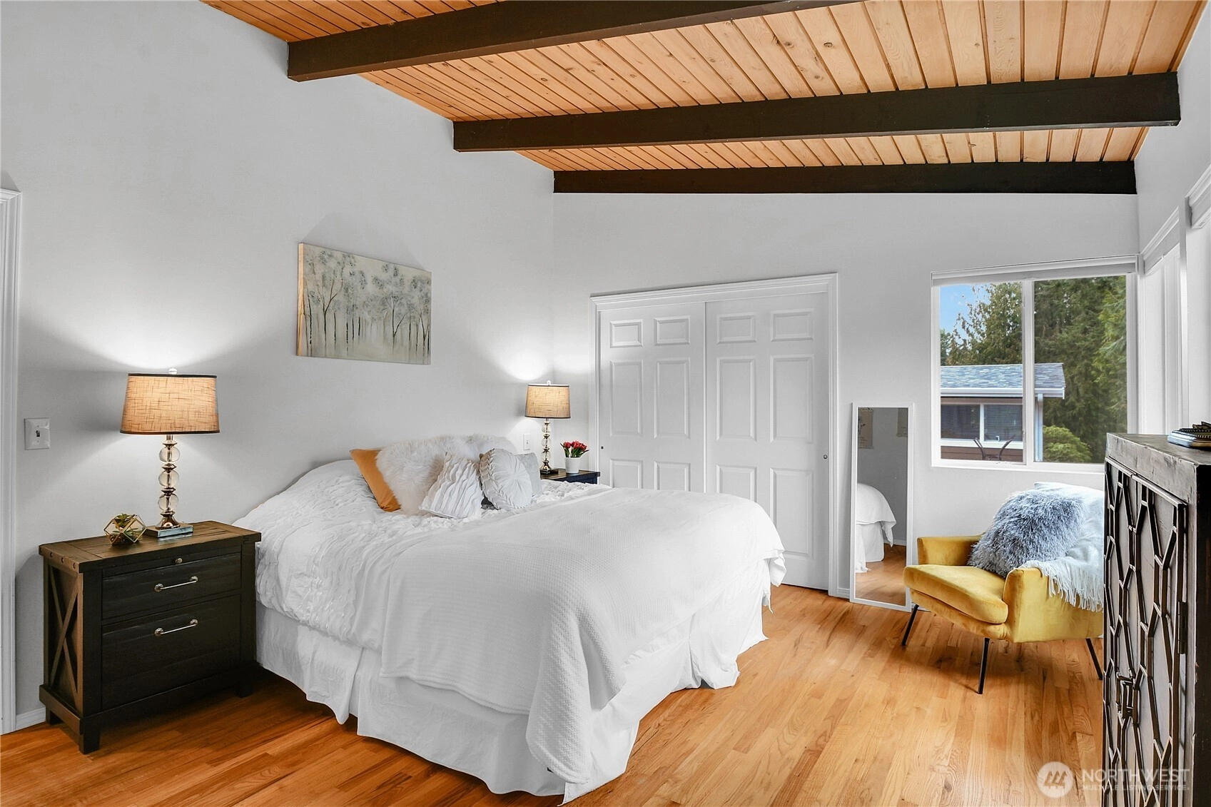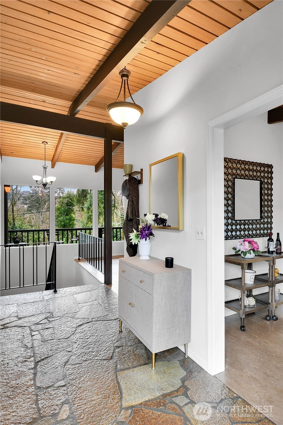 Spacious and light-filled home in the desirable Newport Hills neighborhood offering 2,940 SF, 4 bedrooms, and multiple gathering spaces designed for comfortable living and entertaining. The main level features a wood burning fireplace, soaring alpine wood-beamed ceilings and expansive windows that open to serene greenbelt views, creating a warm and inviting atmosphere throughout the living spaces. The kitchen includes an eat-in breakfast nook and connects easily to the formal dining area, making it ideal for both everyday living and hosting. The main level also offers a private primary suite with ensuite bath, along with two additional bedrooms. Downstairs, the expansive lower level provides exceptional flexibility with a large rec room featuring a wood-burning fireplace, wet bar, and refrigerator, perfect for movie nights, game days, or entertaining guests. A fourth bedroom with a full bath on this level creates an ideal space for guests. Enjoy the outdoors from two separate outdoor living areas, including an upper-level deck overlooking the greenbelt and a lower patio with access to a private yard. Additional highlights include abundant storage and covered parking for two vehicles. Conveniently located minutes to I-405 and I-90, with easy access to the shopping, dining, and amenities of Factoria and Newcastle, this home offers space, comfort, and a fantastic Eastside location in the coveted Bellevue school district.