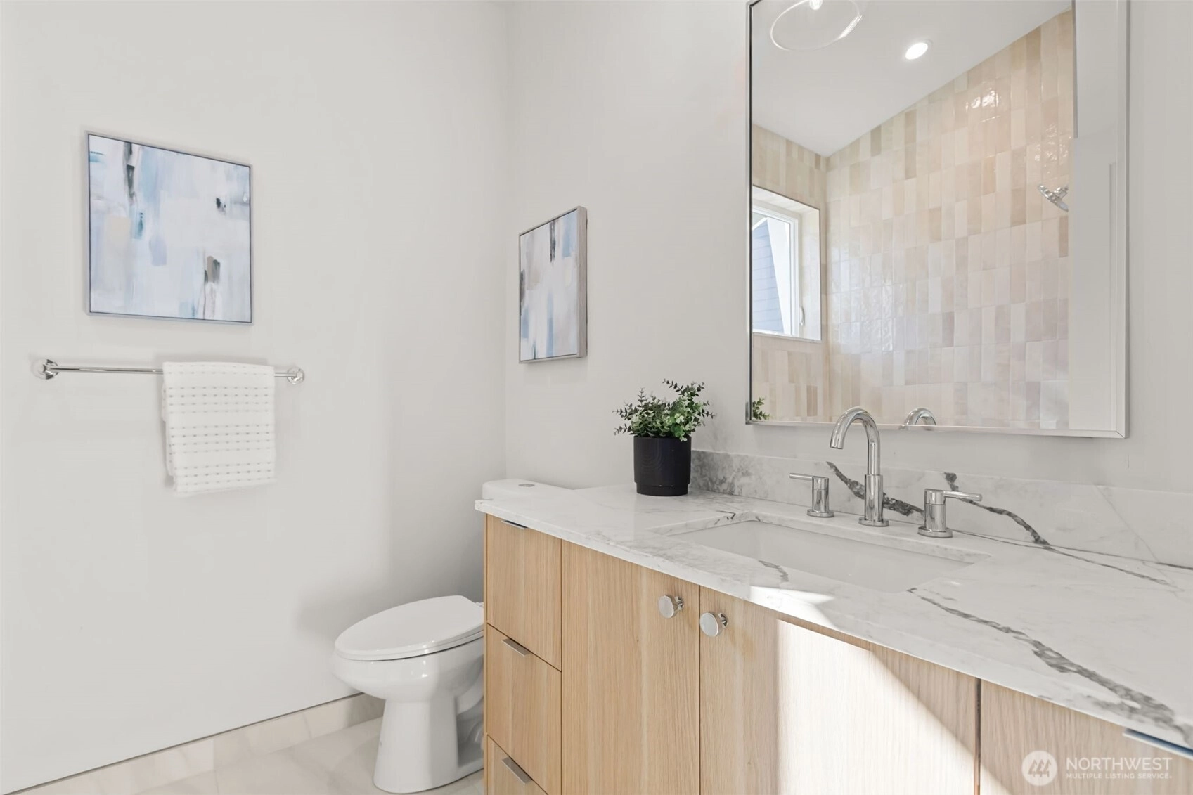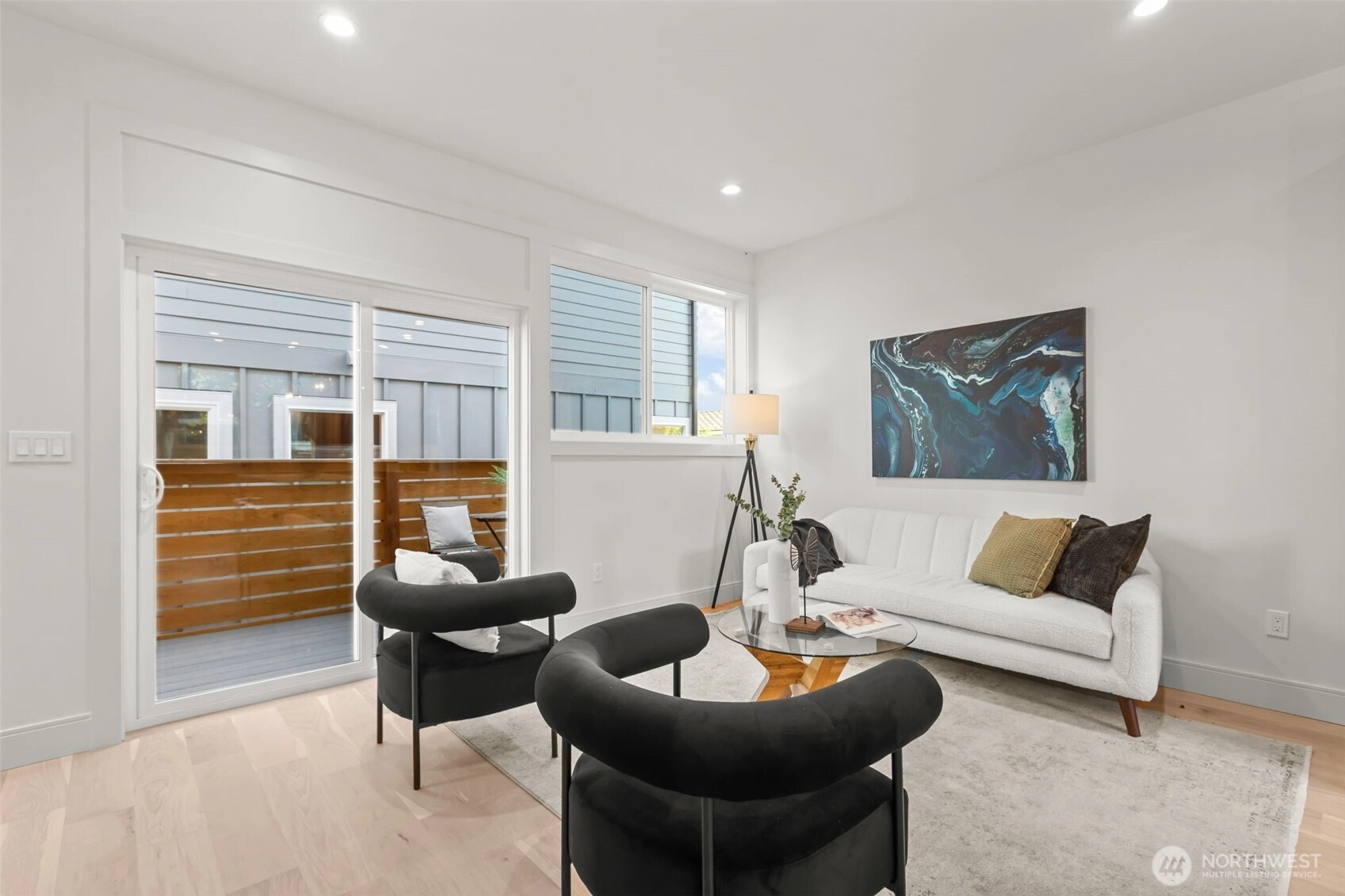 Nestled just steps from Loyal Heights Playfield, this charming 2 bed, 1.5 bath home welcomes you with warmth, light, and thoughtful design. The open-concept main floor features a stunning chef’s kitchen with a 36" range, oversized island, and elegant finishes—perfect for cooking, entertaining, or simply gathering with friends. Natural light pours through large windows, enhancing the bright, airy feel throughout. Upstairs, vaulted ceilings add space and serenity to both bedrooms. A cozy deck invites moments of relaxation year-round. With dedicated parking, 1,066 sq ft of smartly used space, and proximity to Ballard’s favorite coffee shops, restaurants and parks, this home blends modern comfort with neighborhood charm.