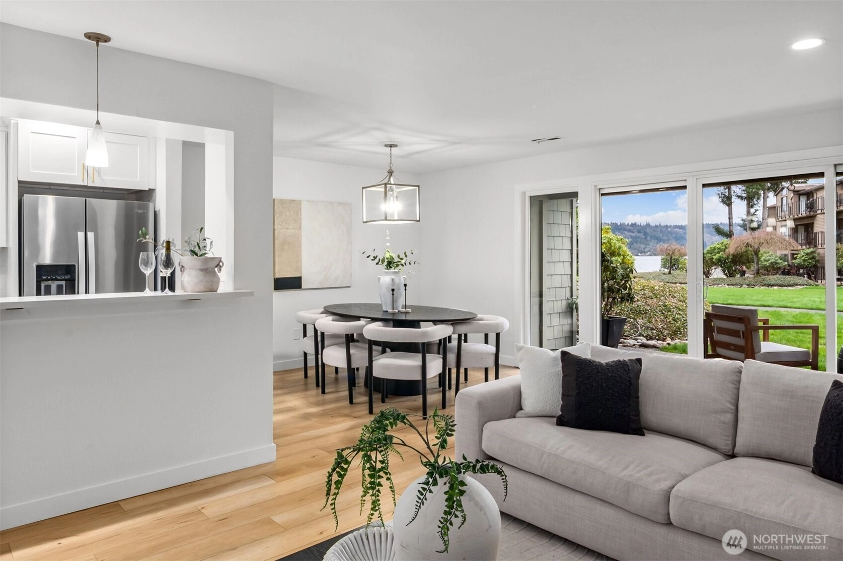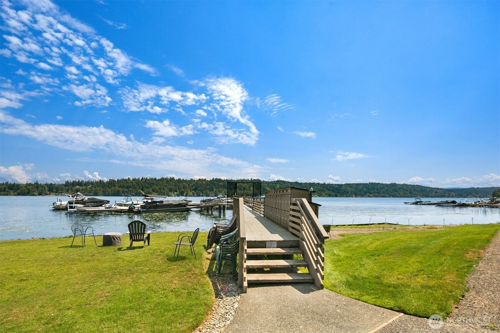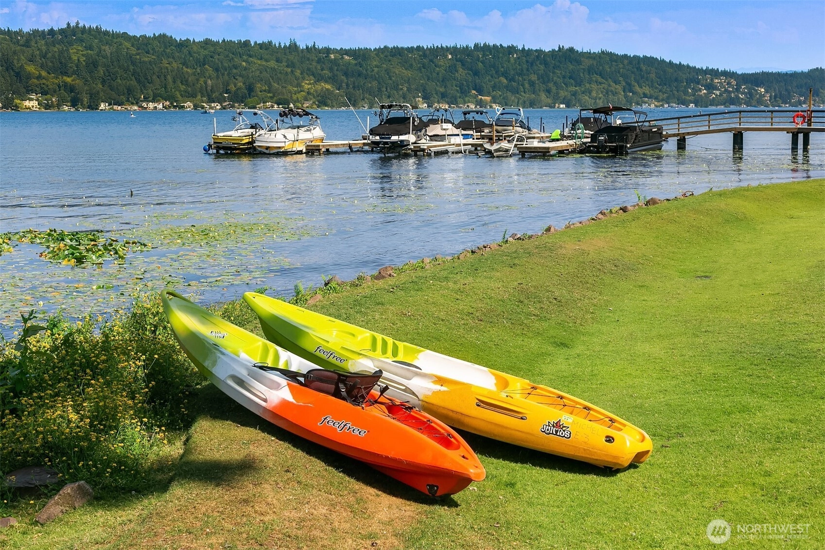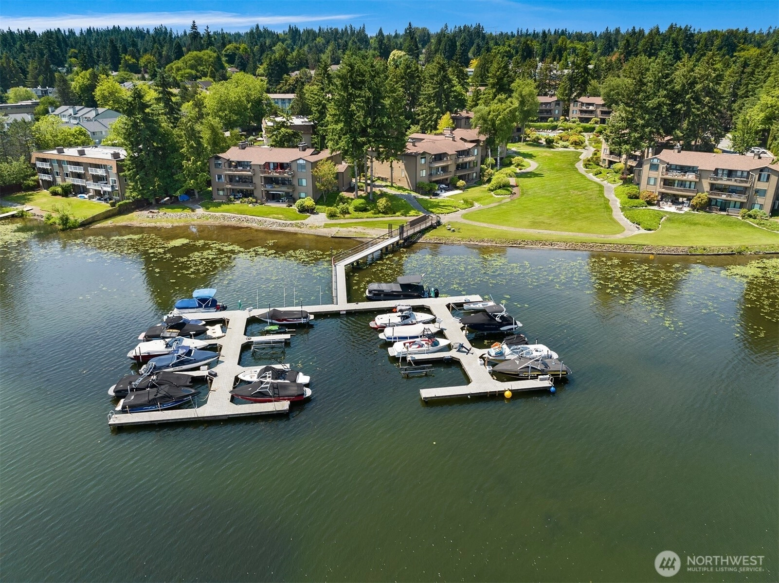 A true retreat for the at-heart lake lover, this rare 3-bedroom + flex room residence on Lake Sammamish offers the largest floor plan, captivating water views, and a DEEDED boat slip. Nestled within the coveted Lake Villas, a gated, resort-style community, you’re welcomed home by lush, manicured grounds & a sense of everyday escape. Perfectly south-facing, this light-filled & tastefully updated retreat features a spacious living area w/ stunning lake views, a cozy fireplace, & a charming coffee bar—flowing seamlessly to a walk-out patio, ideal for sunrise mornings & glowing sunset evenings over the water. The timeless kitchen shines w/quartz countertops, newer appliances, & sleek modern cabinetry, while updated baths, fresh finishes, & a newly painted interior create an ELEVATED LIVING experience. A versatile flex space offers endless possibilities—home office, fitness studio, or additional storage. Enjoy highly sought-after, sizable deeded boat moorage, making spontaneous lake days effortless—from early morning surf sessions to sunset cruises. Two reserved parking spaces, EV charging station, & ample interior & patio storage add ease to everyday living. At Lake Villas, pride of ownership is evident w/ beautifully maintained grounds, an outdoor pool, hot tub, sauna, clubhouse, gym, & space for kayaks/paddleboards. Ideally located near Microsoft, Idylwood Park, Marymoor Park, & light rail—this is more than a home; it’s a lifestyle, where every day begins & ends with the water.