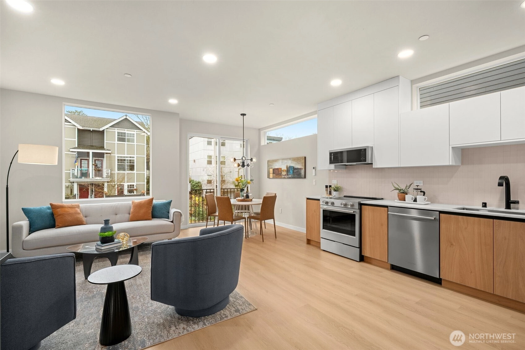 Space, light, and rare convenience come together at Lincoln on Capitol Hill—where a larger floor plan and attached garage set this home apart. The entry level features a private garage and foyer, providing everyday ease along with valuable storage. One level up, the main living floor is expansive and open, with a seamless flow between kitchen, dining, and living areas—ideal for both daily living and entertaining. The kitchen is anchored by quartz countertops, stainless steel appliances, and custom cabinetry, blending clean design with practical function. The middle level hosts two bedrooms and a full bath, creating flexibility for guests, shared living, or work-from-home needs. Upstairs, the primary suite level offers a private retreat with a spacious bedroom, walk-in closet, ensuite bath, and convenient laundry—thoughtfully positioned for everyday ease. At the top, a private rooftop deck extends your living space outdoors, offering sweeping territorial views, including glimpses toward the Seattle skyline and Space Needle—perfect for entertaining or unwinding above the city. Located in the heart of Capitol Hill, you’re just moments from top restaurants, coffee shops, parks, and nightlife, with easy access to Light Rail, downtown, and South Lake Union. Plus, take advantage of builder-sponsored financing with rates starting at 4.99% for the first 10 years.
