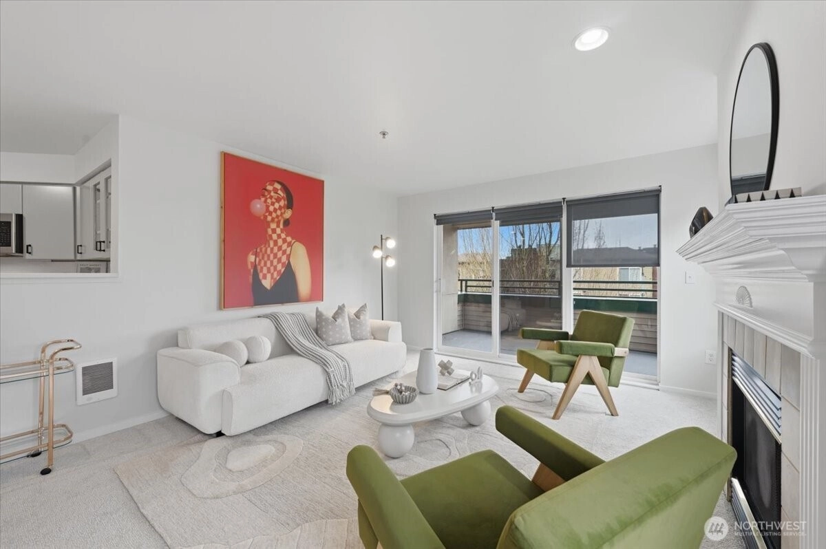 Beautifully refreshed corner unit condo in the heart of Greenwood, filled with natural light and open living spaces. Fresh paint, new flooring, updated lighting, and modern hardware create a clean, inviting feel throughout. The kitchen features stainless steel appliances and ample space for cooking and gathering.Spacious living and dining areas flow seamlessly to a private balcony—perfect for morning coffee—while a gas fireplace adds warmth and charm.The primary suite offers a walk-in closet and en-suite ¾ bath, with a generously sized second bedroom and full bath ideal for guests, a home office, or additional living space.Secure garage parking, multiple in-unit closets, and an additional storage locker provide excellent storage. Just blocks from Trader Joe's, restaurants, and neighborhood amenities. Well-maintained building with strong HOA. Enjoy easy city living at an approachable price.
