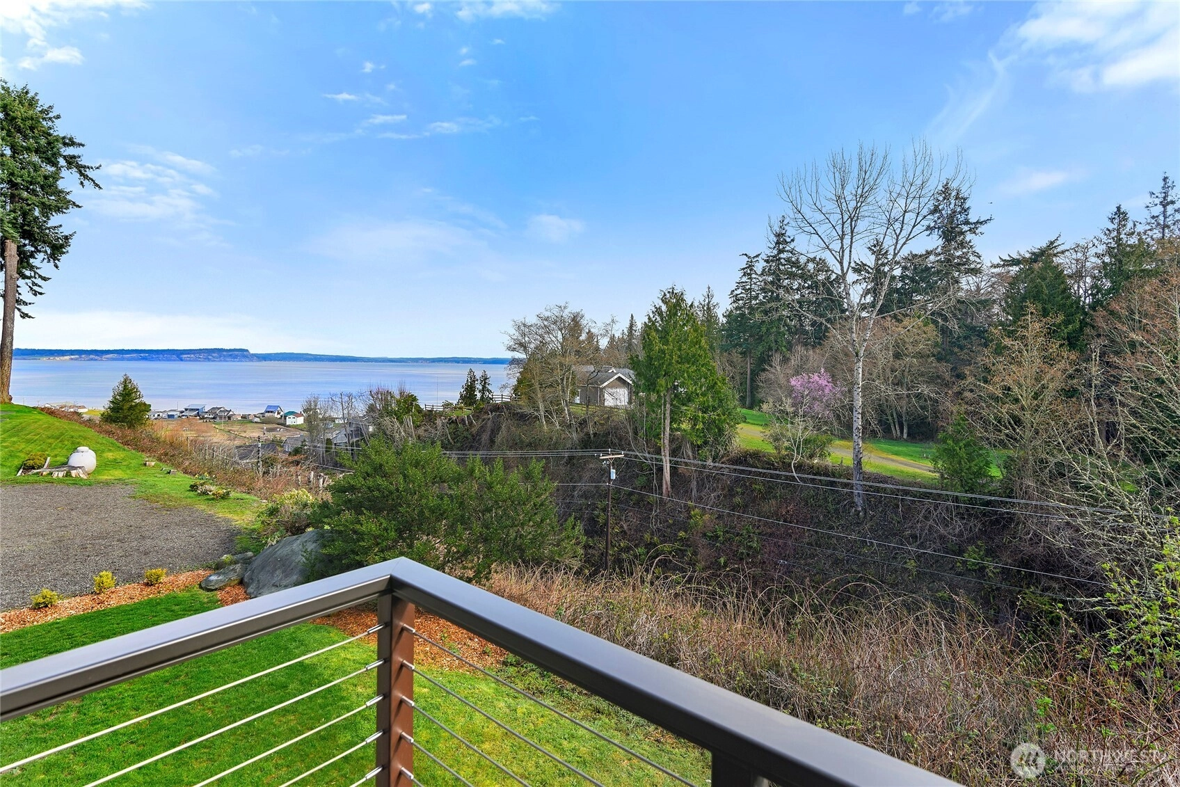 Pristine NW contemporary custom designed home blends timeless craftmanship with comfort & style. A dramatic wall of windows fills the living space with natural light while framing ever-changing unobstructed views of Mt Baker, Whidbey Isl, marine traffic & ever changing sky from almost every room. Rich wood tones, exposed beams, vaulted ceiling and the beautiful hearth/gas FP will draw you in. Open concept living/dining/great room transition seamlessly to the outdoors via oversized glass doors where you enjoy the views & the resident Osprey nest across the lane. Chef's kitchen boasts stainless appliances, quartz counters and plenty of storage options. Upstairs, the primary suite enjoys water & mountain views, a private balcony, plus a luxurious ensuite bath with soaking tub & shower & walk in closet. A second upstairs bedroom also has an ensuite bath and balcony with water views. Convenient laundry/utility room with a sink separates the two bedrooms. For privacy, power blinds from either floor. The main floor 3rd bedroom is being used as a media room with a .75 hallway bath. Comfort features include an all house heat pump with AC & tankless hot water. Situated on .72 acres in a quiet cul-de-sac this property offers plenty of outdoor space. Close by are Norwegian Park, Point No Point Lighthouse, Buck Lake & Greenway trails, the Hansville Grill & the local Bakery. Kingston fast ferry & Edmonds ferry just 15 min away. Enjoy the quiet pace of Hansville living.