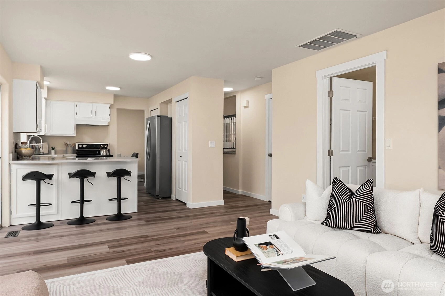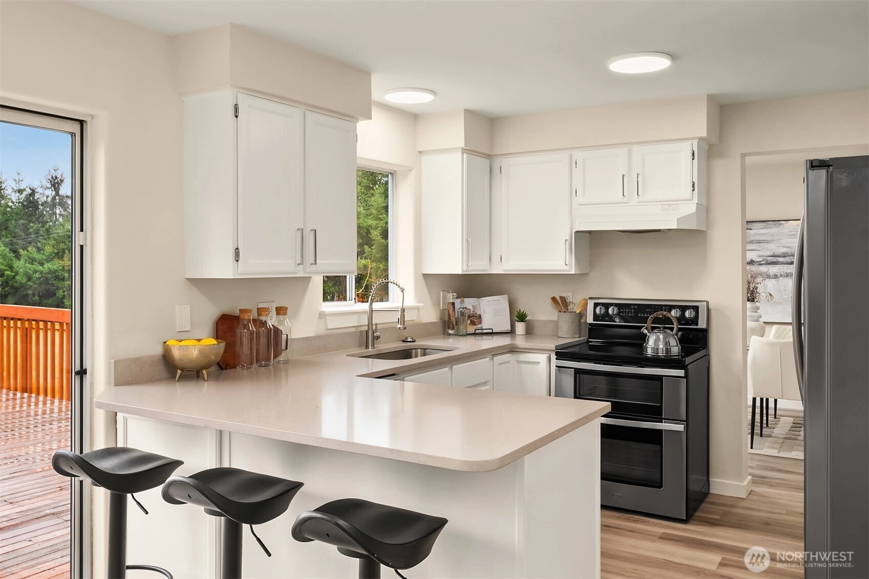 Welcome to your turn-key sanctuary! Perched on a sprawling 10,569 sq. ft. corner lot at the entrance of a quiet cul-de-sac, this 4-bedroom gem offers the perfect blend of privacy and modern style—all with no HOA. Inside, soaring family room ceilings and an abundance of natural light greet you, while every inch has been reimagined with designer finishes, including brand-new LVP flooring, plush carpet, and a crisp, modern paint palette. The heart of the home—the refreshed kitchen—shines with new countertops and stainless appliances, while the updated bathrooms offer a spa-like retreat. With a brand-new water heater, updated hardware, and fresh finishes throughout, the heavy lifting is already done. Step outside to your massive deck and professionally landscaped yard, perfect for summer BBQs or peaceful mornings. Minutes from Kent’s best amenities, this is the move-in-ready retreat you’ve been waiting for—already pre-inspected with a sewer scope available for your peace of mind!
