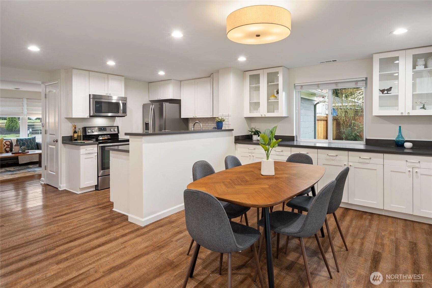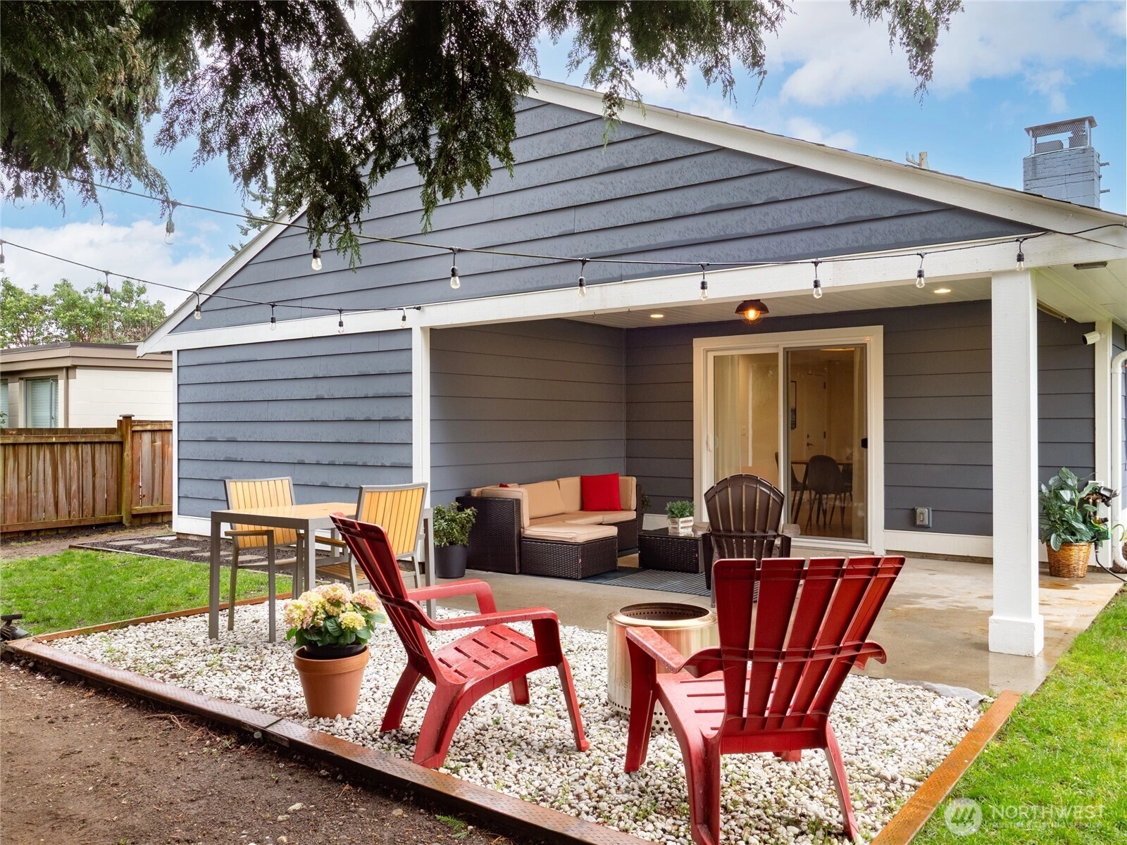 Fall in love with this adorable Greenwood rambler, set on an impressively sized lot! Thoughtfully updated & lives larger than its sq ft thanks to a smart, well-designed floorplan. The sunny west-facing front terrace leads to a bright & open interior w/ LVP floors, fresh paint, large windows & cozy wood-burning fireplace. Kitchen features SS appliances, quartz counters & pantry. Dining area w/ serving buffet flows to a covered patio, creating the perfect spot to savor meals and outdoor moments all year round. Primary suite offers dual closets w/ custom organizers & newer ¾ bath w/ hex tile floors, glass walk-in shower & quartz vanity. Two add’l bedrooms share a nicely updated full bath. Large finished attic provides abundant storage. Updates include copper plumbing, newer windows & updated electrical panel. Enjoy outdoor living year-round w/ a spacious covered patio & level fully-fenced yard w/ mature trees - ideal for gardening, pets & play. The expansive lot offers potential for a future DADU too! 1-car garage + driveway & ample street parking. Located in a friendly, walkable neighborhood near dining, coffee, Trader Joe’s & Greenwood Park, w/ easy access to Green Lake, Northgate light rail, bus lines & more. Peaceful, private & connected - welcome home!
