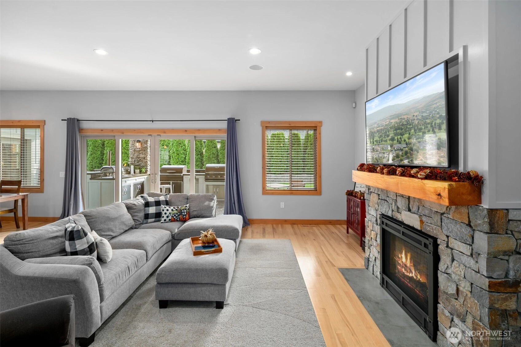 Enjoy refined living in the sought-after golf course community surrounding Three Lakes Golf Course. Ideally positioned across from the fairways, this exceptional property offers a rare blend of privacy, space, and effortless access to one of the area’s premier golf destinations. Set on a spacious lot designed for both relaxation and entertaining, the beautifully appointed 4-bedroom home showcases timeless craftsmanship and upscale finishes throughout. Rich hickory hardwood floors, custom alder doors, and elegant quartz countertops create a warm yet sophisticated atmosphere. The thoughtfully designed layout includes a dedicated office for remote work, a versatile bonus room above the garage, and inviting living spaces perfect for gathering with friends. The expansive 3-car garage and shop—complete with a convenient half bath—offers incredible flexibility for hobbies, storage, or additional workspace. Step outside to an entertainer’s dream backyard featuring polished stamped concrete and a fully equipped outdoor kitchen with built-in Cal Flame and Traeger grills, creating the perfect setting for outdoor dining and summer evenings. With luxury finishes, generous spaces, and the lifestyle of a premier golf course community, this exceptional home offers comfort, elegance, and the perfect place to unwind just moments from the greens.