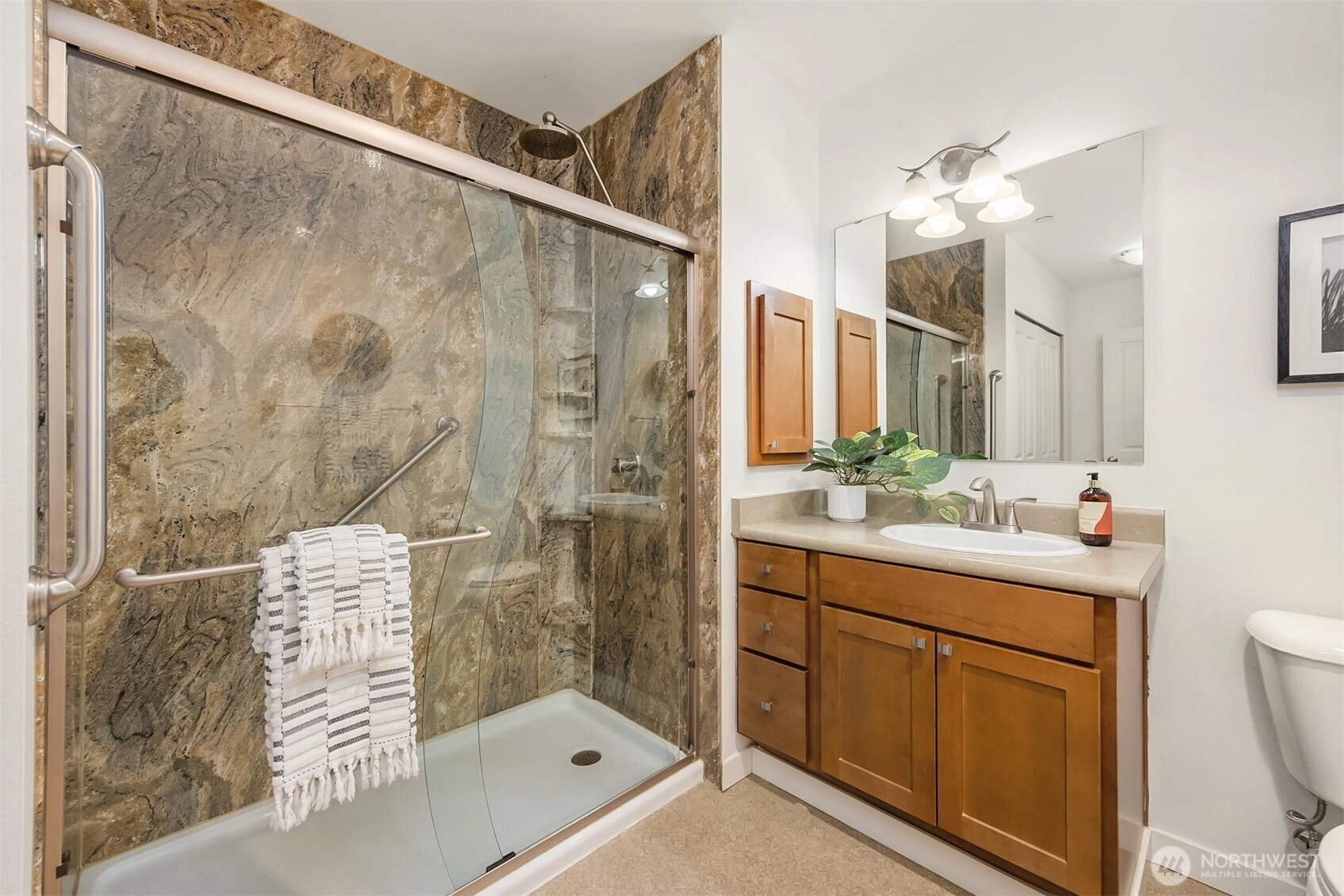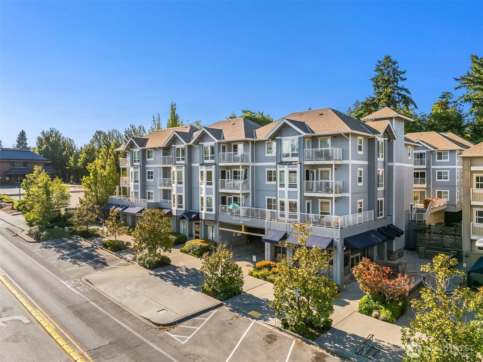 Perched on the top floor in the heart of Bainbridge Island, this light-filled 1-bedroom condo offers a rare blend of privacy, comfort, and convenience. Enjoy a quiet, peaceful setting and walk to shops, restaurants, transit, and the ferry. Fresh interior paint, new carpet, and updated laminate flooring in the kitchen create a clean, move-in-ready feel. The open-concept design connects the living, dining, and kitchen spaces seamlessly, while soaring ceilings and expansive windows bring in abundant natural light. Secure entry, elevator access, dedicated parking, and pet-friendly living complete the package, perfect for commuters, investors, or those seeking an easy island lifestyle.
