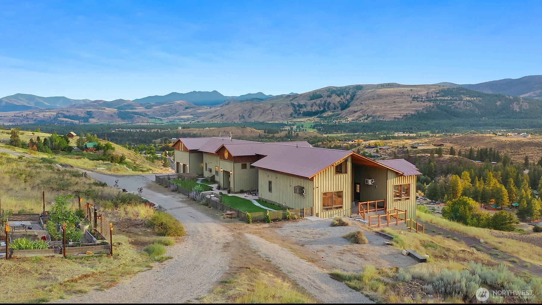 Come experience jaw dropping Views that rival Sun Mountain Lodge, at this newly complete (2025) home located just above Downtown Winthrop. A short 2.3 mile drive brings you to Stud Horse Mountain where this beautiful home sits, enjoy a peaceful and quiet retreat with the serene Views that stretch 240 degrees! The home "lives" like a 3200 square foot rambler with 2 separate main level Primary Bedrooms (en-suite design) with additional guest space upstairs offering more bedrooms, a full bathroom, bonus areas + a quiet office with french doors. The layout is ideal, and the interior design is both timeless & elegant with rustic touches. From the arched doorways, extra-thick window casings, to the unique walk-in Refrigerator (think of it as a large cold pantry!) to the stunning 2-story entry that greets your guests, and then add in the extraordinary Great Room & expansive outdoor living space -- all with mesmerizing Views -- it really doesn't get much better. You and your guests will feel like you've been transported to a private European Swiss Alps vacation home here. I.C.F. construction is phenomenal for heat or cool. Unfinished basement is a blank canvas to finish, or use for Storage & Shop. Gardens with SMART drip irrigation. Pearrygin State Park is just over the hill, a perfect alternative to Lake Chelan crowds. Room for horses, RV Parking and more.