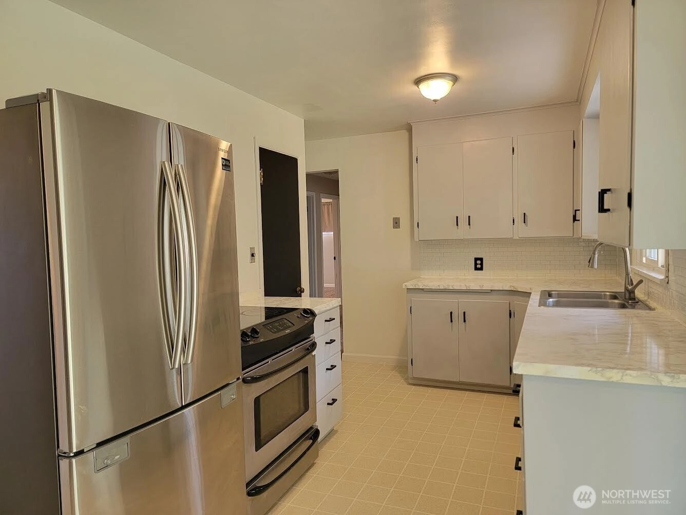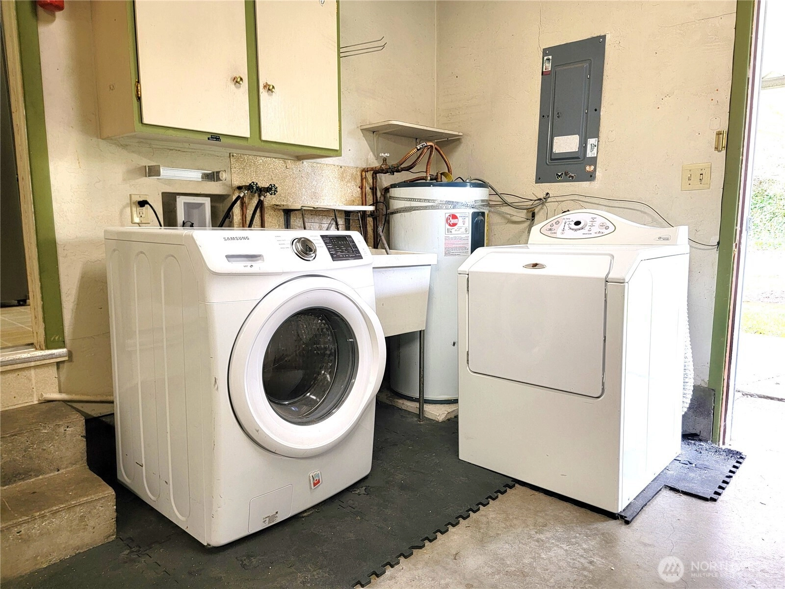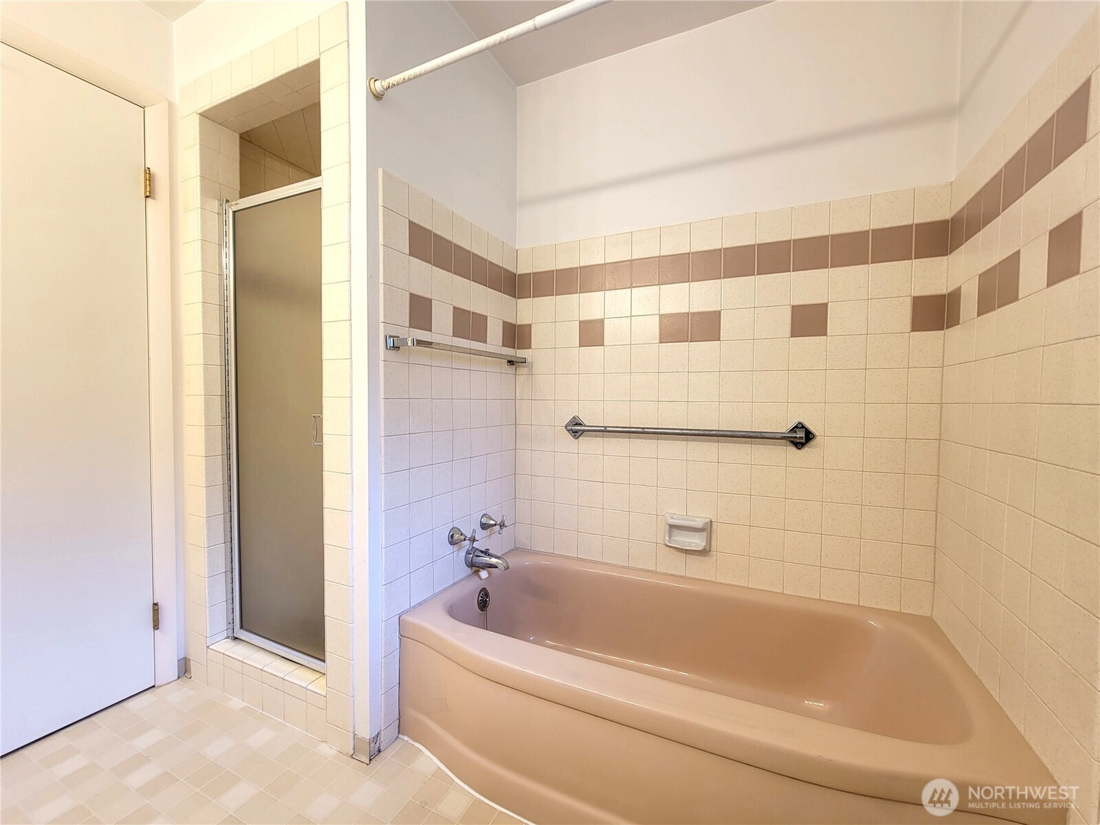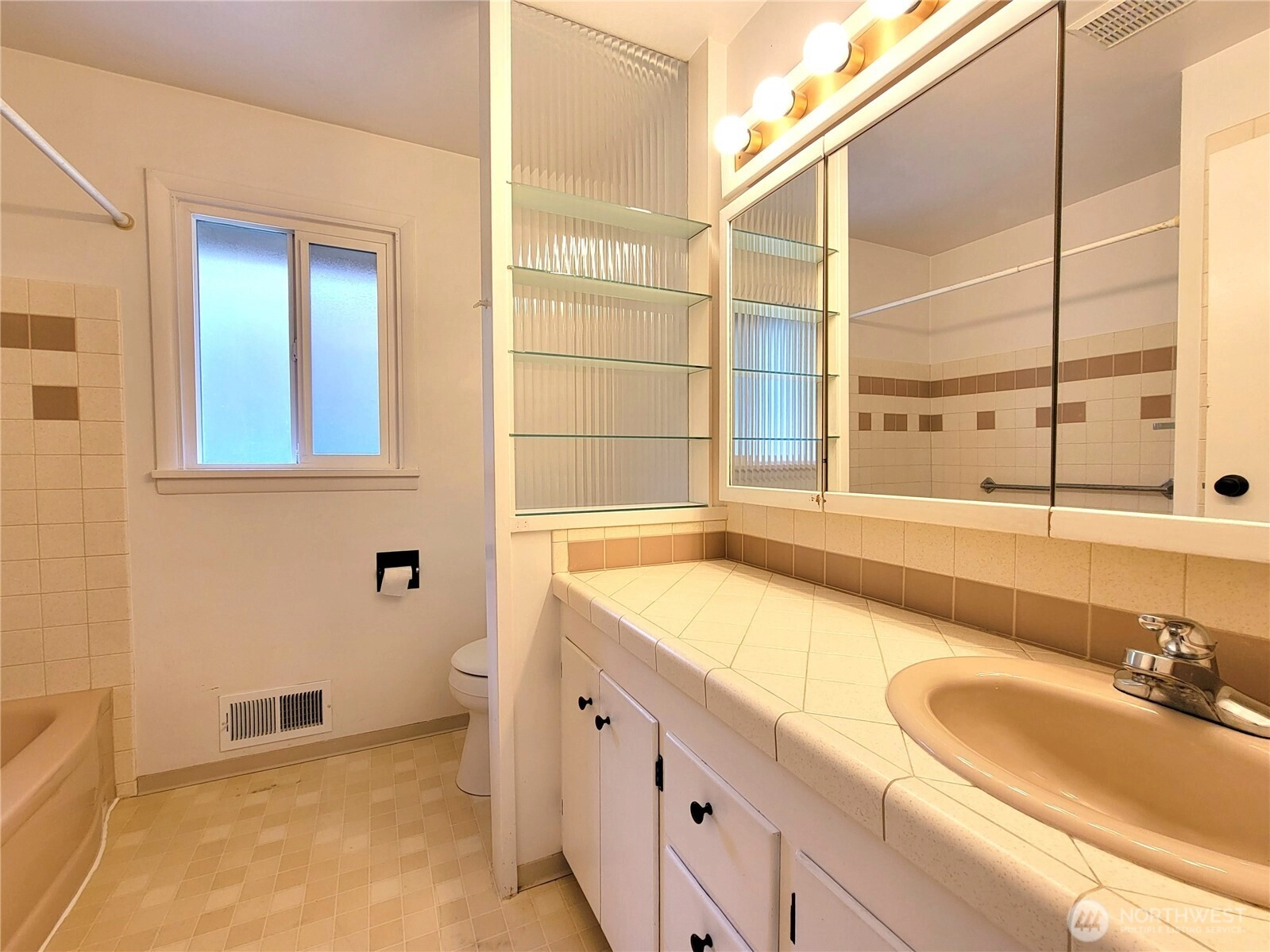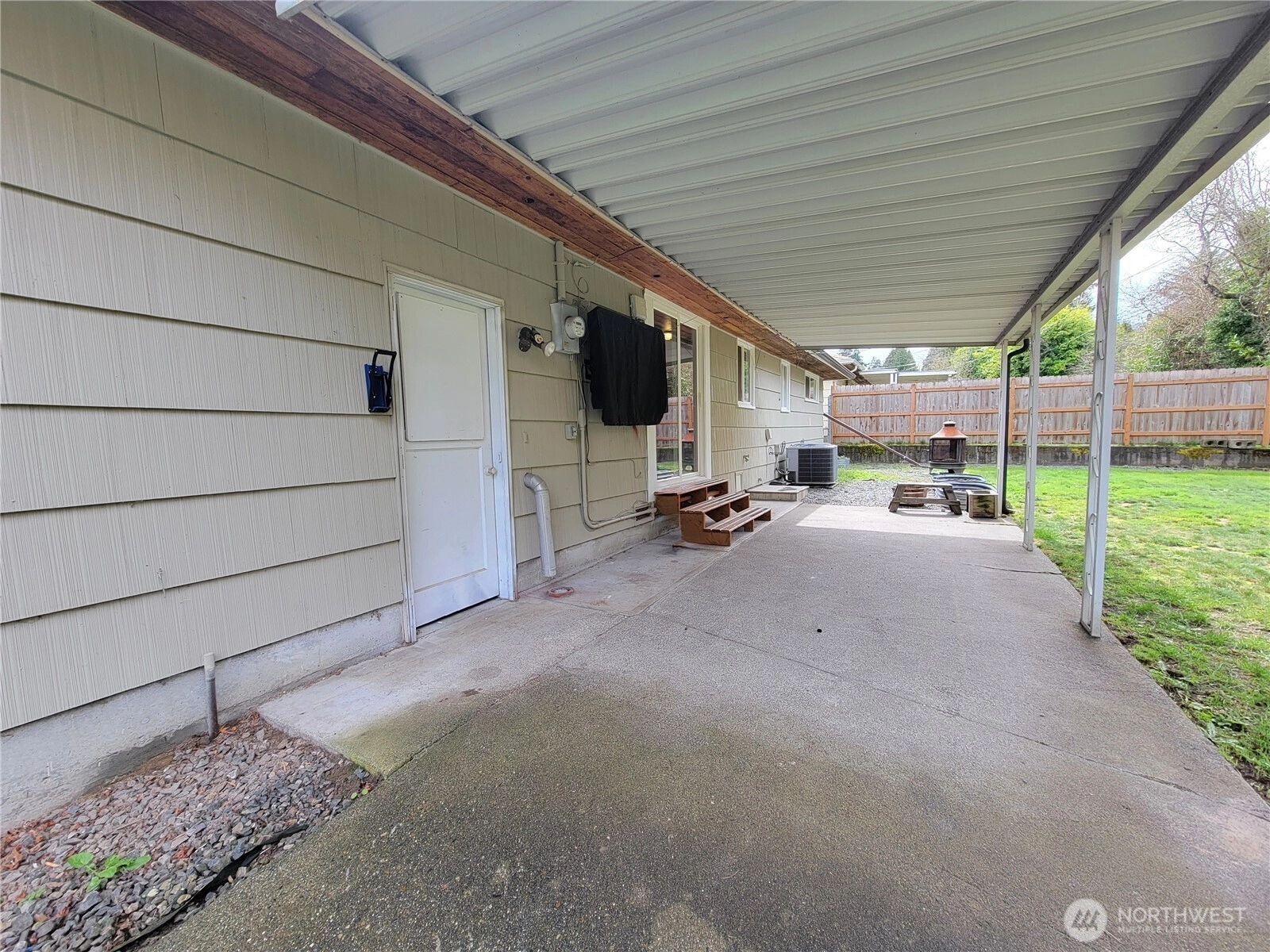 Experience a transformation to the 1950s in this charming neighborhood, featuring classic mid-century modern ramblers and wide streets lined with trees and grass-covered sidewalks. The previous owners altered a three-bedroom layout into a two-bedroom home by converting one of the bedrooms into a spacious primary bathroom. The remaining half can serve as an office and has also been used as a walk-in closet. Many of the homes in this neighborhood have converted their garages into additional living space. Hardwood floors under carpets and the LVP flooring. Heat-pump forced air heating and AC. The property boasts a large, level, fully fenced backyard with a covered patio, complete with a mounted TV for enhanced entertainment. Additionally, there is a one-car garage and a two-car driveway. This home is conveniently located near schools, parks, PSNS, the Seattle ferry, and all the amenities that the City of Bremerton has to offer.