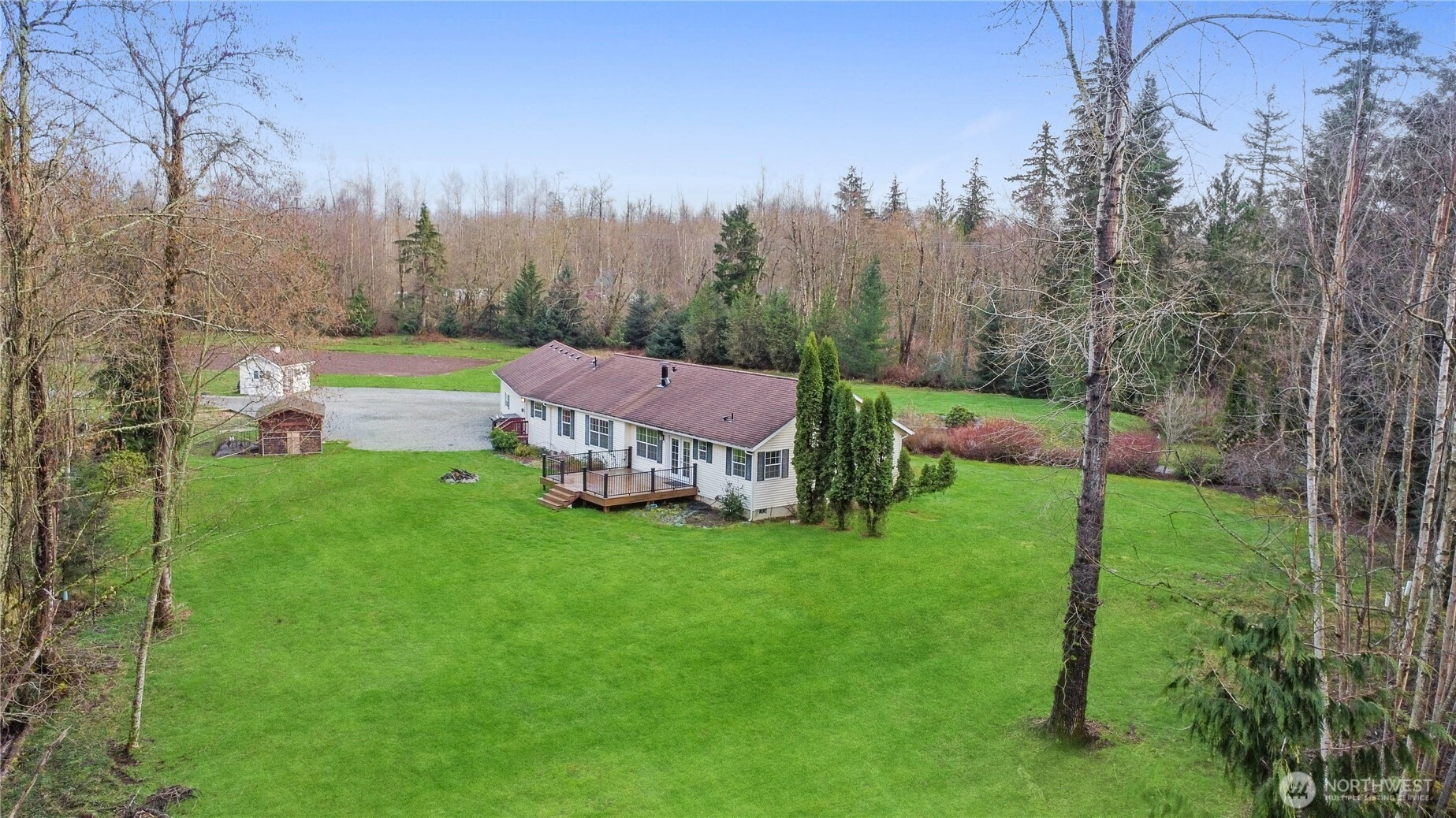 Beautiful single story equestrian property set on 5.93 private acres with no neighbors in sight. Located within a gated community, a paved driveway welcomes you into your forever home. This 4 bed, 2.5 bath, 2,242 SF home offers a spacious, open-concept living room that flows seamlessly into the dining area and kitchen, plus a separate family room for added flexibility. Interior updates include fresh paint and refreshed hardwood flooring in the family room. The primary suite features a walk-in closet and a 5-piece ensuite bath. Venture outside to a brand-new Trex deck and enjoy the peaceful, park-like setting. The property is fully equipped for horse enthusiasts with a barn/shop, stalls, riding area, and a covered structure ideal for tractor or equipment storage. Additionally, a permitted shop/ADU is ready for future build, offering incredible potential for expansion, multi-generational living, or additional income. This property offers the perfect balance of privacy, usability, and lifestyle. Come see this one for yourself!
