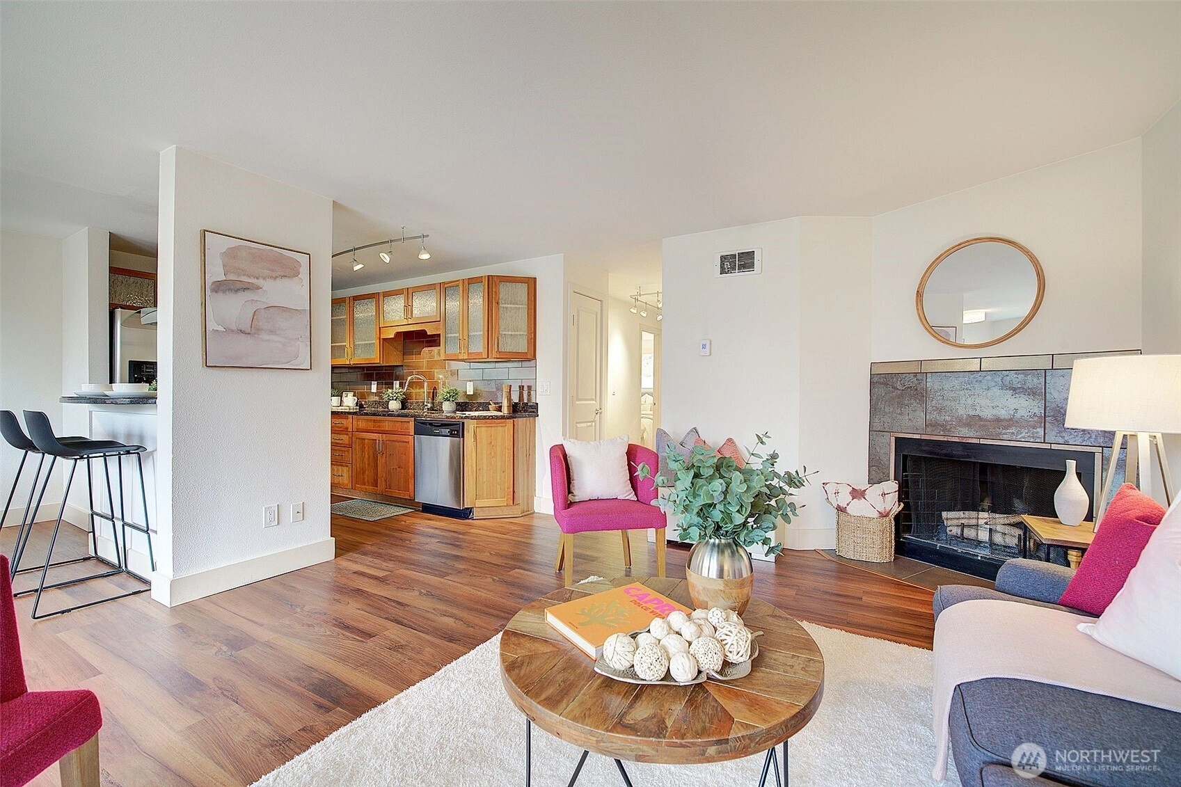 Quietly tucked away among lush, tree-lined grounds backing to the scenic Kirkland Cross Corridor Trail, this inviting Bellevue townhome offers the perfect blend of tranquility and convenience. Enjoy a peaceful, nature-filled setting while remaining ideally located for an easy commute to Bellevue, Kirkland and Seattle. This 2-bedroom, 1-bath home features a spacious great-room style living area that opens to a private deck overlooking serene, wooded surroundings—an ideal retreat for morning coffee or unwinding at the end of the day. The stylish kitchen showcases granite countertops, a tiled backsplash, and stainless-steel appliances, all flowing seamlessly into the open-concept living and dining spaces. Newer luxury vinyl plank flooring runs throughout the home, complementing the warm ambiance of the cozy fireplace. Everyday comfort is enhanced with the convenience of an in-unit washer and dryer, plus private deck storage and reserved covered parking just steps from your front door! Experience the best of both worlds—peaceful, park-like living with close proximity to major employers, vibrant dining, and shopping. This is the lifestyle you’ve been waiting for!