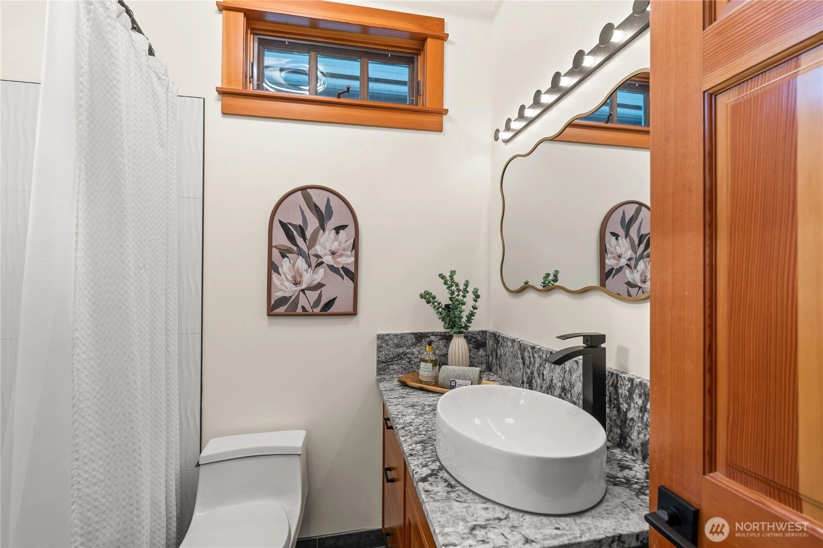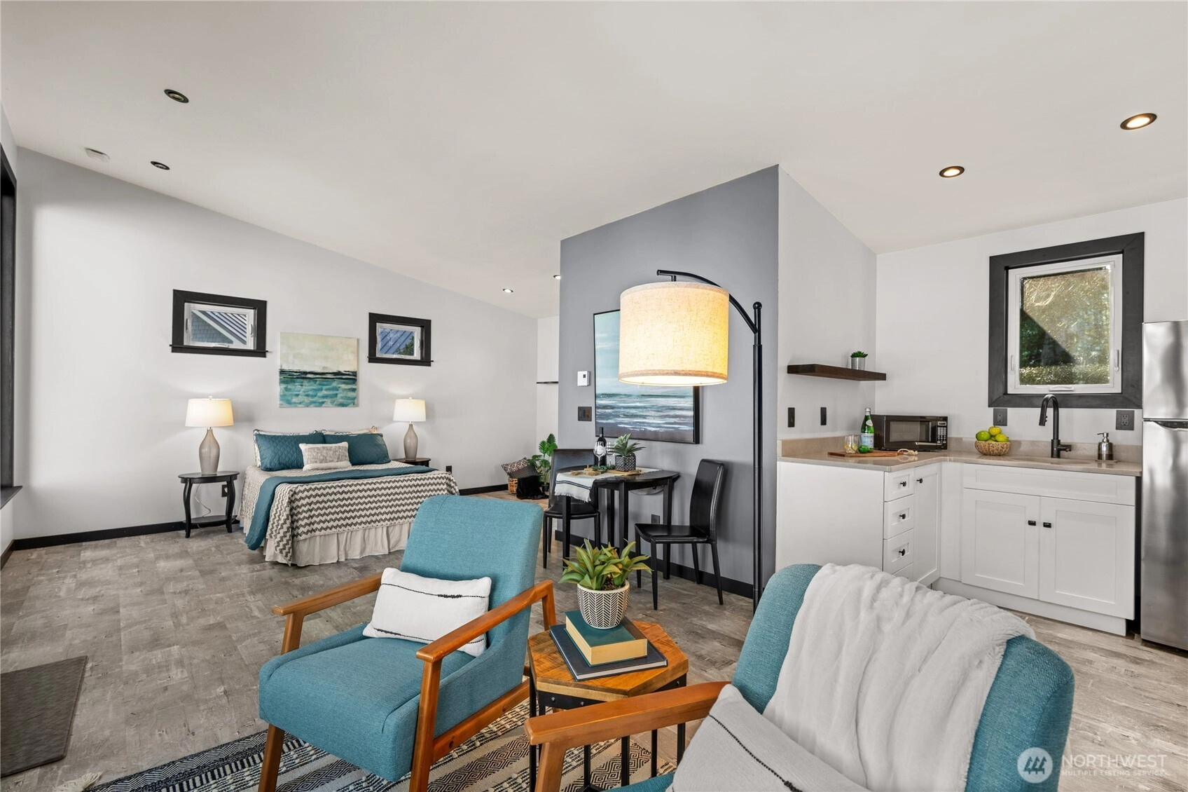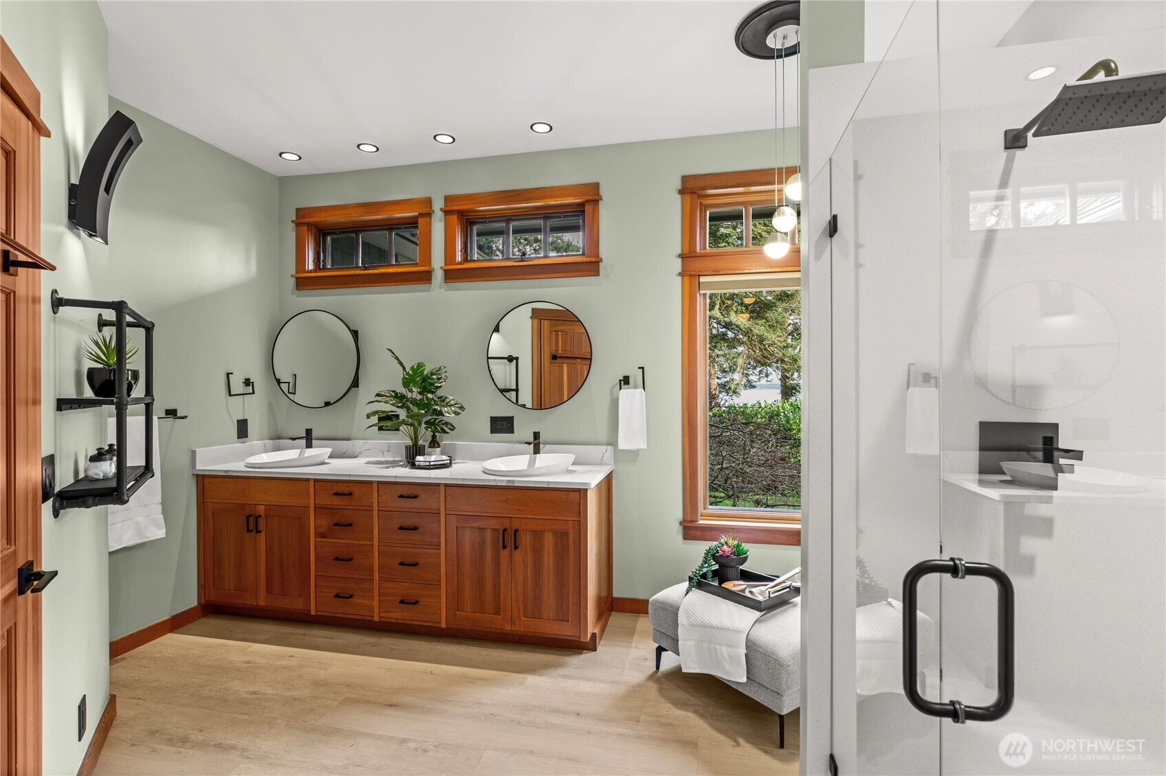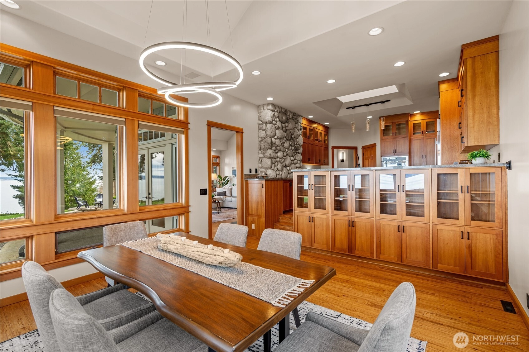 Wake to iconic Mount Rainier and Mount Baker views across 233 feet of accessible Puget Sound shoreline with rare tideland ownership to the water's edge. This nearly 4-acre, 3 tax parcel, waterfront estate delivers something exceptional. Designed by Myrvang Architects and built by Fairbanks Construction. Imagine entertaining in the great room where vaulted ceilings soar above a rounded living room, meticulously matched millwork, and full-plank fossilized eucalyptus and slate flooring, or cozying up beside the floor-to-ceiling Frazier River rock fireplace. Walls of windows frame water views that shift with every season. The chef's kitchen gleams with Sub-Zero, Thermador, and Dacor appliances in custom cherry cabinetry with granite counters. Primary suite features vaulted ceilings, built-in dressing room, and large walk in shower. The sunroom's four 9-foot folding glass doors open completely, dissolving the boundary between inside and out. Rounded out with guest quarters above the attached three car garage. 2nd tax parcel has its own slice of waterfront with 450 sqft home with bath and kitchenet, detached shop with a RV bay, 30/50 amp RV service, 3 bays accommodating up to 6 cars, and workshop. 3rd parcel boasts mature trees offering privacy from the road or potential to build a 3rd home or barn for a hobby farm. Fully permitted, Brockman built, beach staircase, mature gardens, fruit trees, multiple outdoor entertaining spaces and private beach make this property irreplaceable.