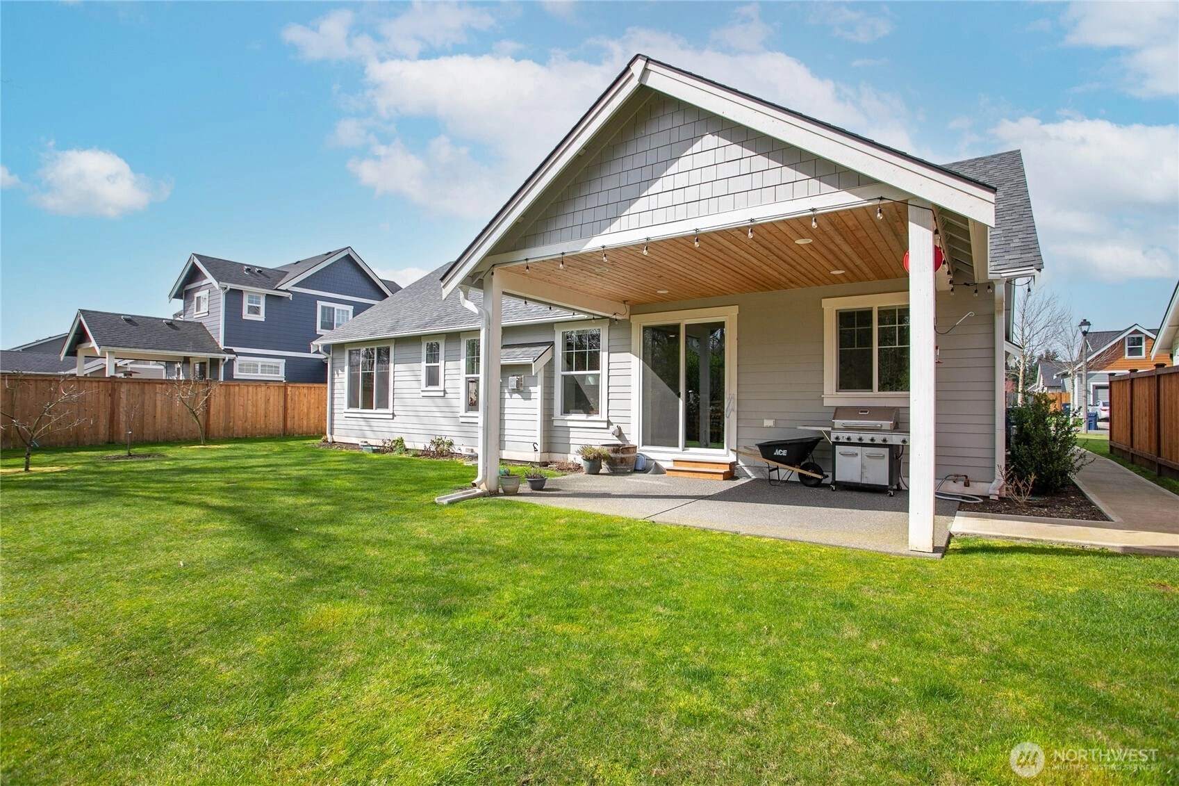 Effortless single-level living with a modern edge! This open-concept home impresses with vaulted ceilings, a cozy gas fireplace, and a layout that flows seamlessly for everyday living and entertaining. The chef’s kitchen is a showstopper—quartz counters, tile backsplash, rich luxury vinyl plank flooring, undercabinet lighting, pull-out drawers in the cabinets, and a walk-in pantry ready for it all. The primary suite is a true retreat, featuring a very spacious bathroom and a large walk-in closet. Tucked against a peaceful greenbelt, you’ll love the privacy and abundant natural light. Step out to the large covered patio—perfect for year-round relaxing or hosting—while your backyard features fruit trees and in-ground irrigation for easy care and a touch of sweetness! Stay comfortable with central A/C, and enjoy upgrades like natural gas appliances and a tankless hot water system. This home is clean, efficient, and move-in ready—the total package!
