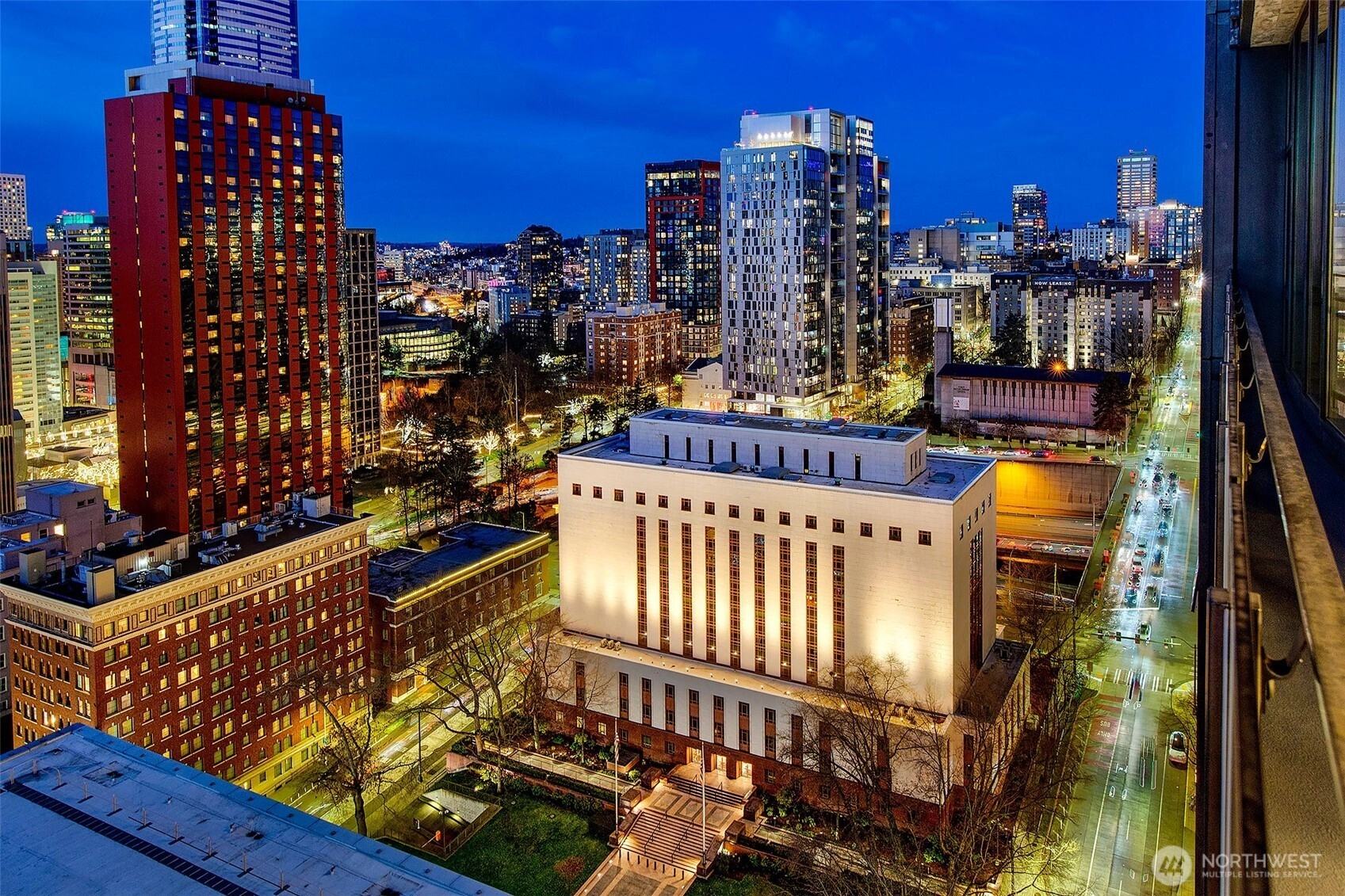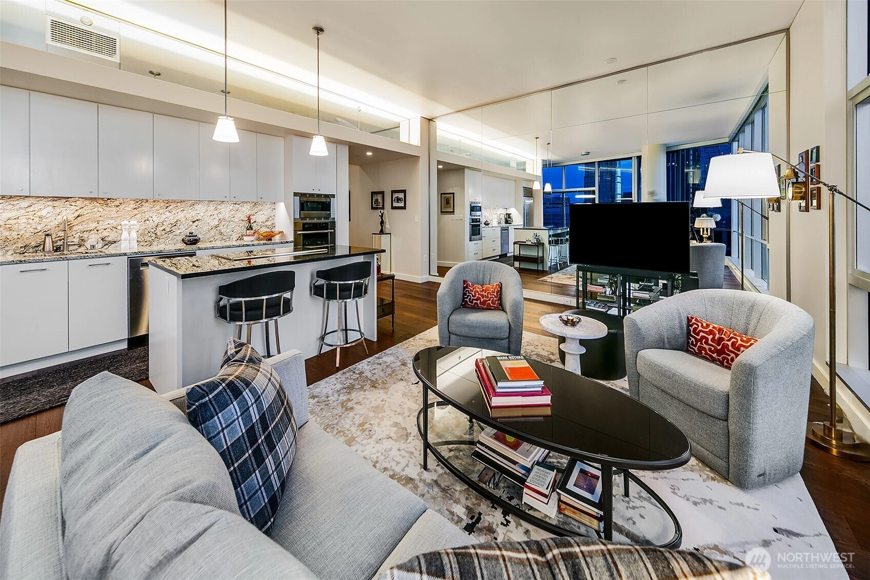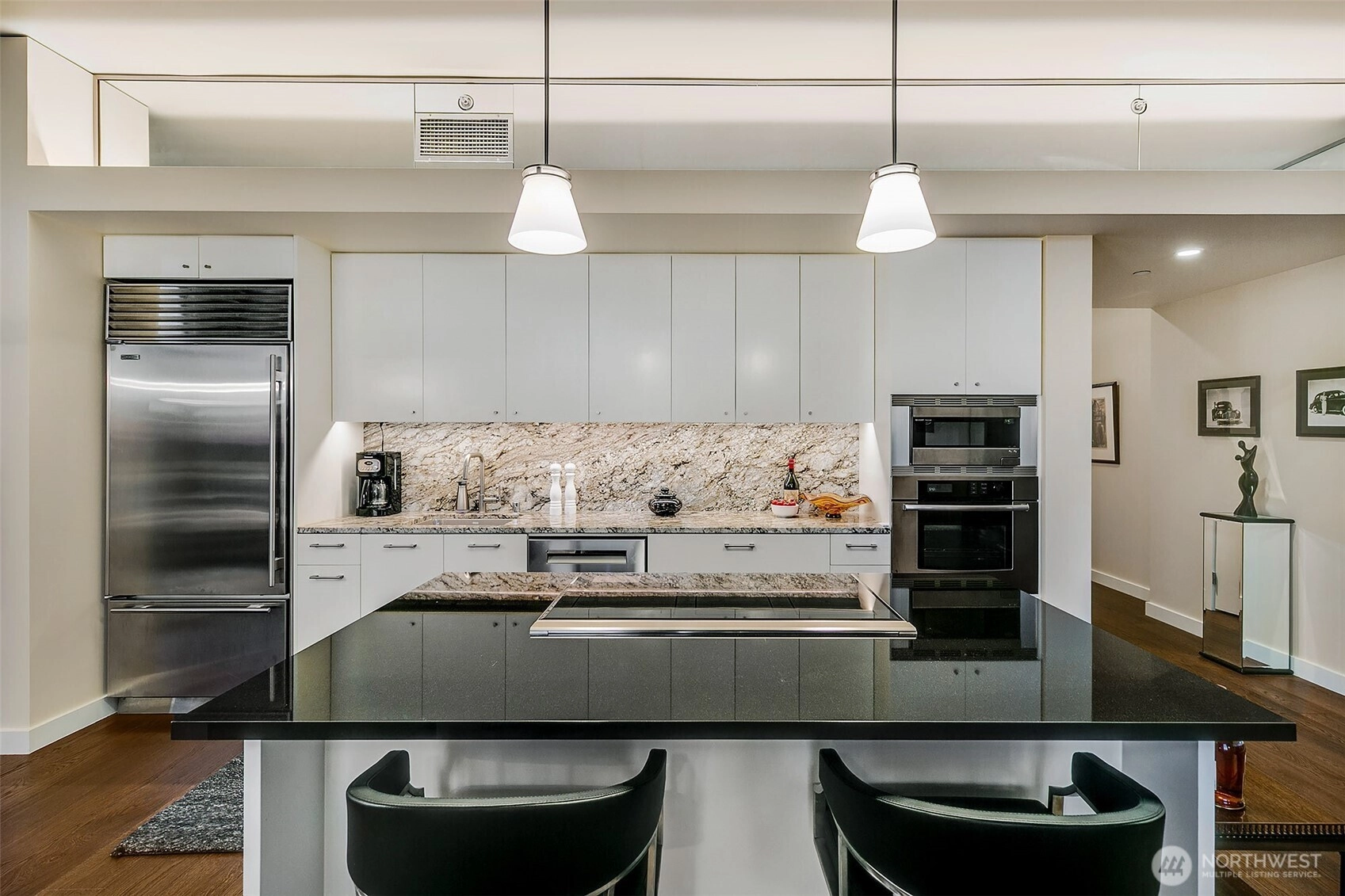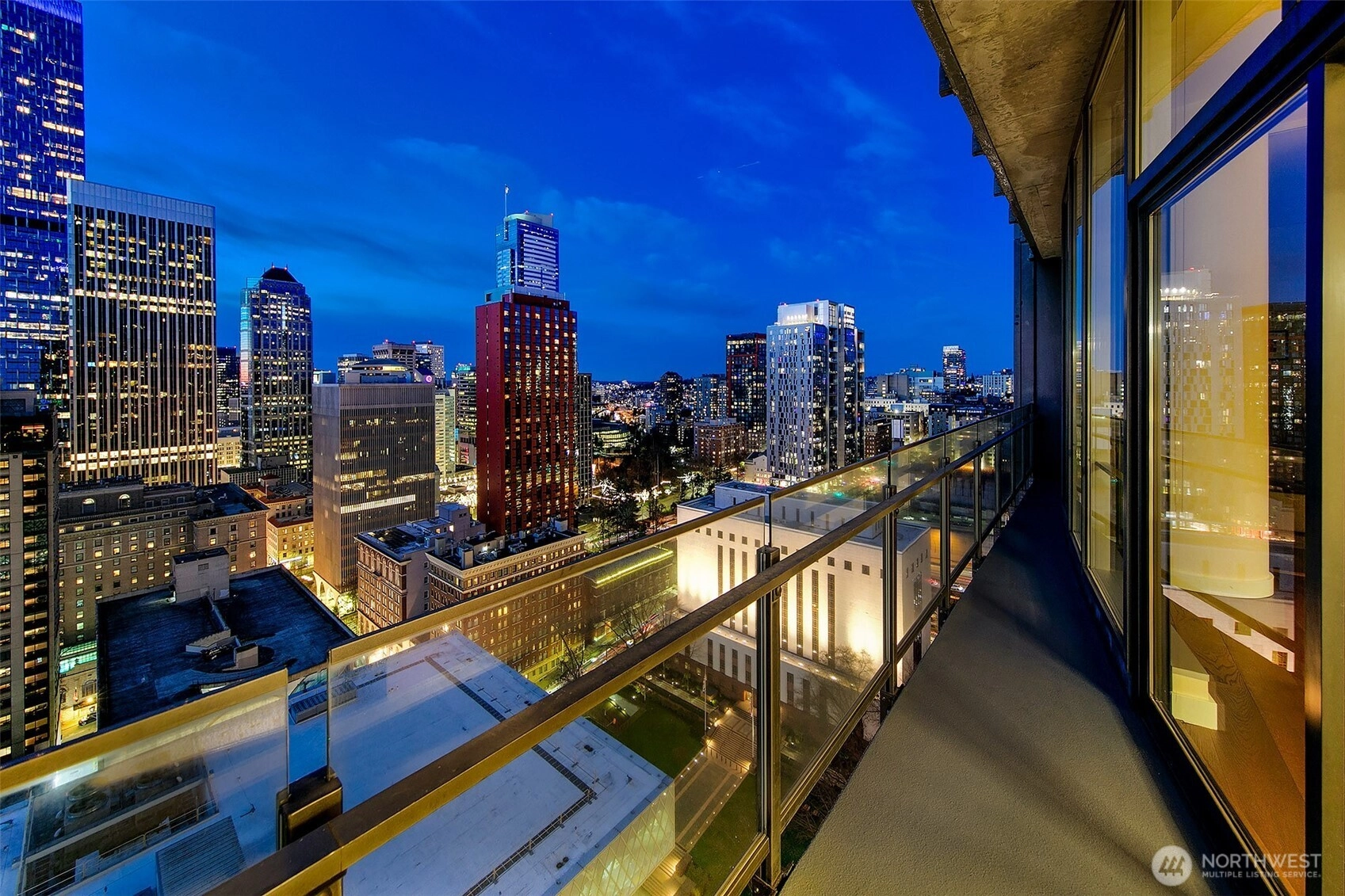 Penthouse Style luxury from this 23rd floor NW corner Jewel box! Near 1250 sqft -1bd plus large den. Soaring 11 foot floor to ceiling windows wrap this private sub penthouse home. Dream remodel, enjoy over 100k of designer upgrades, new wide plank floors, cook with a view-custom island designed with new wolf induction cook top, discreet pop up fan & sleek beverage center. Top of the line appliances, subzero, new LED lighting in kitchen above & below cabinets new designer lighting in dining area, new kitchen granite, sink & faucet, new Bosh dishwasher. Home has A/C . World class building, 24story, 126 homes, only 6 per floor, LEED Gold, steel & concrete. 5star location, mins to stadiums, I5, light rail, hospitals, court house. 1 parking- 1 storage. Be sure to visit 2nd floor amenities, owners lounge with roof deck, guest suite, fitness center & pet relief. Great HOA with healthy reserves! No rent cap.