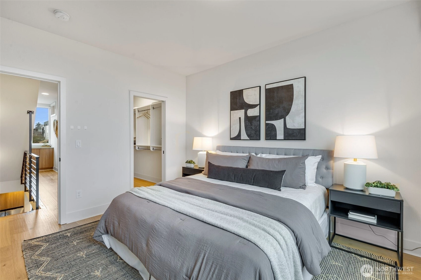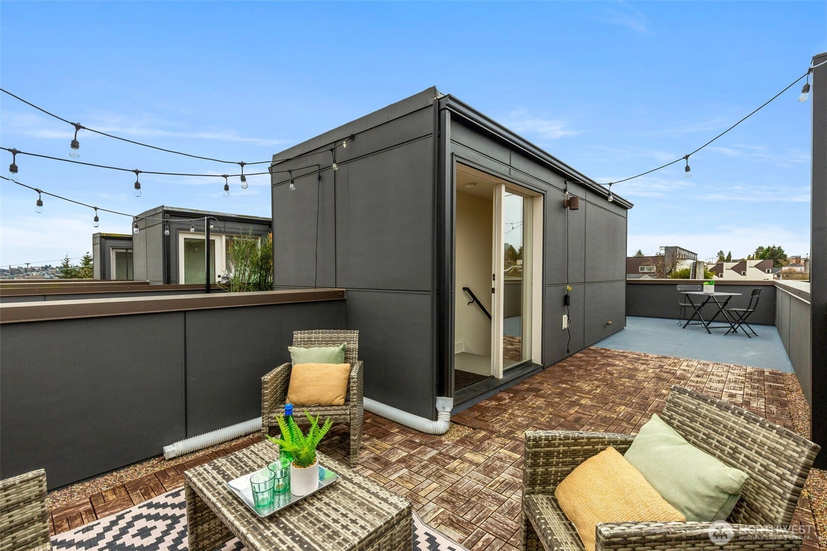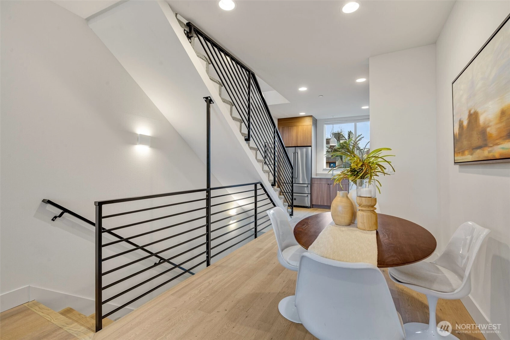 Awesome location just steps from Green Lake and directly on the E Line, this 2020 rowhome offers effortless access to Downtown Seattle and beyond. Thoughtfully designed with a central entry, the home features a highly functional layout that minimizes stairs and maximizes everyday livability. Oriented to the east, enjoy a sweeping birds-eye perspective across the Wallingford valley, with serene views of trees and distant mountains. Inside, you’ll find three spacious bedrooms -each finished with hardwood or polished concrete floors - along with soaring ceilings and dramatic double height windows that flood the home with natural light. The main living area has high ceilings and lots of light plus a seamlessly connected kitchen, dining space, and living room; perfect for entertaining or relaxing in style. On the top a private rooftop deck where you’ll take in peaceful views and enjoy a private outdoor retreat. The lower-level bedroom offers polished concrete floors and direct access to covered exterior storage ideal for bikes, gear, or creative projects. Parking is easy on 46th which is basically used exclusively by these homes. Stay cool all summer with A/C, and enjoy being moments from some of Seattle’s most beloved destinations; Green Lake, the Wallingford Farmers Market, and live music at Fremont’s Solstice celebration.