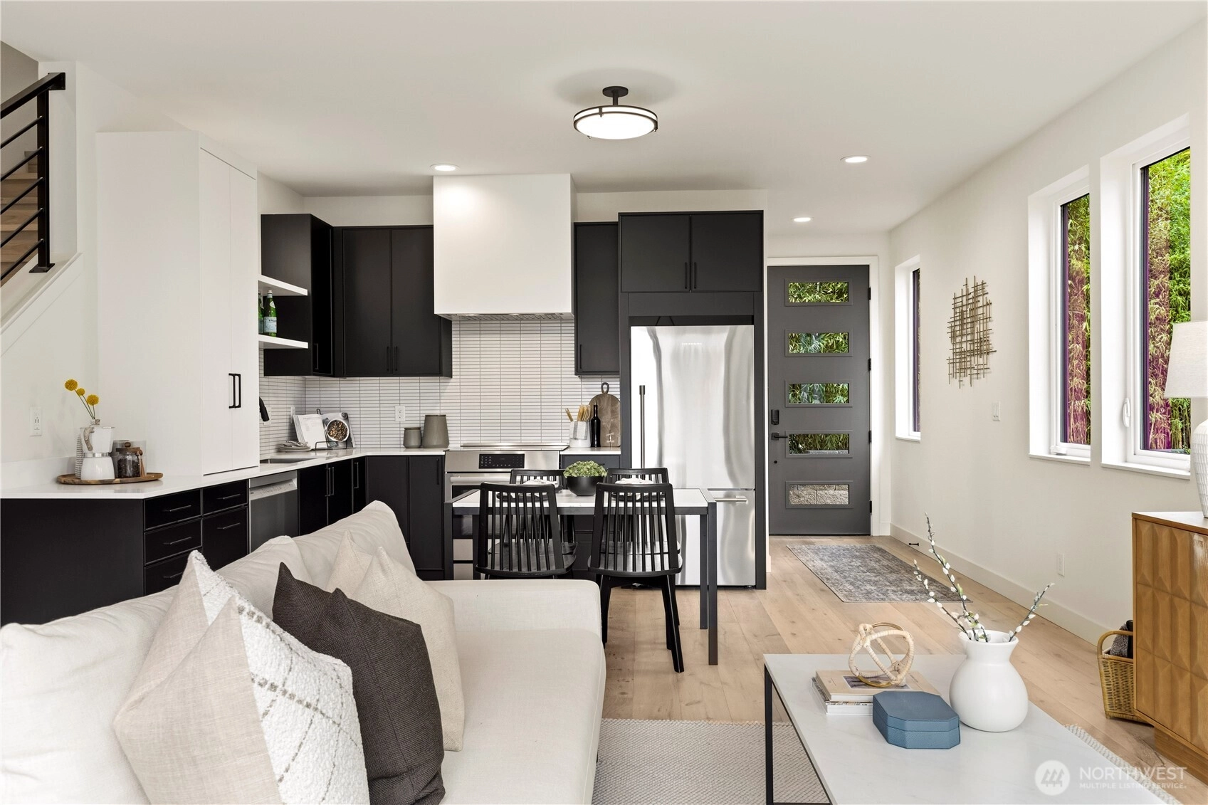 Set on one of Magnolia’s most desirable streets, this ADU by Madrow Homes makes an immediate impression. Soaring 9-foot ceilings, wide-plank oak flooring, and a fluid, thoughtfully designed layout create a sense of ease and intention throughout. At its heart, the kitchen anchors the home as both focal point and gathering space, appointed with custom cabinetry and professional-grade appliances, including Bosch and Fisher Paykal. Living and dining areas extend seamlessly from this central hub, while a nearby bonus room with separate entrance offers versatility for a home office, reading lounge, or private retreat. A main-level powder room adds everyday convenience with a refined touch. Upstairs, two spacious bedrooms offer comfort and privacy. The primary suite blends calm with water views, features a spa-inspired ensuite bath with heated floors and curated finishes that elevate daily routines. A second full bath serves the additional bedroom with equal attention to detail. A dedicated parking pad with EV hookup completes the home’s practical luxuries. Ideally located just moments from Magnolia Village, Magnolia schools, Discovery Park, SLU, Ballard, and QA. This residence offers a rare balance of tranquility and connection.