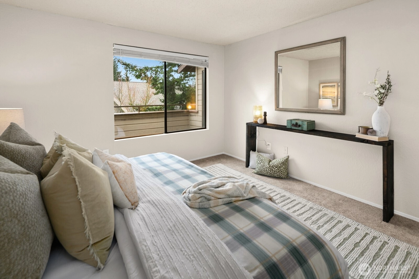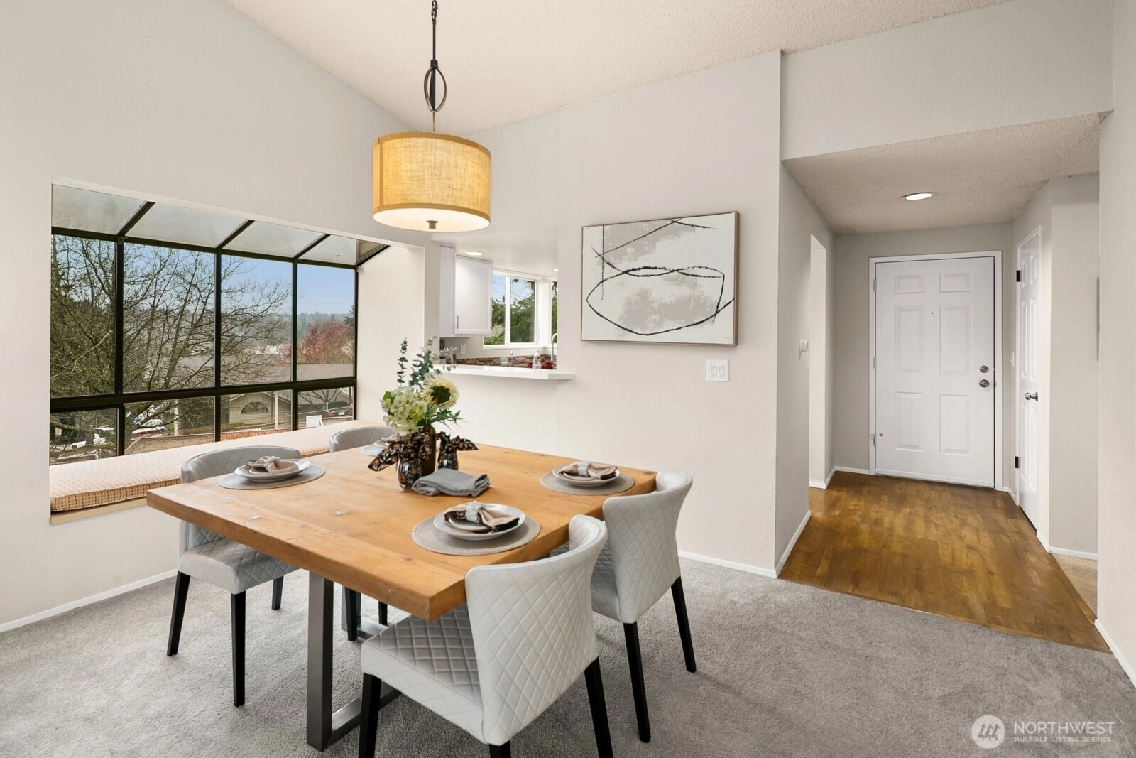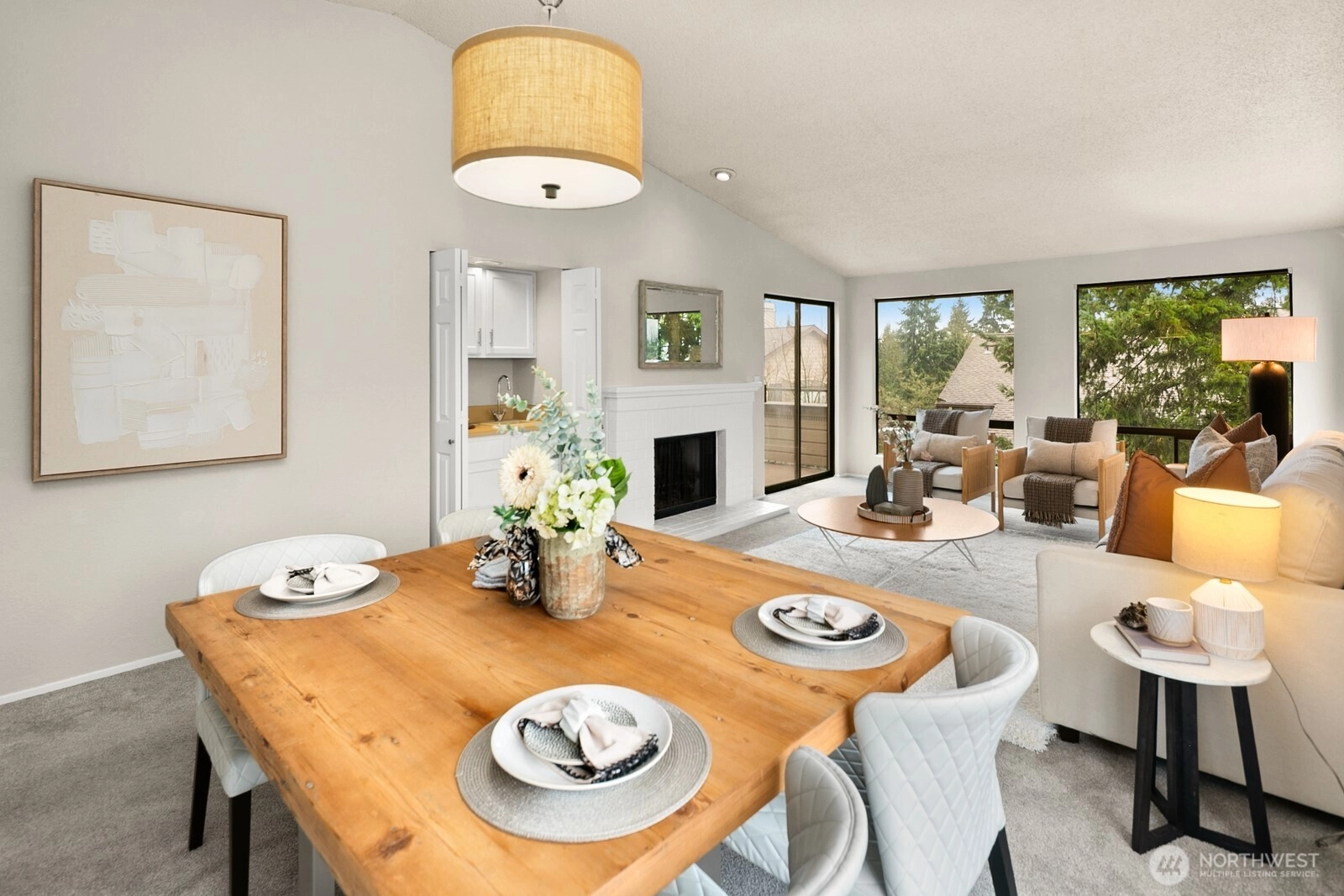 Welcome to Sunwood Condos! Rare top-floor, corner unit is move-in ready and filled with natural light. The spacious main living area features a cozy wood-burning fireplace and a built-in bar area—perfect for entertaining. A dedicated dining space includes a charming window seat that creates the ideal reading nook. Large windows throughout fill the home with natural light. The well-appointed kitchen offers generous workspace, ample storage, and a convenient pass-through to the dining area, making it easy to stay connected while cooking or hosting.The spacious primary bedroom includes a private en suite bath and great closet space. A second bedroom provides flexibility for guests, a home office, or hobby room. An additional full bath and laundry closet with extra storage are conveniently located in the hallway.Step outside to your private balcony—perfect for relaxing on warm summer evenings. The unit includes one reserved covered parking space plus plenty of visitor parking. Well-managed HOA with great amenities including a pool, hot tub, tennis courts, and clubhouse. Fantastic location just minutes from Westfield Southcenter Mall, dining, shopping, SeaTac airport and major commuter routes.