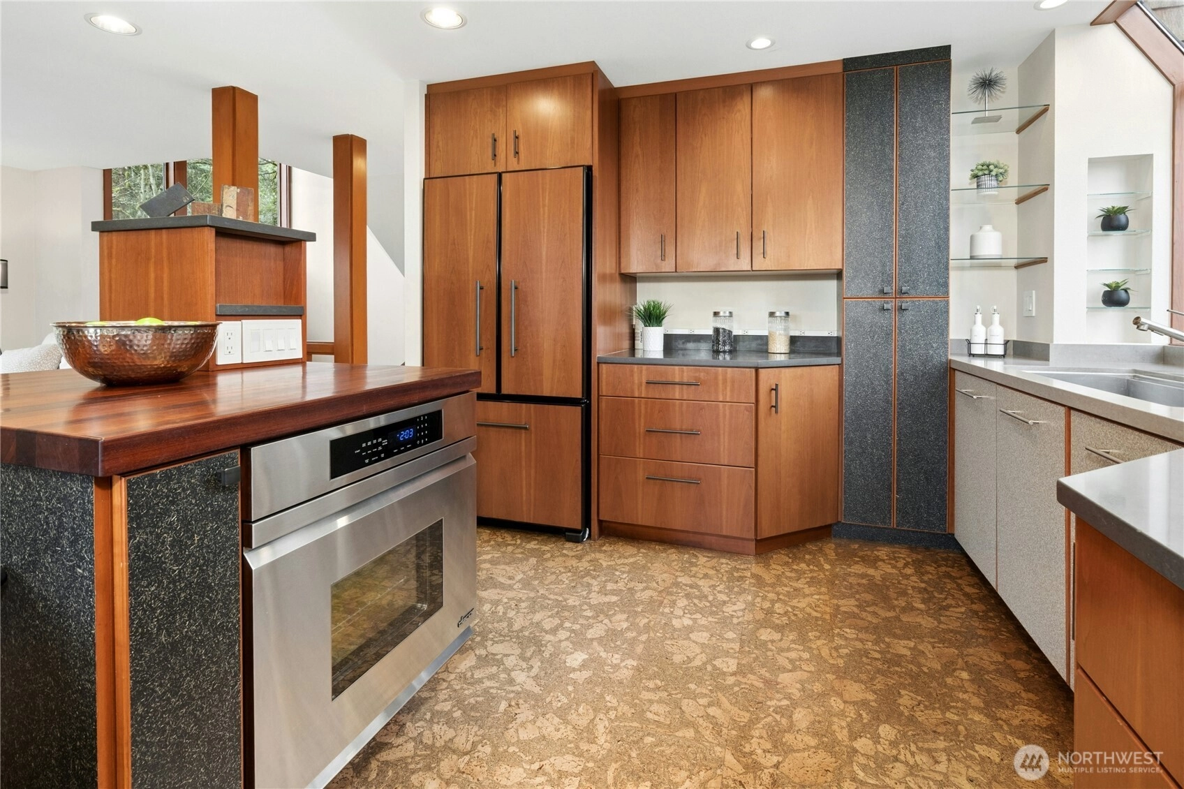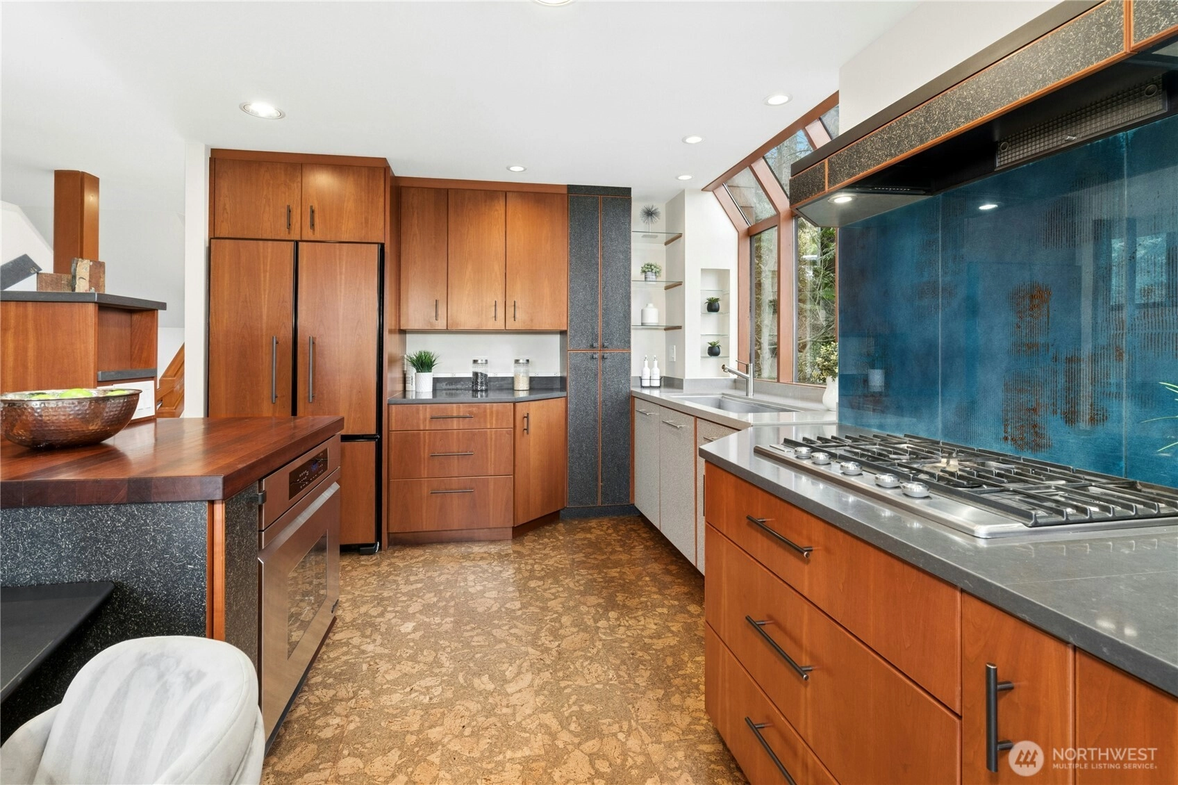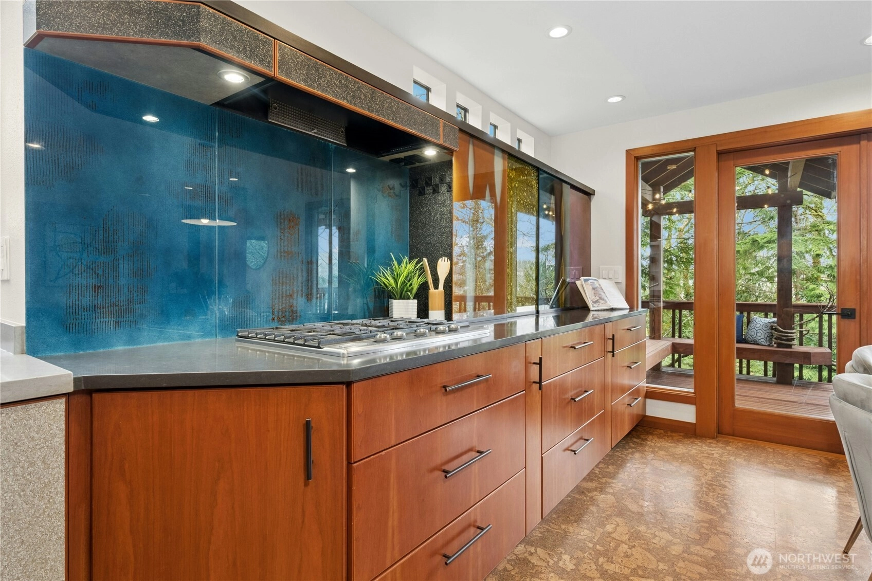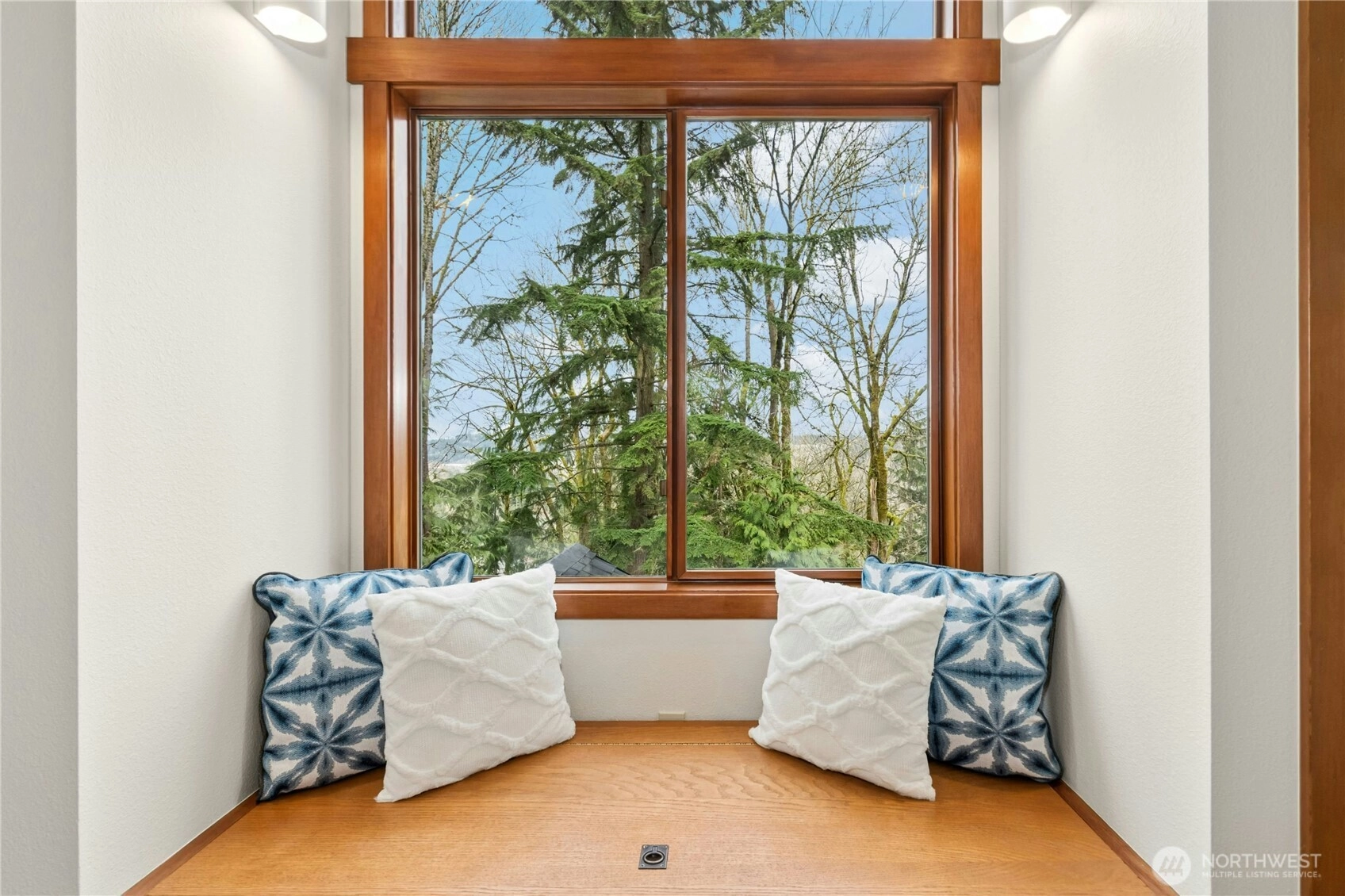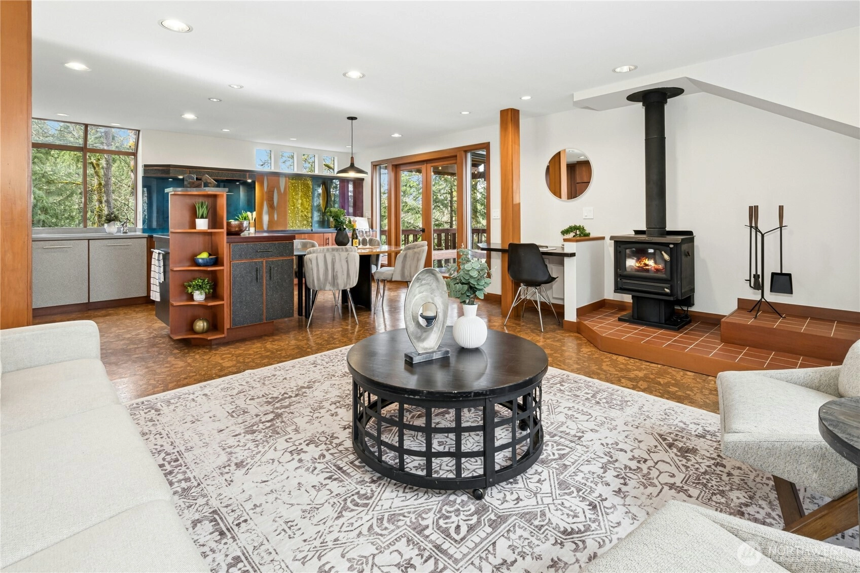 Tucked gracefully among the evergreens of Squak Mountain, this custom-built, treehouse-inspired residence offers an extraordinary sense of retreat just moments from downtown Issaquah. With 3 bedrooms, 2.25 baths, and 1,980 square feet, the home is defined by soaring ceilings and dramatic walls of windows that invite in natural light and tranquil forest views at every turn. Rich, organic finishes - shingle siding, clear fir six-panel doors and detailed millwork, tile and cork flooring - create a warm yet refined Northwest aesthetic.The signature kitchen, thoughtfully designed by Richard Landon, blends artistry and function with premium Brazilian cherry cabinetry, a substantial island, and custom-made glass door accents. French doors open to a wisteria-draped deck, an enchanting setting for quiet mornings or elegant summer gatherings.A matching detached outbuilding provides versatile space for a private office, studio, playhouse or extra storage. Lush landscaping, Pennsylvania Bluestone patios and meandering pathways enhance the home’s secluded feel, while shops, dining, the library, Village Theatre, and the Salmon Hatchery remain walking distance away - offering a rare balance of sanctuary and sophistication. Home has been pre-inspected.