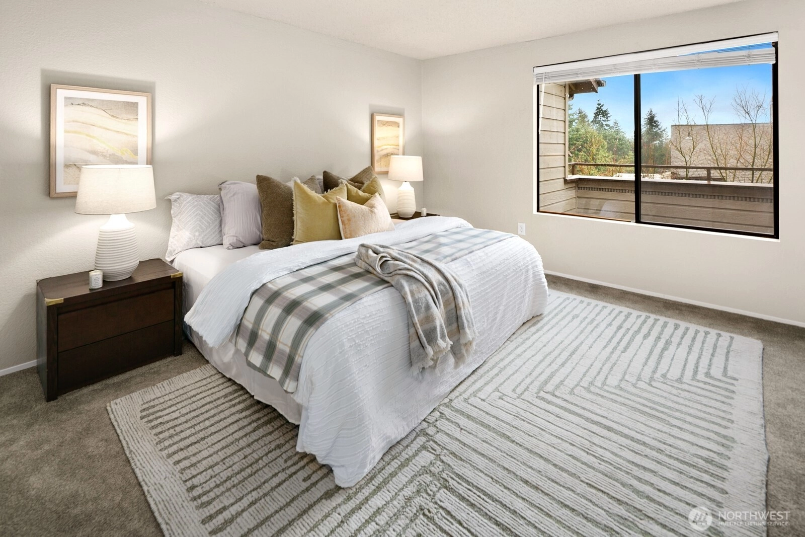Welcome to Sunwood Condos! Rare top-floor, corner unit is move-in ready and filled with natural light. The spacious main living area features a cozy wood-burning fireplace and a built-in bar area—perfect for entertaining. A dedicated dining space includes a charming window seat that creates the ideal reading nook. Large windows throughout fill the home with natural light. The well-appointed kitchen offers generous workspace, ample storage, and a convenient pass-through to the dining area, making it easy to stay connected while cooking or hosting.The spacious primary bedroom includes a private en suite bath and great closet space. A second bedroom provides flexibility for guests, a home office, or hobby room. An additional full bath and laundry closet with extra storage are conveniently located in the hallway.Step outside to your private balcony—perfect for relaxing on warm summer evenings. The unit includes one reserved covered parking space plus plenty of visitor parking. Well-managed HOA with great amenities including a pool, hot tub, tennis courts, and clubhouse. Fantastic location just minutes from Westfield Southcenter Mall, dining, shopping, SeaTac airport and major commuter routes.